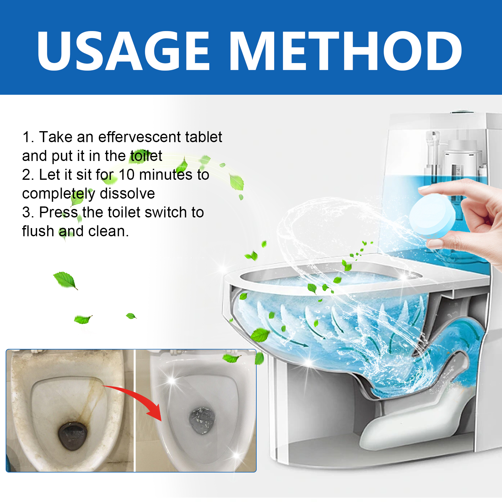 我们的马桶清洁片含有小苏打、柠檬提取物、次氯酸钠。它可以有效去除尿垢、水垢、铁锈等顽固污垢,同时能去除每次冲水时马桶内的恶臭和刺鼻气味。它的使用方法很简单:取一片泡腾片放在马桶里,静置10分钟使其完全溶解,按下马桶开关冲水即可。使用后可以快速去除马桶内的各种污渍,清除马桶内刺鼻气味,高效除菌,让马桶变得干净又卫生。