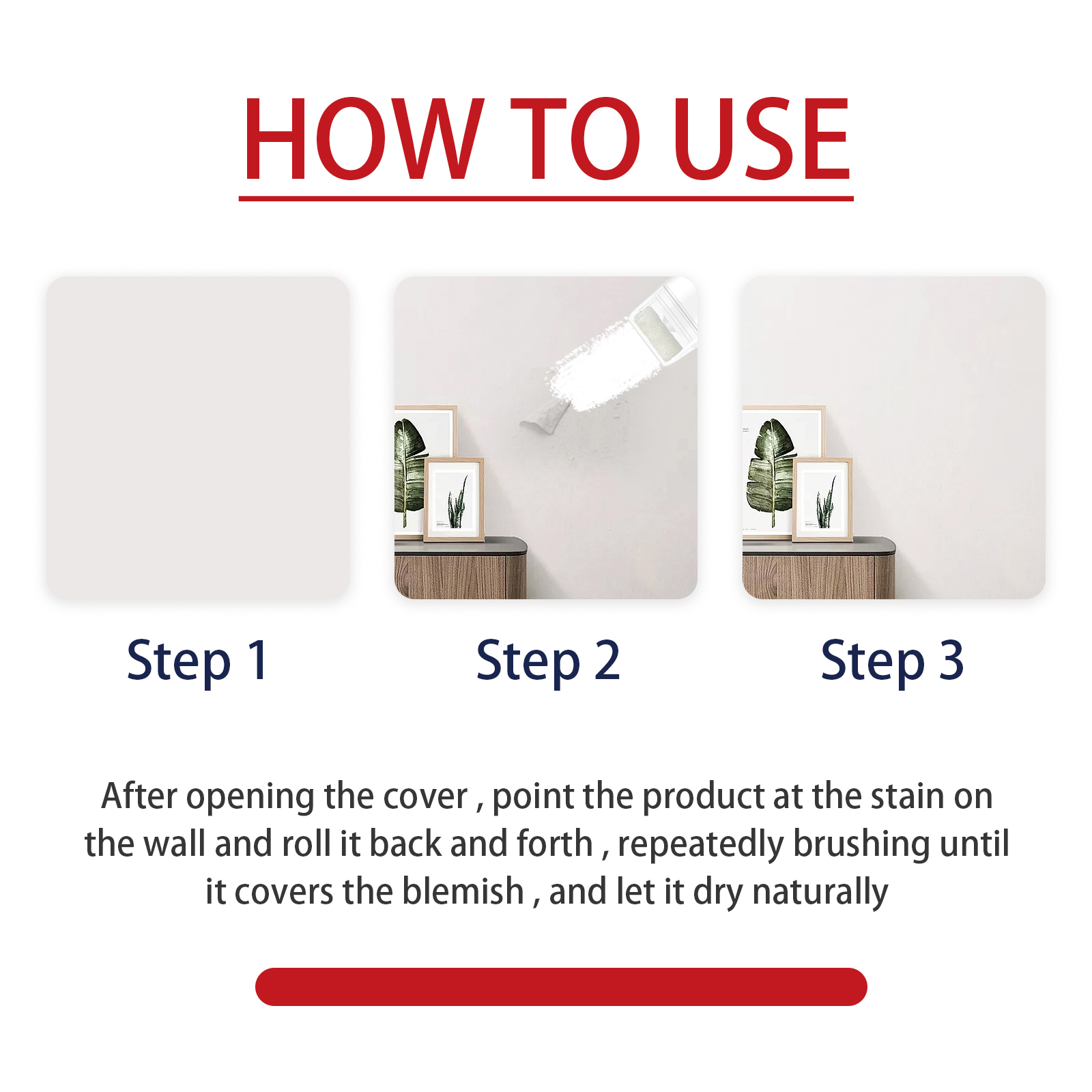 我们的补墙膏含有碳酸钙、氧化钙。它可以有效修复墙壁,帮助您简化墙壁维修,没有留下痕迹,可以无缝地修复各种大小的墙壁;快速干燥时间,更快地修补区域,节省等待时间,适用于各种墙面材料的修补,包括干墙、灰泥、混凝土等。它的使用方法很简单:开盖后,将本品放在墙壁污渍处来回滚动,反复刷洗,直至覆盖瑕疵,任其自然干即可。可以有效修补墙体,不留任何痕迹。