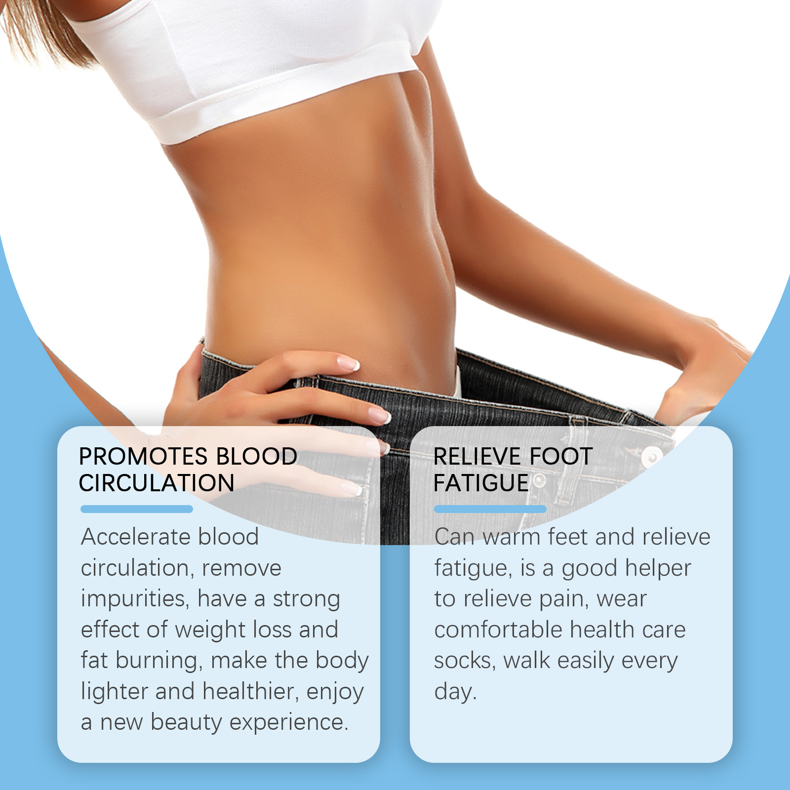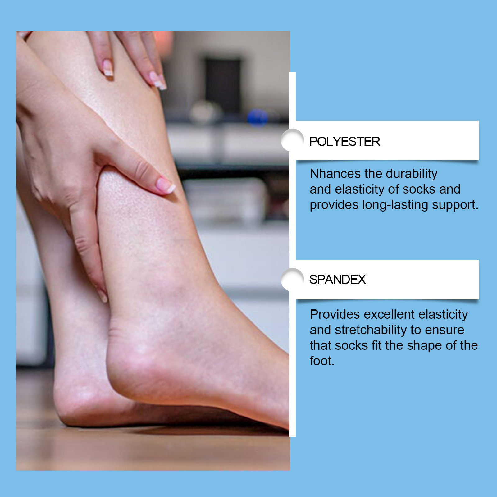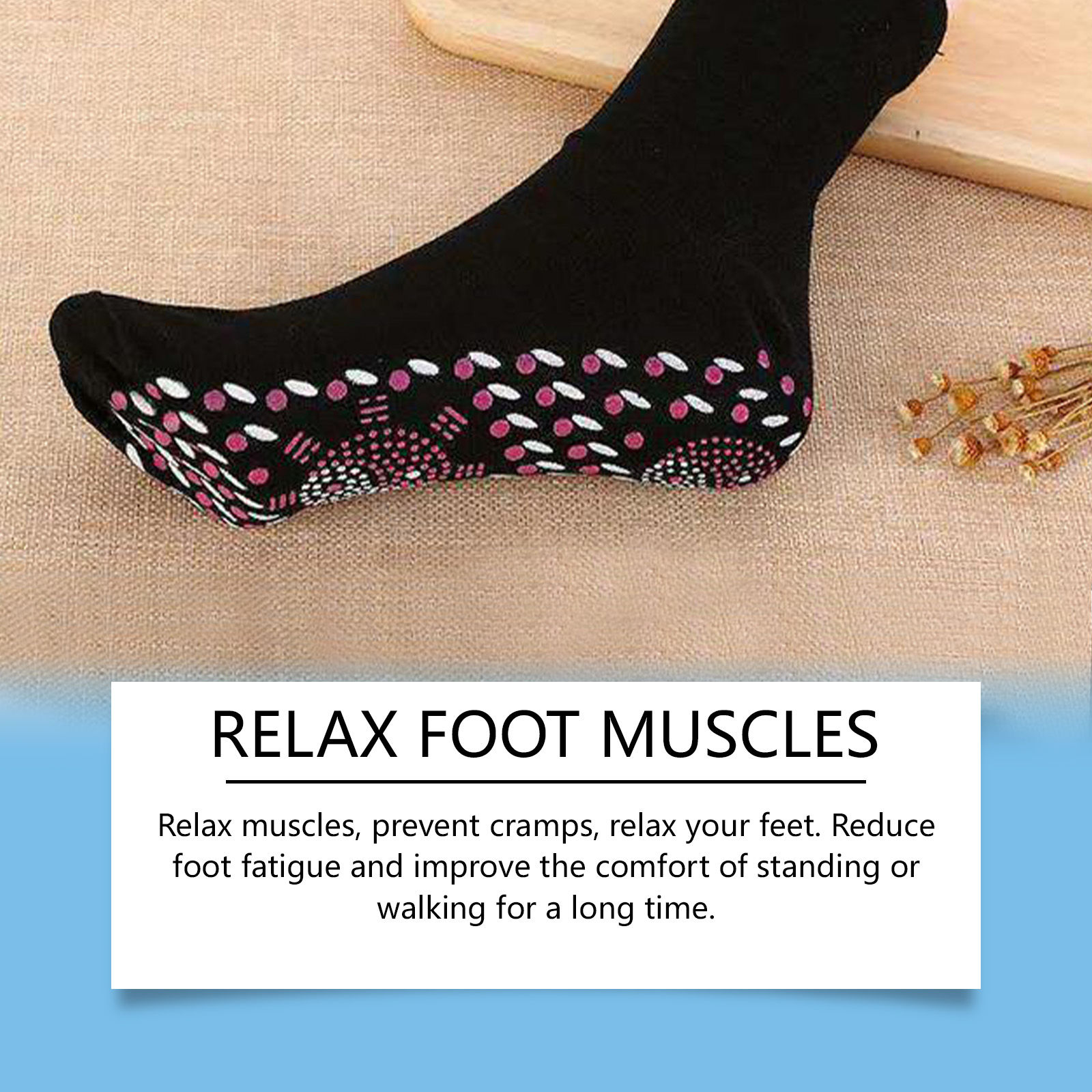 我们的足部护理袜含有涤纶97%、氨纶3%。它可以加速血液循环,去除杂质,具有强烈的减肥和燃烧脂肪的效果,使身体更轻盈更健康,享受全新的美丽体验。可以暖脚和缓解疲劳是缓解疼痛的好帮手,穿上舒适的保健袜,每天轻松行走。它的使用方法很简单:将袜子穿在脚上即可。并且可以放松肌肉,预防抽筋,放松你的脚。减轻脚部疲劳,提高长时间站立或行走的舒适度。