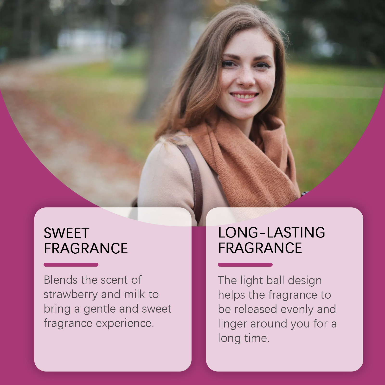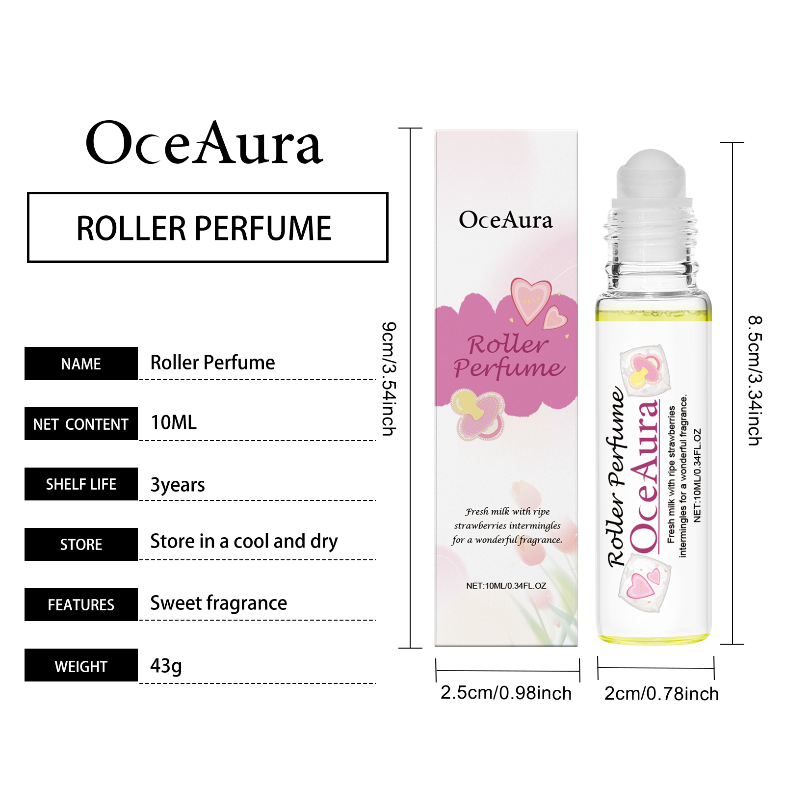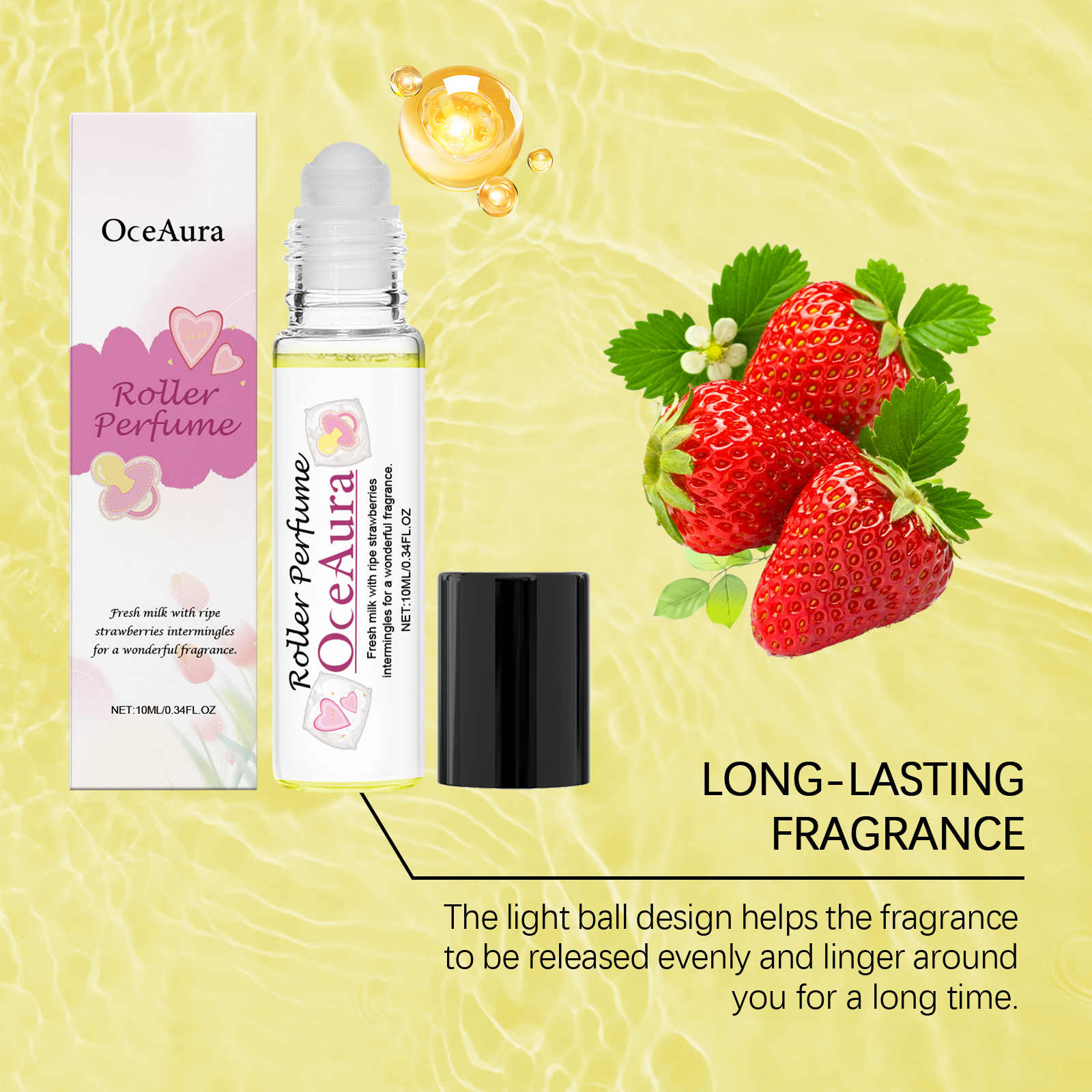 我们的女士滚珠香水含有PEG-40氢化蓖麻油、草莓果实提取物。它融合了草莓和牛奶的香气,带来温和甜美的芳香体验。光球设计有助于均匀释放香气,并在您周围停留很长时间。它的使用方法很简单:首先彻底清洁并干燥皮肤轻轻地在手腕脖子后面、耳朵后面和膝盖后面滚动产品,等待香气挥发。并且甜美的草莓牛奶香气,温柔浪漫,展现个人魅力。