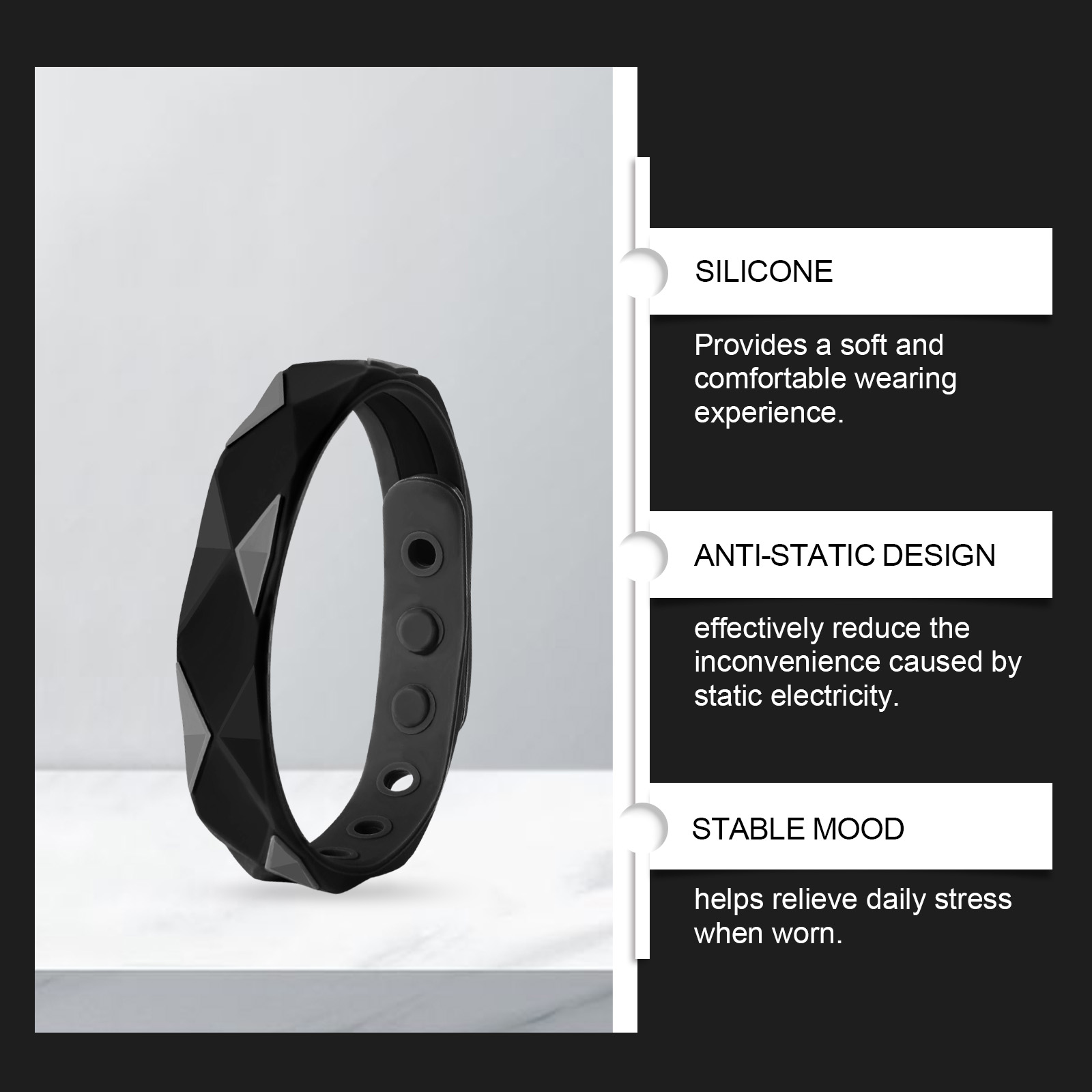 我们的身体硅胶腕带含有硅胶。它可以有效释放静电,保护电子设备安全,无忧工作和生活,安全守护每一刻。穿着舒适,减少静电干扰,营造安静的氛围,帮助你平静和放松。它的使用方法很简单:将该产品戴在手腕上并调整到舒适的位置。并且可以改善睡眠环境,减少静电影响,增强积极心态拥有一夜好眠,迎接更美好的明天。