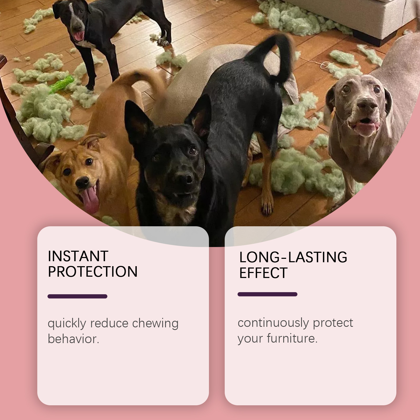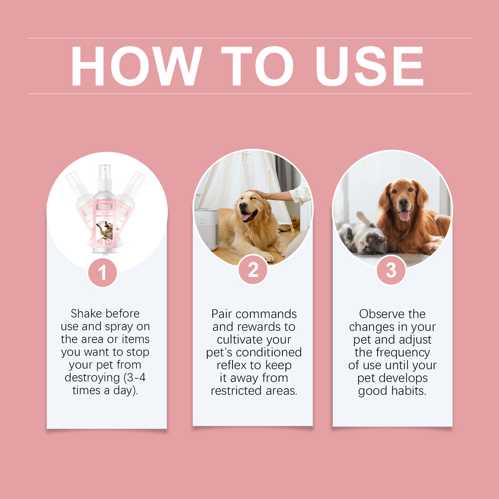 我们的狗狗防咀嚼喷雾含有甘油、透明质酸、薄荷提取物。它可以快速减少咀嚼行为。它的使用方法很简单:持续保护您的家具。使用前摇匀,喷在你想阻止宠物破坏的区域或物品上(每天3-4次)。配对命令和奖励来培养宠物的条件反射,使其远离限制区域。并且可以观察宠物的变化,调整使用频率,直到宠物养成好习惯。