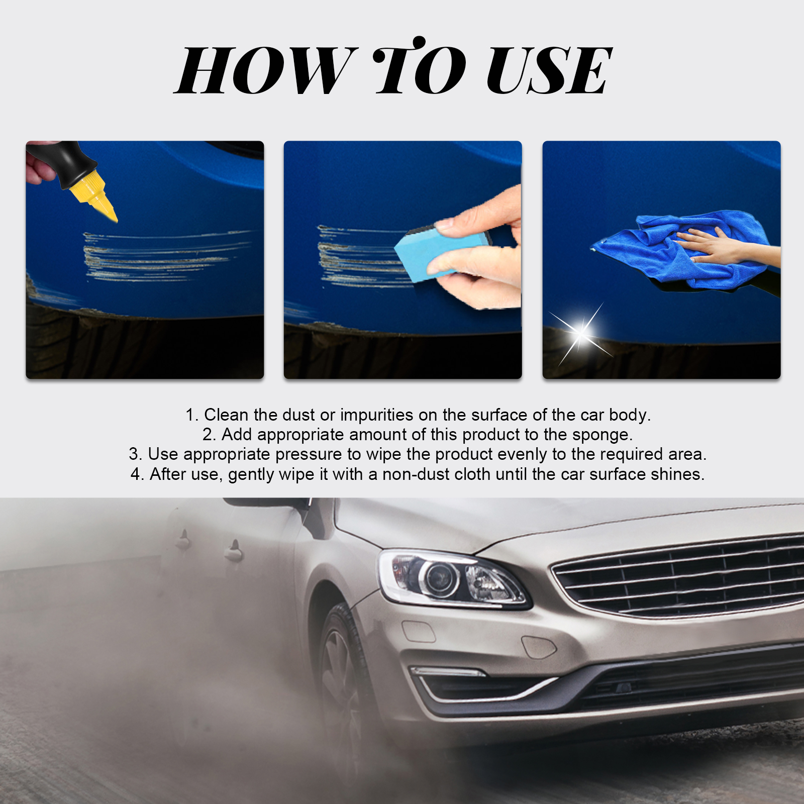 我们的汽车划痕修复液含有去离子水、纳米硅、甲基硅油。它可以修复表面的划痕,提亮汽车漆面,使汽车焕然一新。它的使用方法很简单:先清洁车身表面的灰尘或杂质,然后海绵中加入适量本品,用适当的力气将本品均匀擦拭至所需区域,使用后,用无尘布轻轻擦拭,直到车表面发亮即可。使用后有效去除划痕,持久的修复,防止损坏因素,如雨,盐和灰尘,同时也防止过早老化,褪色和开裂,为你的汽车提供了一层保护涂层。