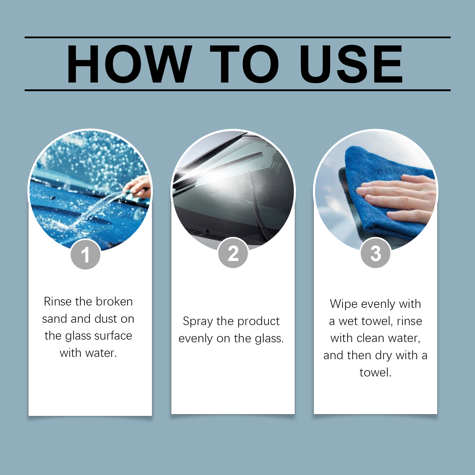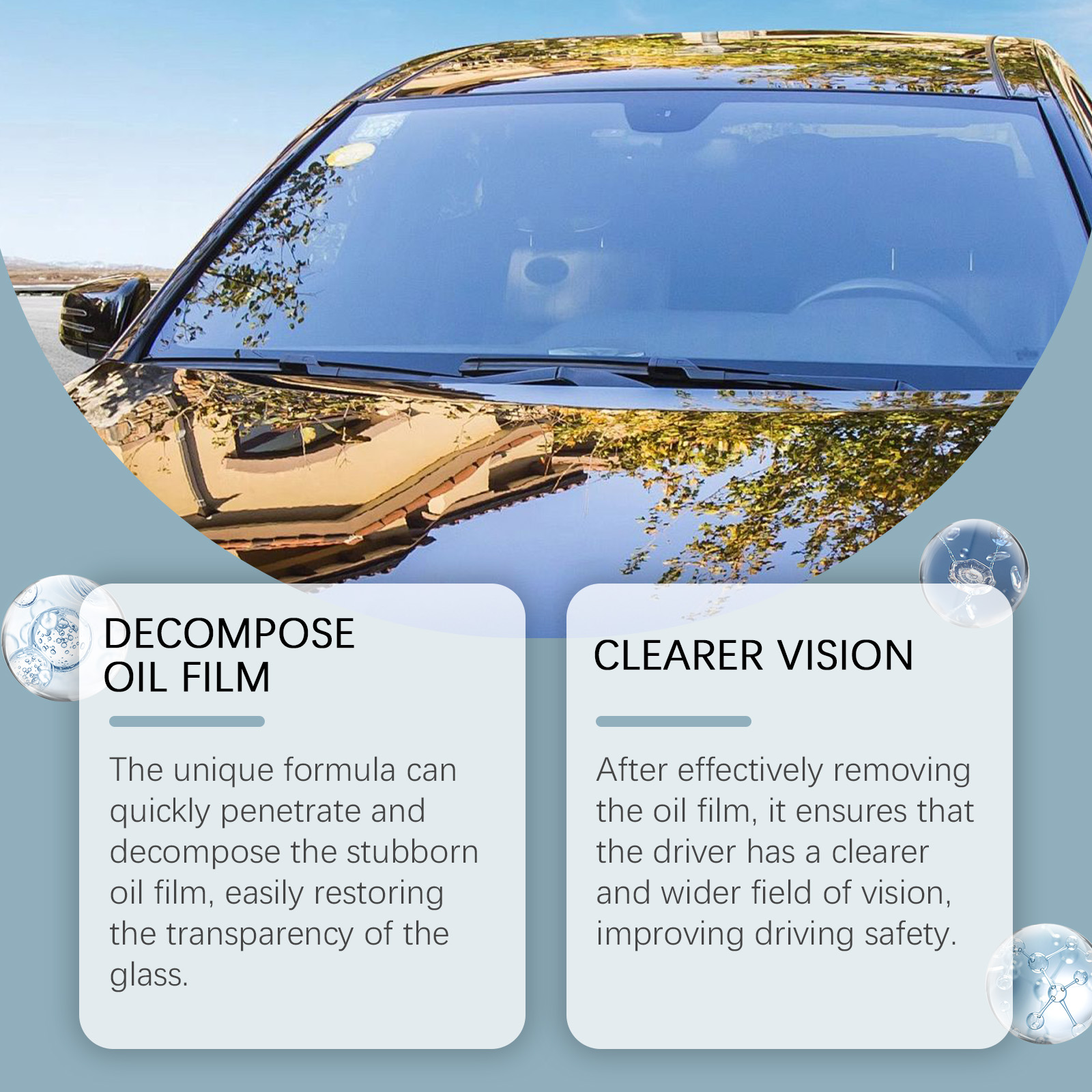 我们的玻璃痕迹清除剂含有丙二醇甲醚、硅酸钠。它可以快速渗透并分解顽固的油膜,轻松恢复玻璃的透明度。它的使用方法很简单:用水冲洗玻璃表面上的碎沙和灰尘。将产品均匀地喷在玻璃上。用湿毛巾均匀擦拭,用清水冲洗,然后用毛巾擦干。并且可以在有效去除油膜后,它确保了驾驶员有更清晰和更广阔的视野,提高了驾驶安全性。