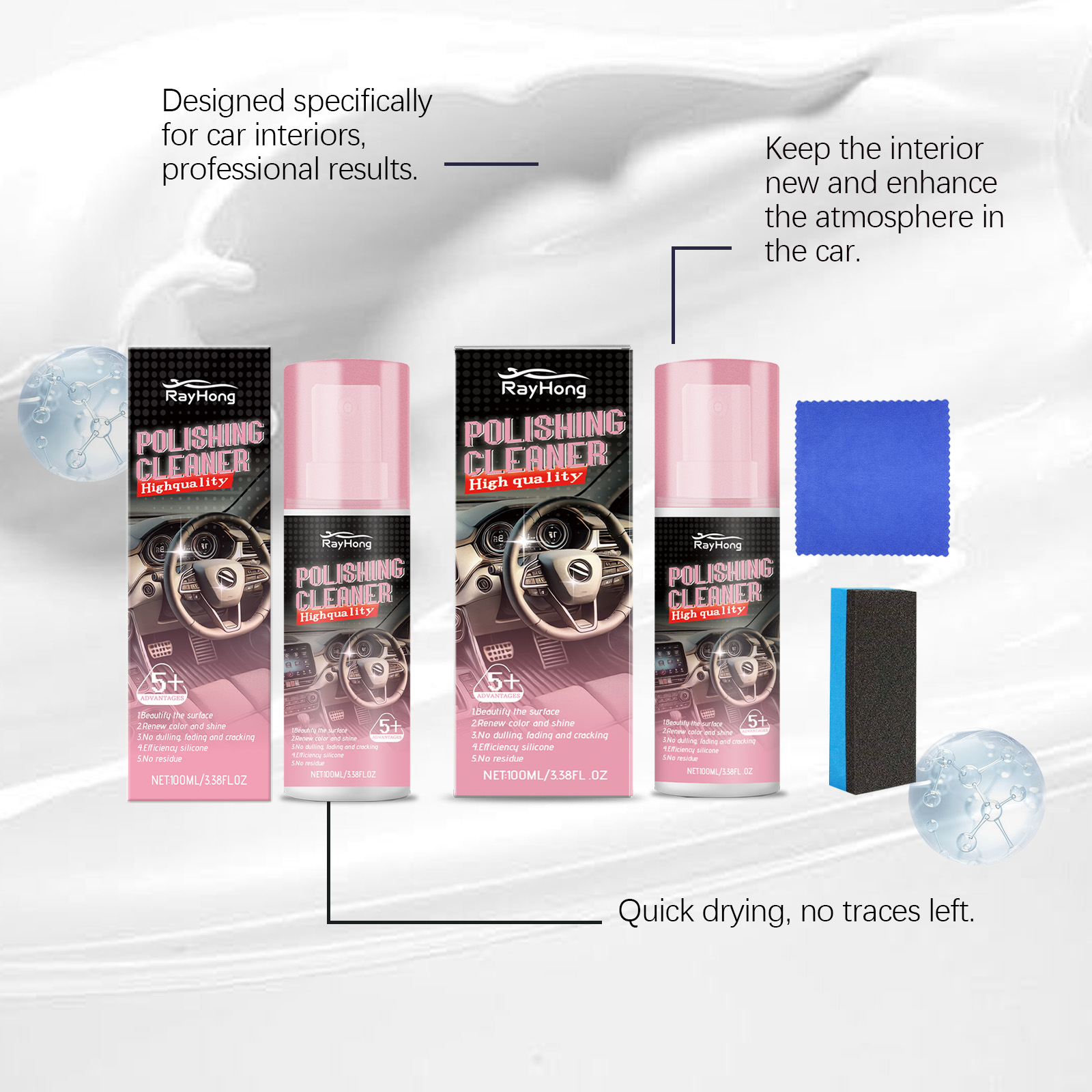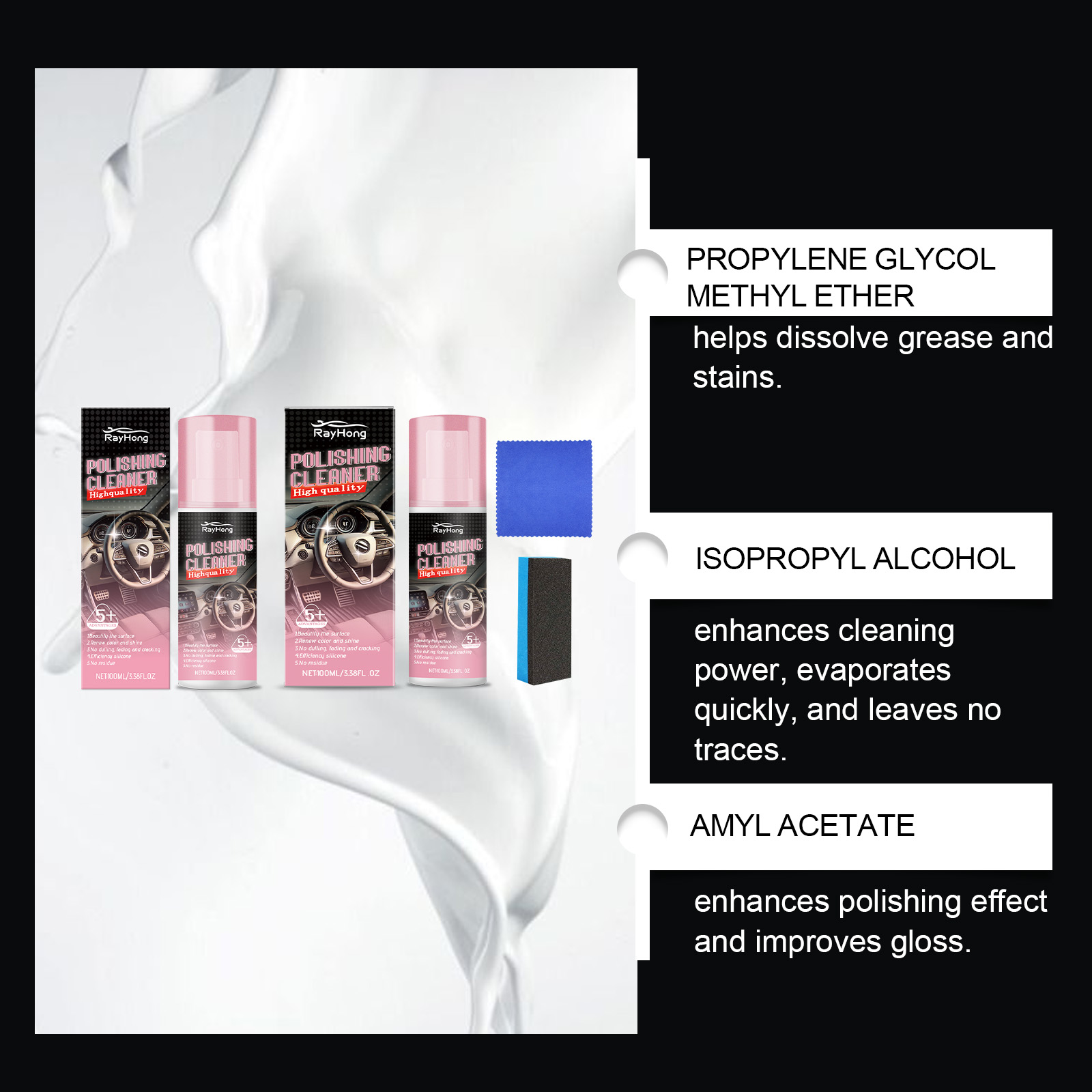 我们的汽车内饰抛光剂(含工具)含有丙二醇甲醚、异丙醇、乙酸戊酯。它可以快速去除内饰表面的污渍。它的使用方法很简单:确保清洁表面没有杂质,使用前摇匀。将产品均匀地喷在汽车需要打蜡的区域。等待3-5分钟,然后擦拭表面,直到表面光滑。并且可以提供持久的光泽保护。