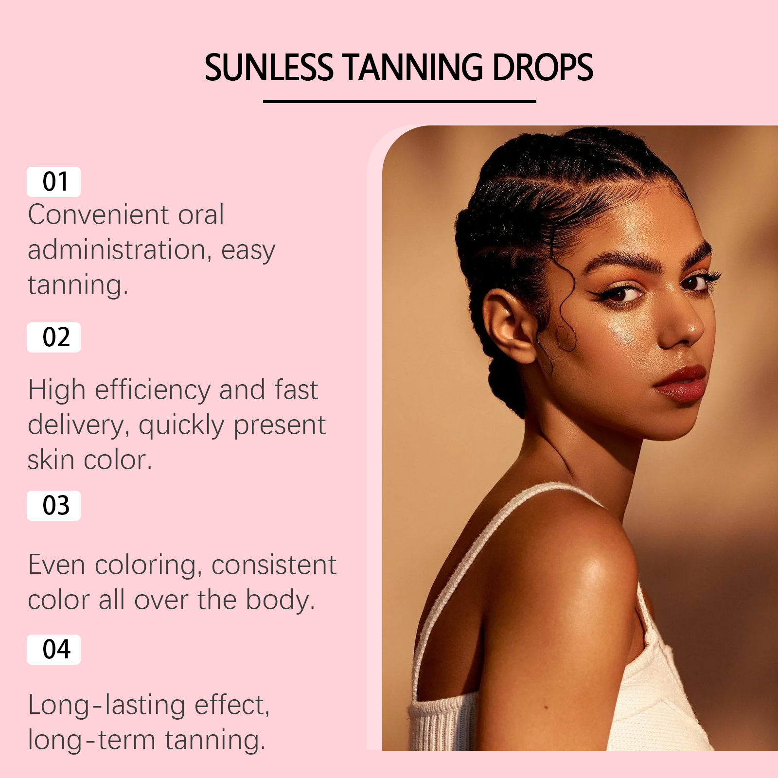 我们的免晒美黑滴剂含有薄荷叶提取液、中药提取物、 葡萄糖酸内脂。它可以调节身体,改善状况。它的使用方法很简单:请在服用前摇匀,每次1-2滴,每天1-2次。并且可以根据需要调整皮肤颜色深度。