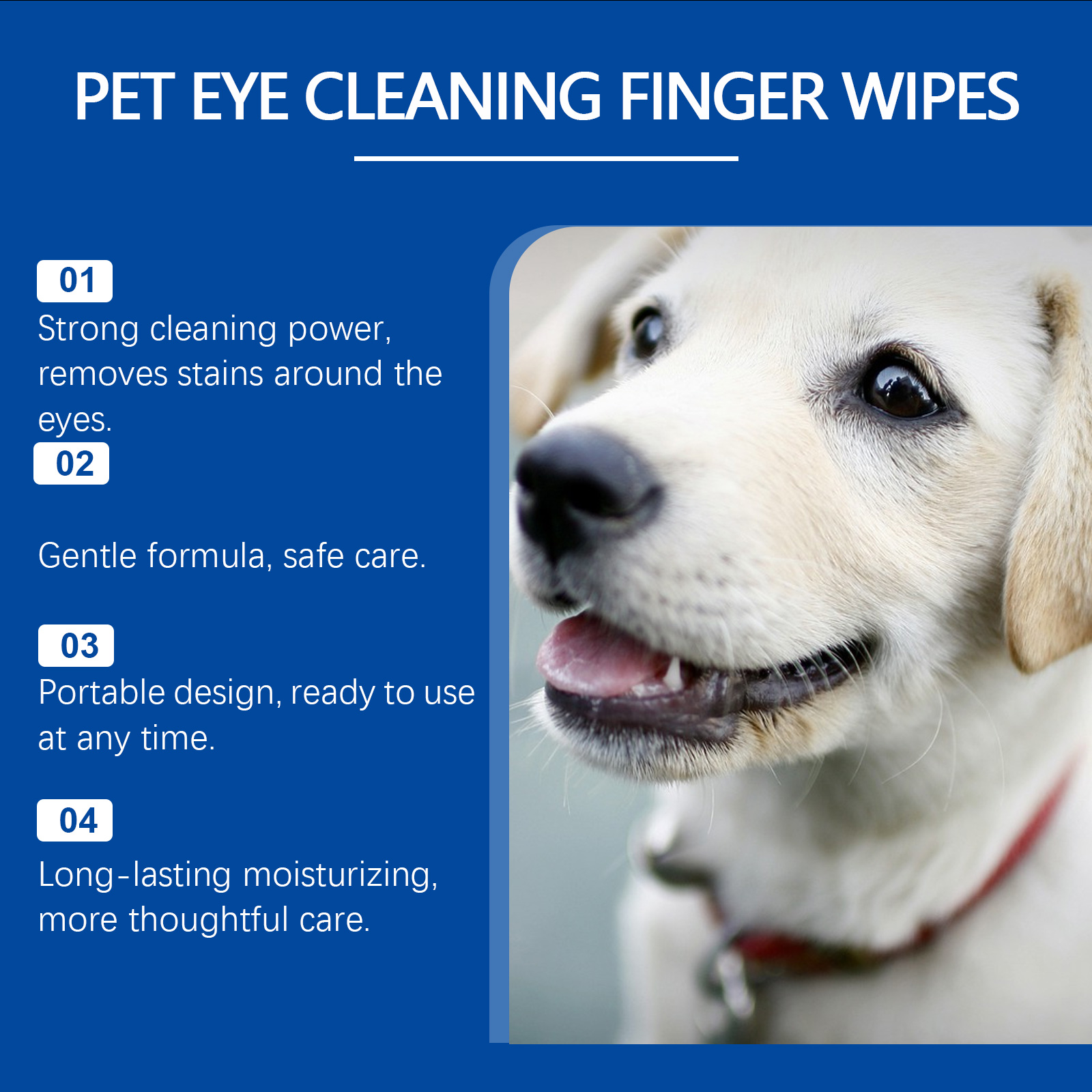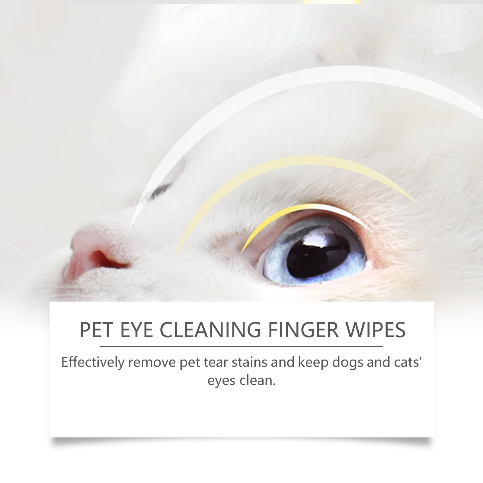 我们的宠物眼部清洁手指湿巾,由山梨(糖)醇、透明质酸钠精心调配而成。专为宠物眼睛设计温和有效。指套的设计,让使用更方便。使用方法极为便捷:取出清洁手指垫并将其放在上面。轻轻擦拭宠物的眼睛和眼睛周围的皮肤。当清洁完成后只需丢弃手指垫。并且可以有效去除宠物泪痕,保持狗狗和猫咪眼睛清洁。