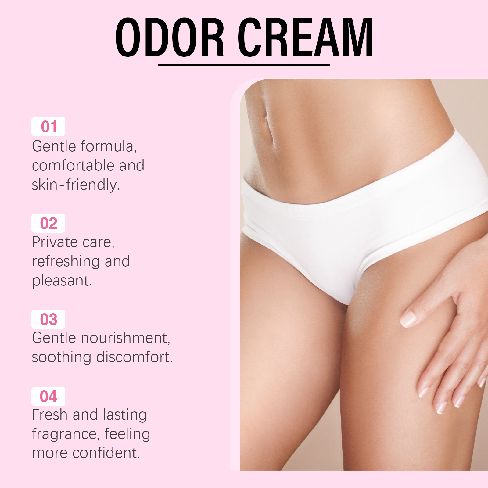 我们的女性舒缓护理霜,由薄荷叶、积雪草提取物、透明质酸精心调配而成。专为增强清新感,保持舒适状态设计。使用方法极为便捷:清洁皮肤并保持干燥,将适量的本品均匀涂抹在私处皮肤上,按摩至吸收。并且全天舒适相伴,适合外出和运动时的个人护理。