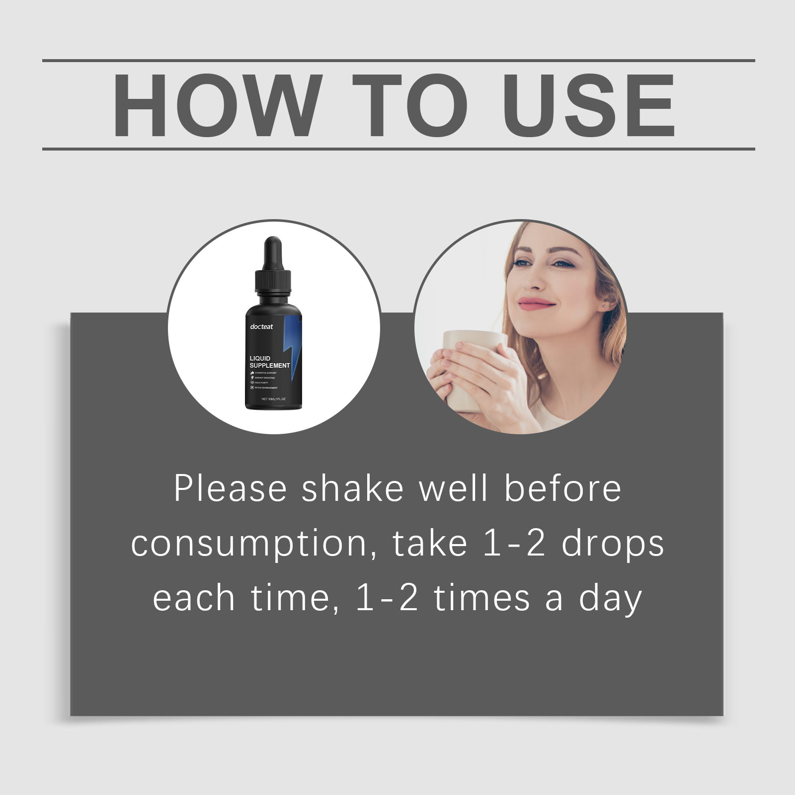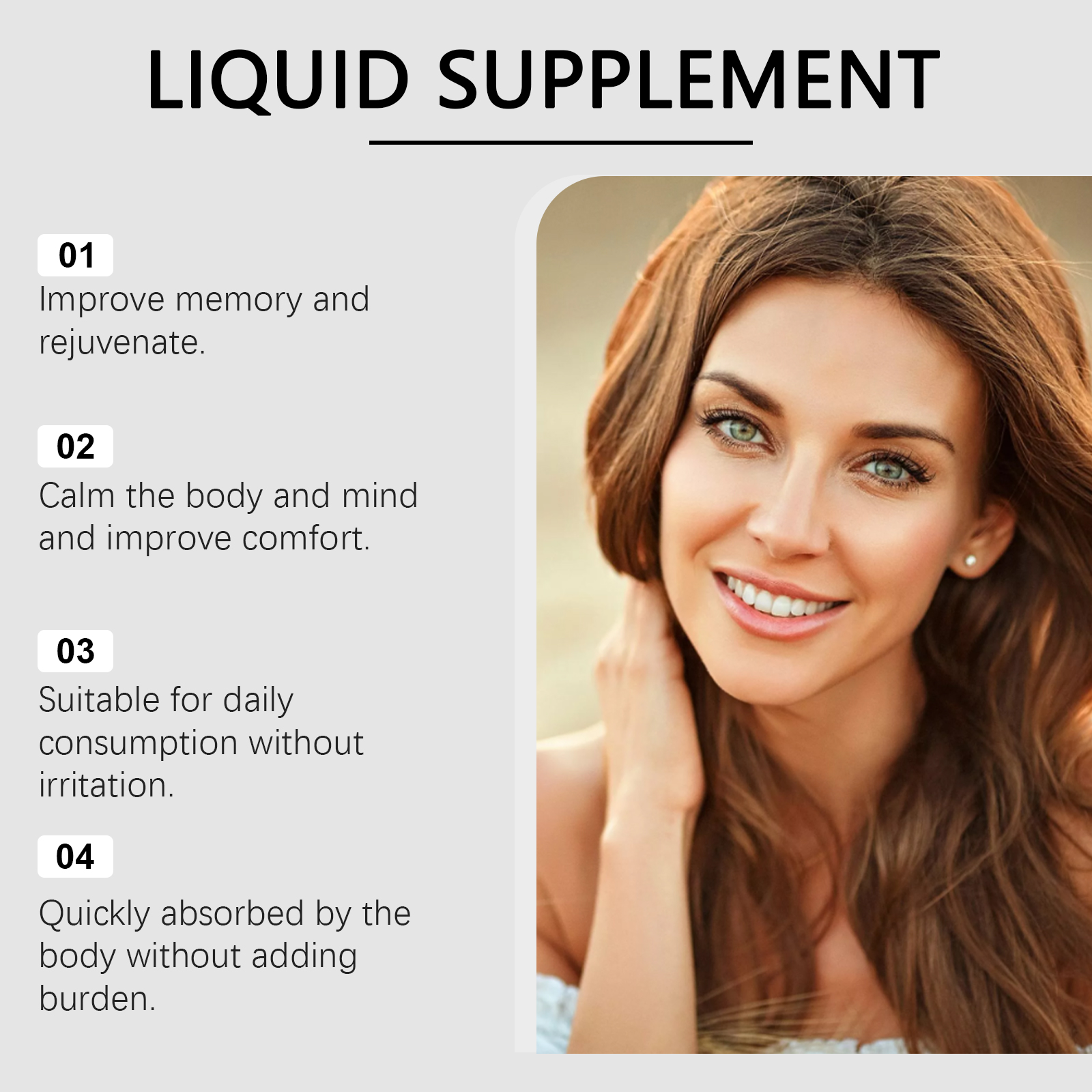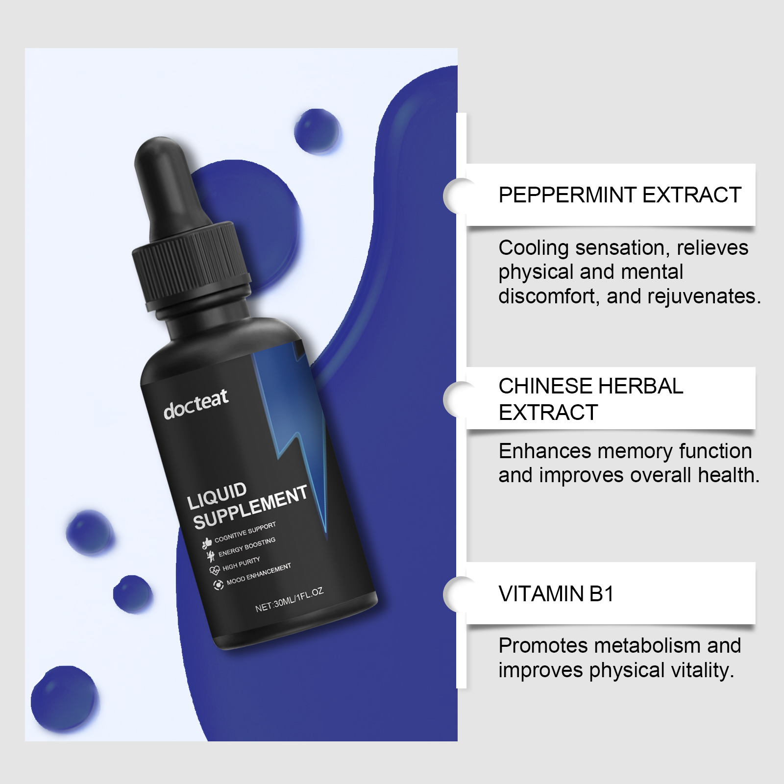 我们的身体护理补充滴剂,由薄荷提取液、中药提取物、葡萄糖酸内脂精心调配而成。专为提高记忆力并焕发活力设计。使用方法极为便捷:请在服用前摇匀,每次1-2滴,每天1-2次。并且可以平静身心,提高舒适度。