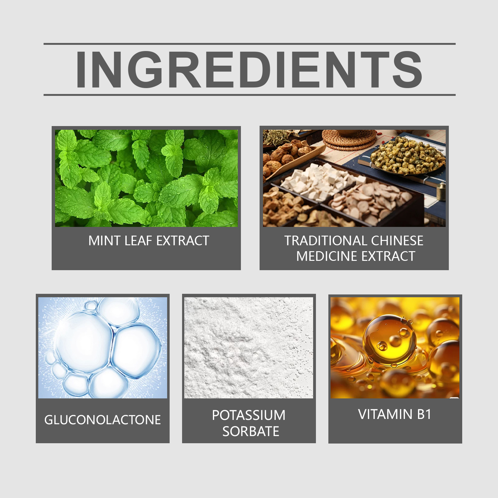 | 成分 | 薄荷提取液、中药提取物、葡萄糖酸内脂 |