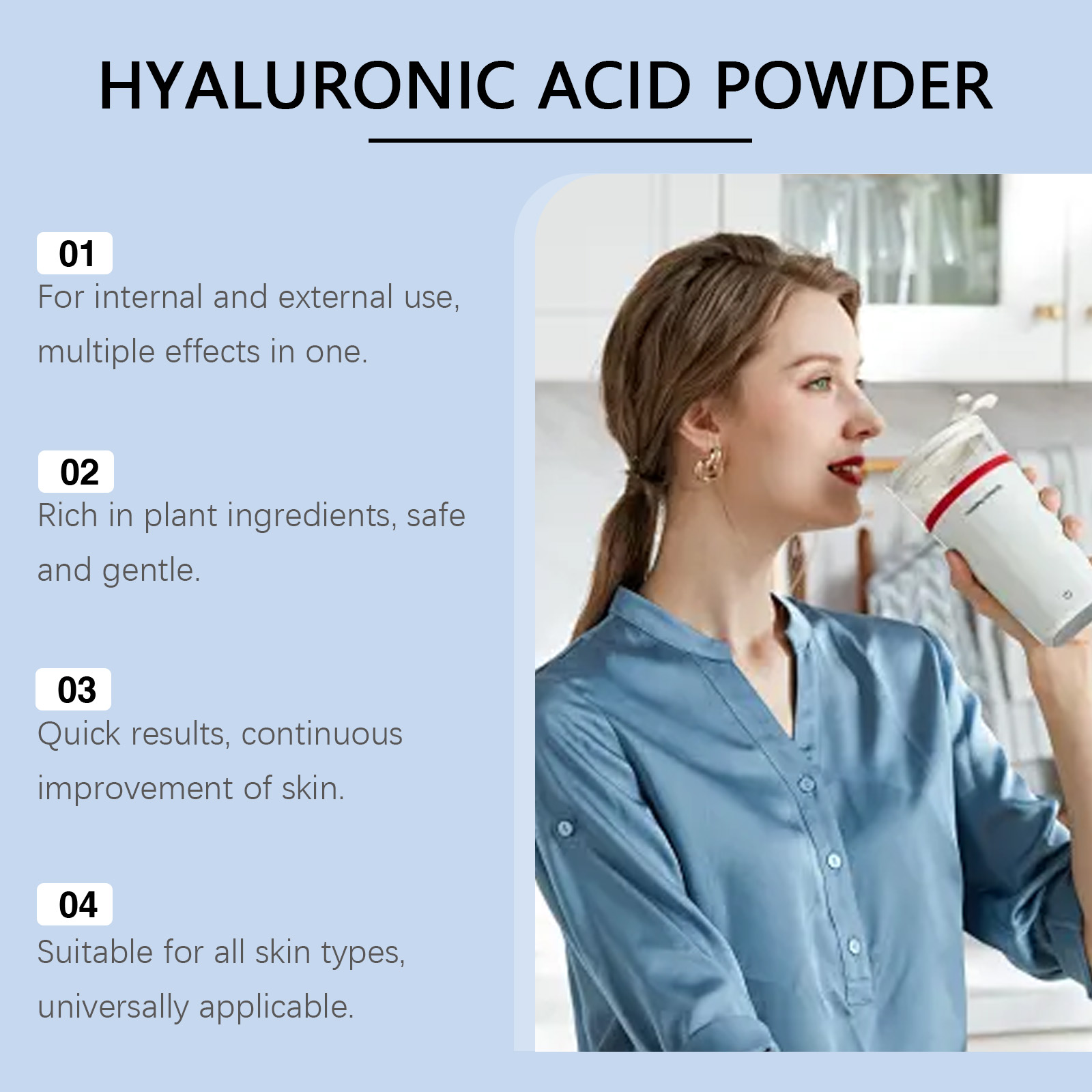 我们的透明质酸蛋白粉,由红豆粉、脱脂乳粉、红枣粉精心调配而成。专为内部使用提供营养,为外部使用修复皮肤设计。使用方法极为便捷:取适量本品,用温水调匀。搅拌直至完全溶解。每天喝一次,或者将溶液冷藏直到变成凝胶,然后将其涂抹在皮肤上。并且可以选择植物原料来补充日常需求。