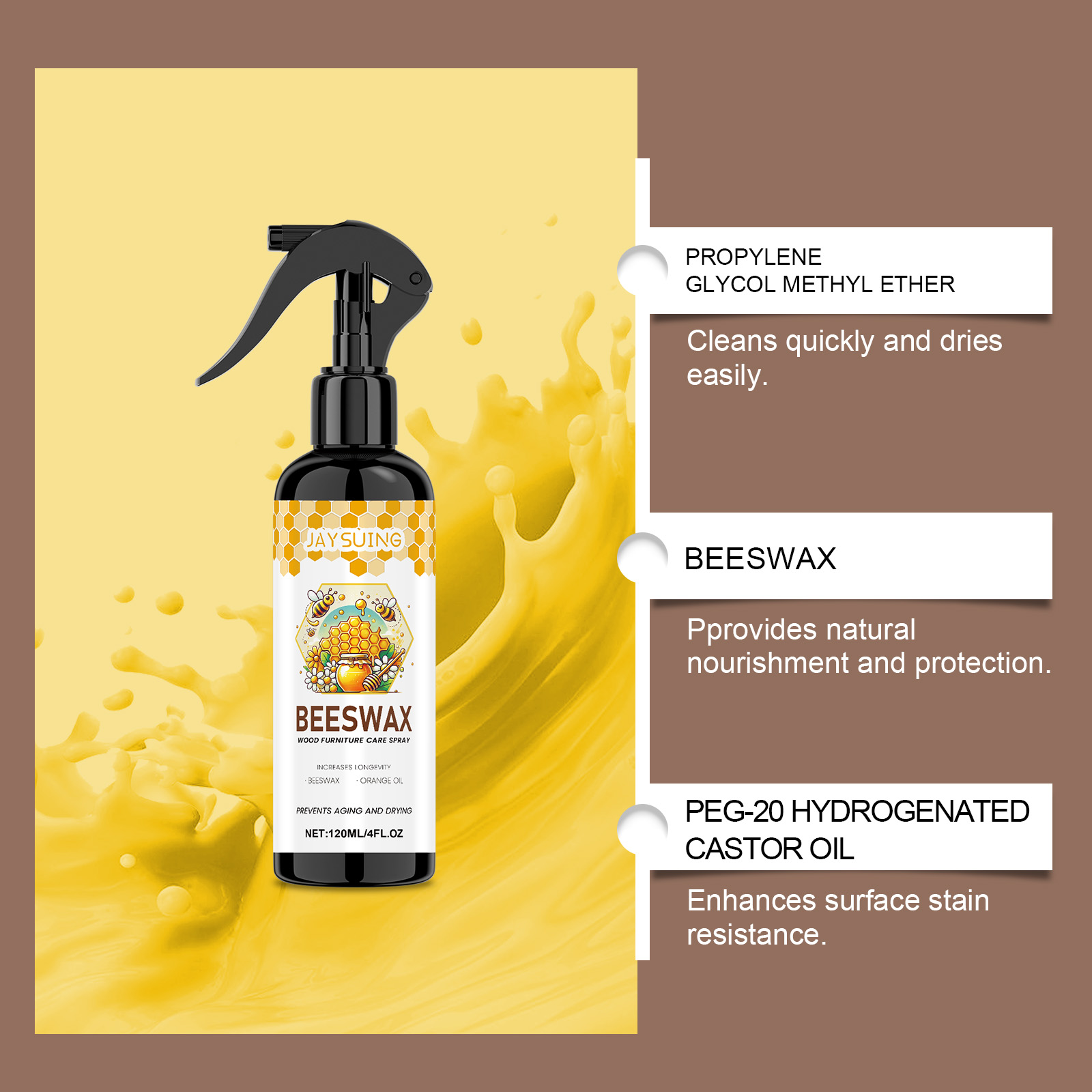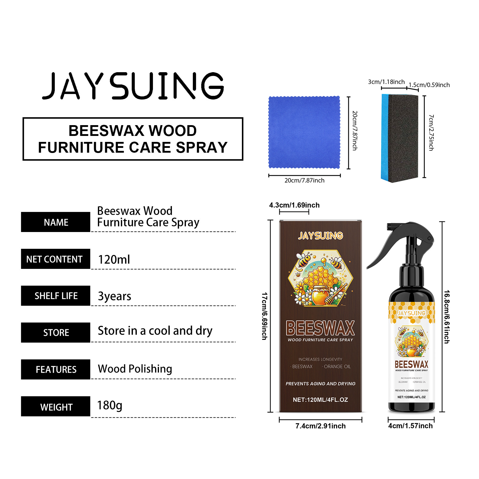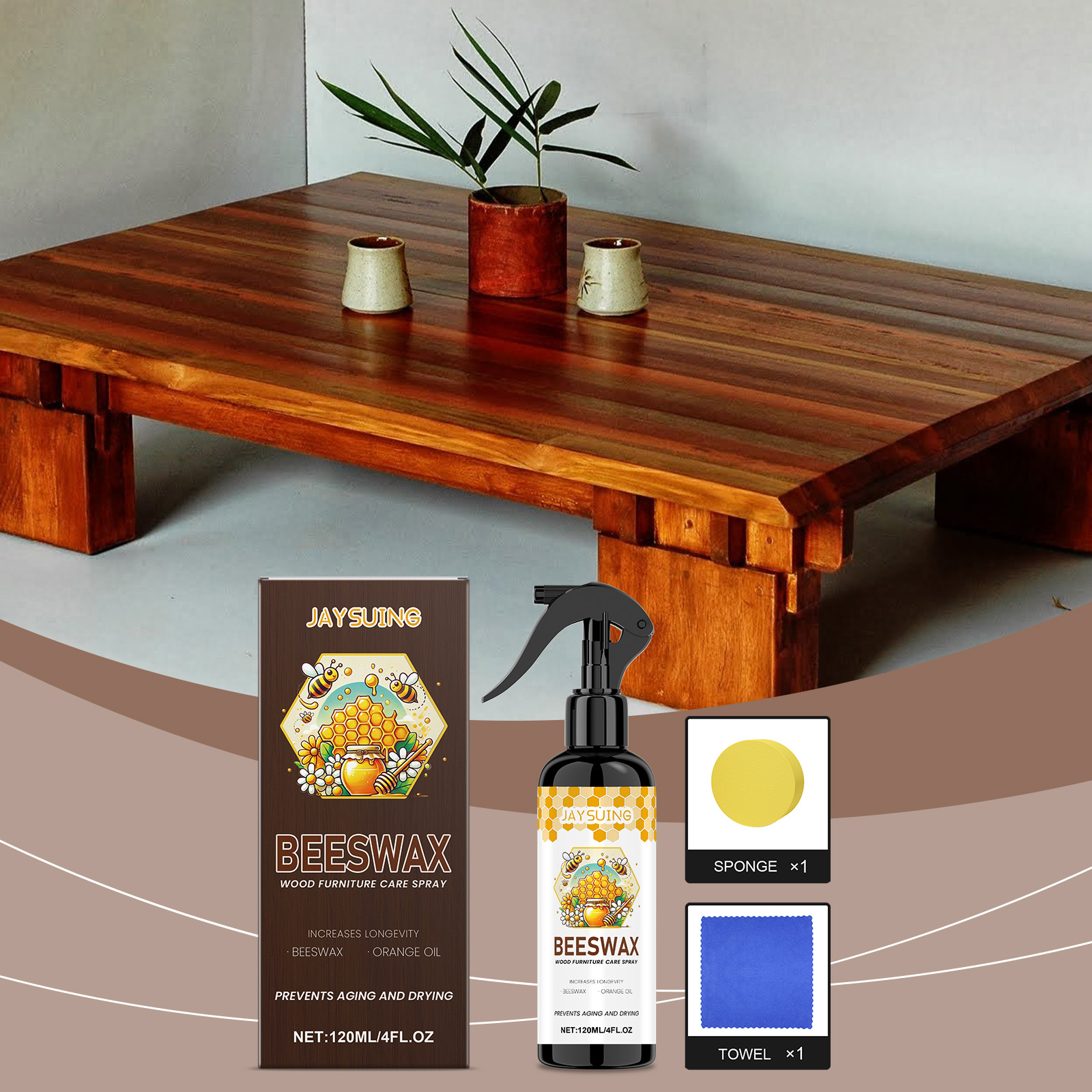 我们的蜂蜡木质家具护理抛光剂,由乙酸戊酯、蜂蜡、橙皮油精心调配而成。专为深层去除多年来积累的蜡沉积物和顽固污渍设计。使用方法极为便捷:清洁家具的表面。将产品均匀地喷在家具表面。使用海绵沿着木材纹理的方向以打圈方式轻轻均匀地擦拭家具。让它静置3分钟以充分反应,然后用毛巾擦至半透明。并且可以恢复木材光泽并形成一个保护膜。