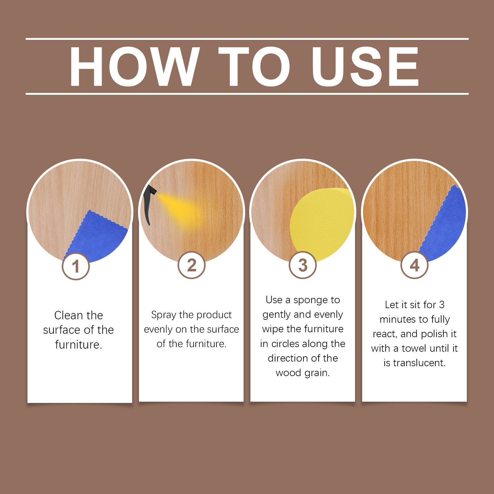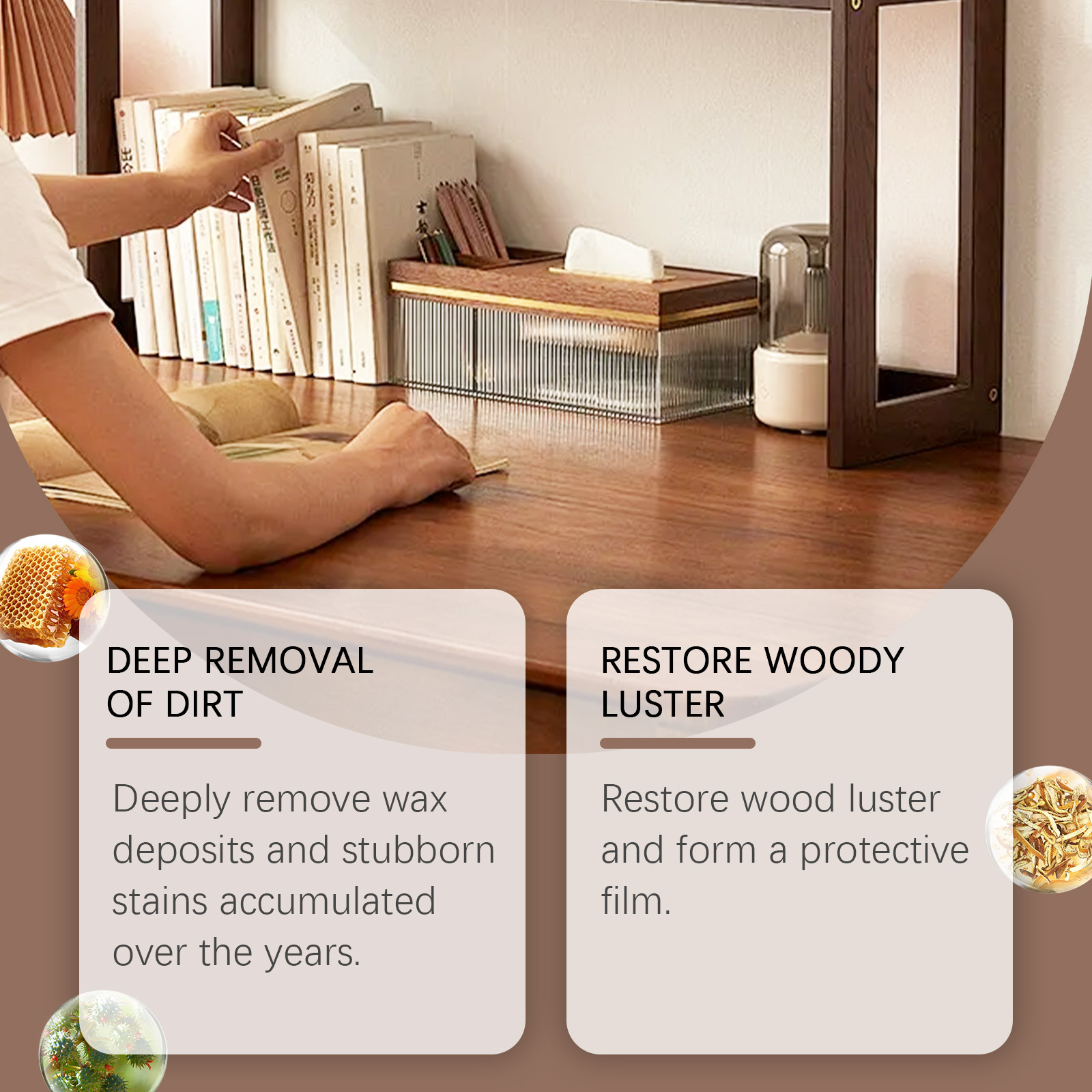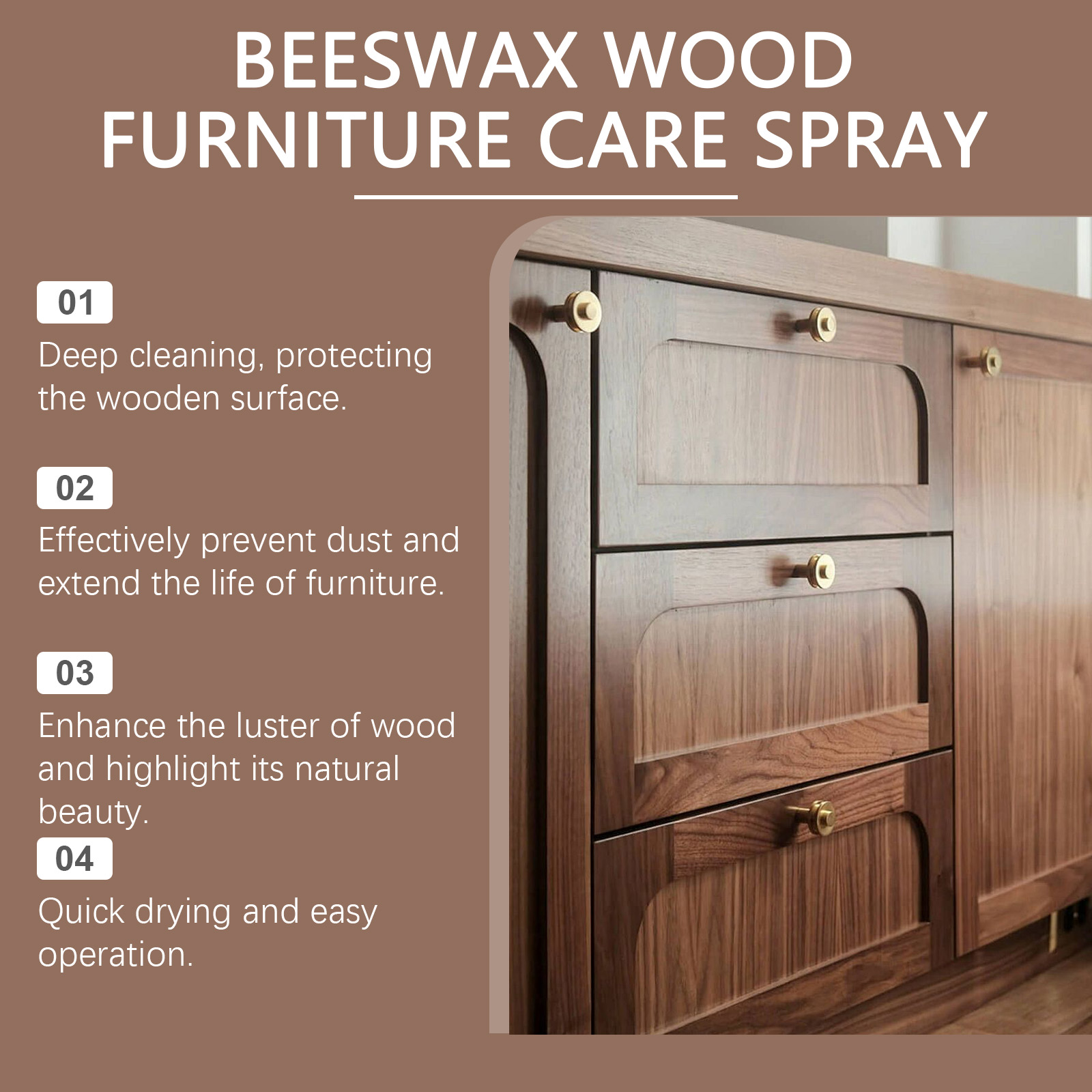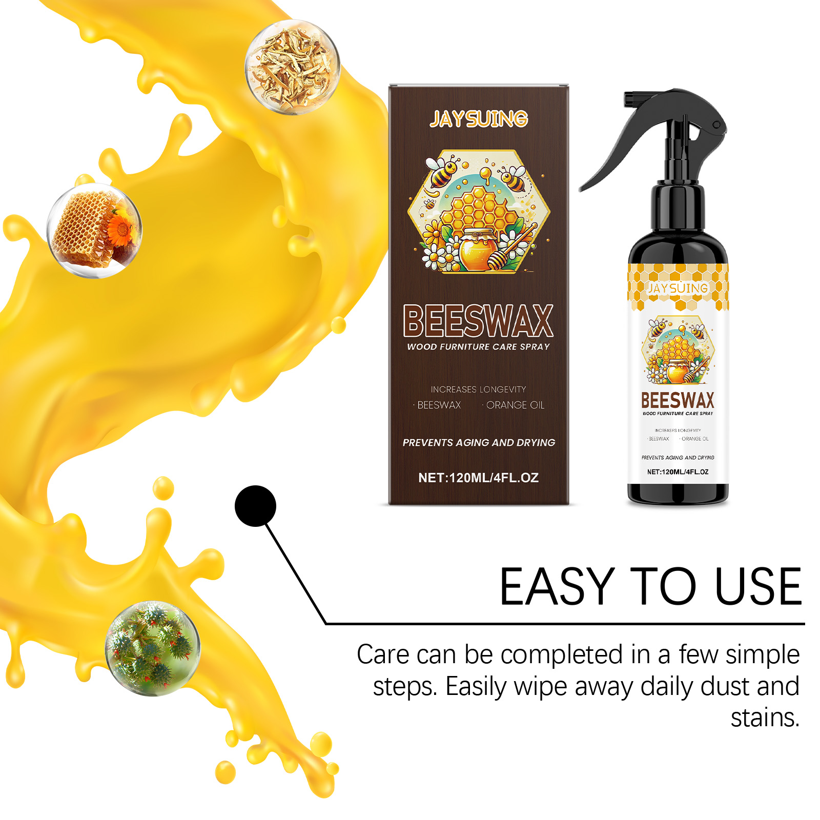 我们的蜂蜡木质家具护理抛光剂,由乙酸戊酯、蜂蜡、橙皮油精心调配而成。专为深层去除多年来积累的蜡沉积物和顽固污渍设计。使用方法极为便捷:清洁家具的表面。将产品均匀地喷在家具表面。使用海绵沿着木材纹理的方向以打圈方式轻轻均匀地擦拭家具。让它静置3分钟以充分反应,然后用毛巾擦至半透明。并且可以恢复木材光泽并形成一个保护膜。