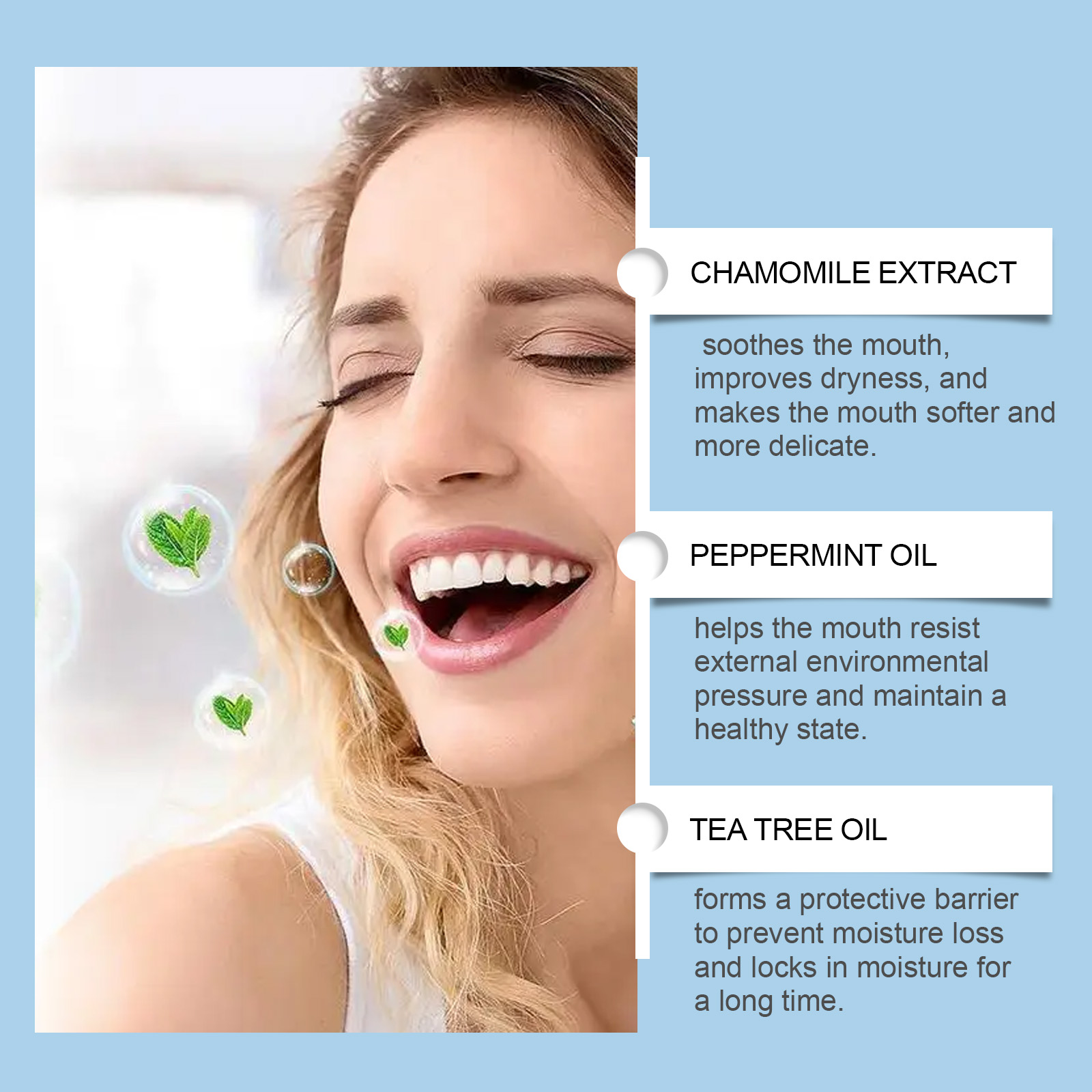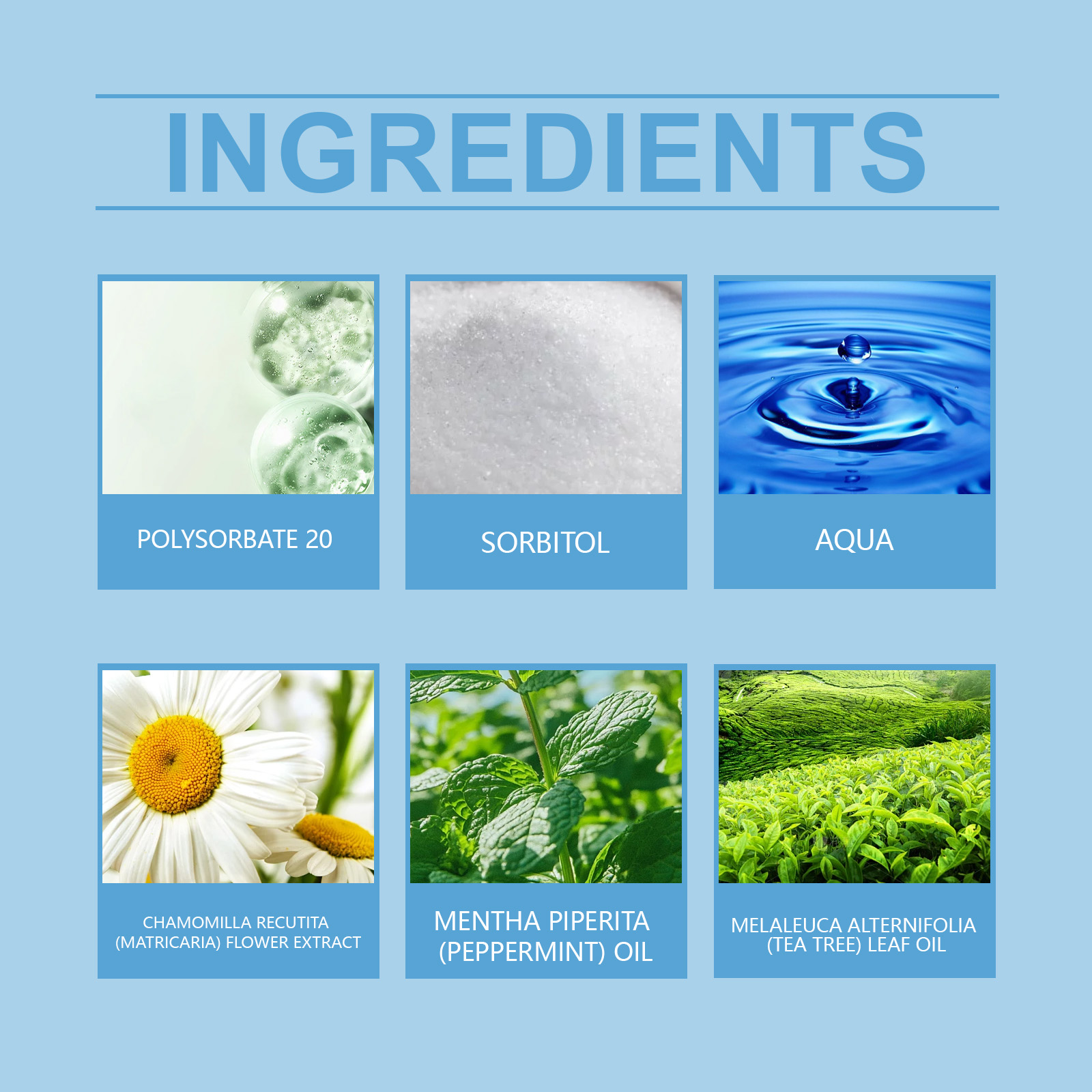 | 成分 | 洋甘菊提取物、薄荷油、茶树油 |
