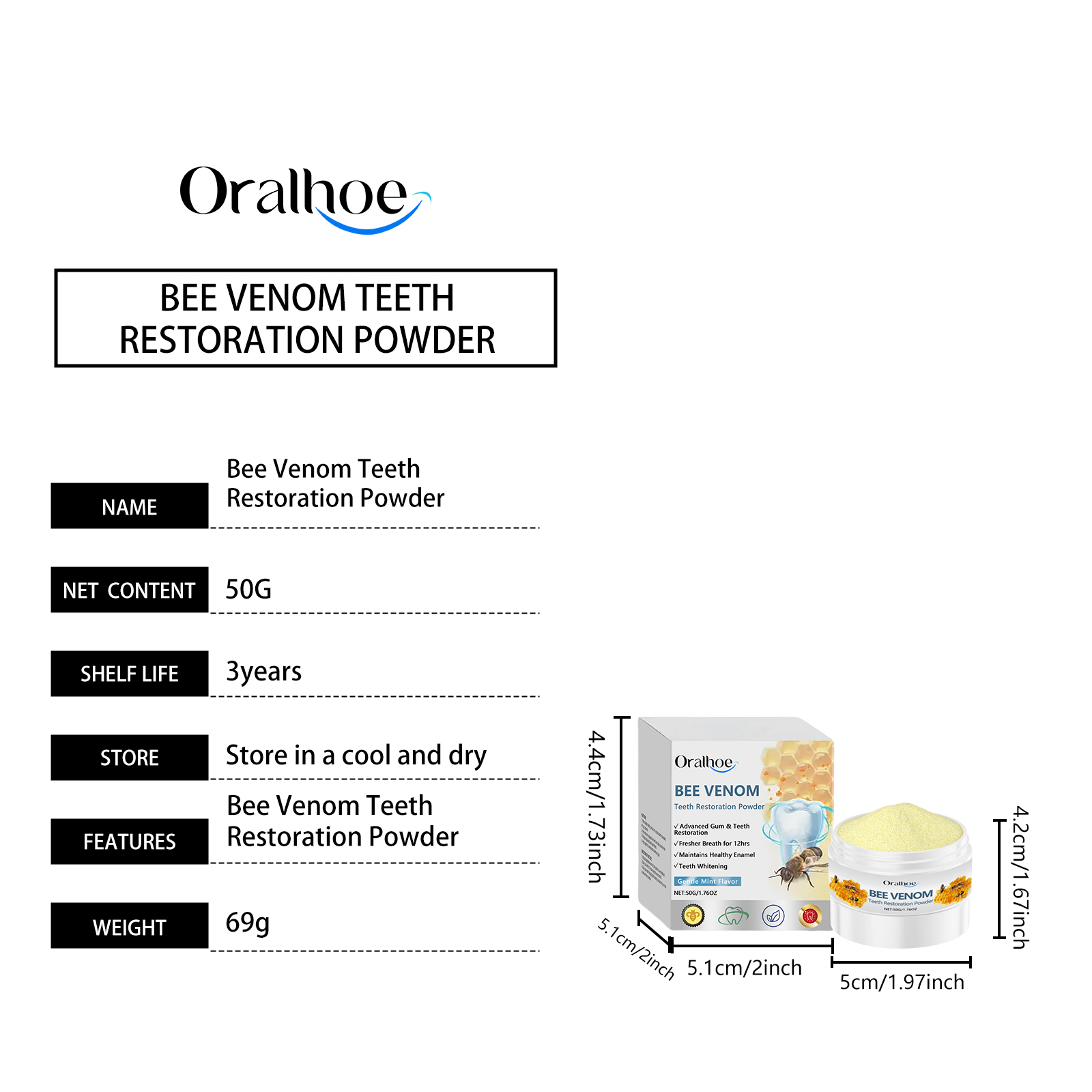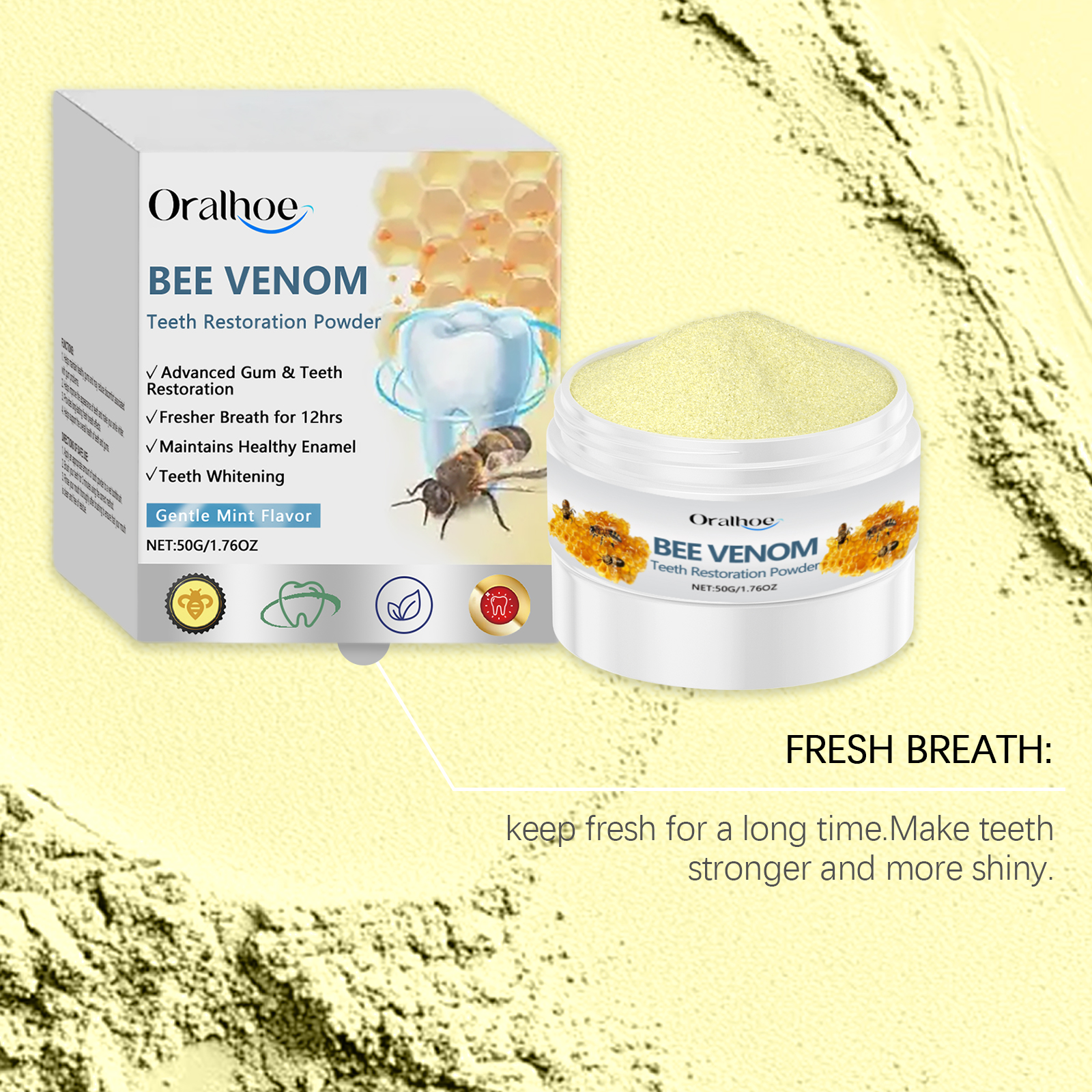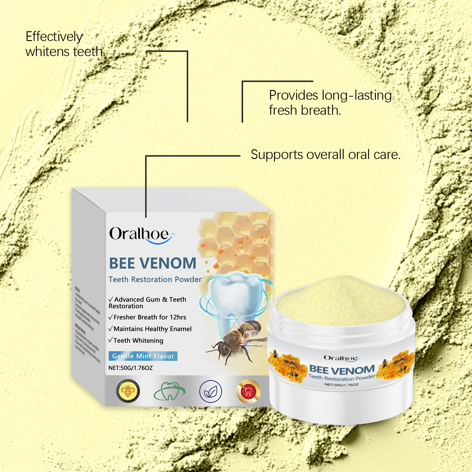 Oralhoe Bee Venom Care Dental Powder, Gingiva Lasting Fresh Breath Clean Teeth Mild Ingredients Oral Care