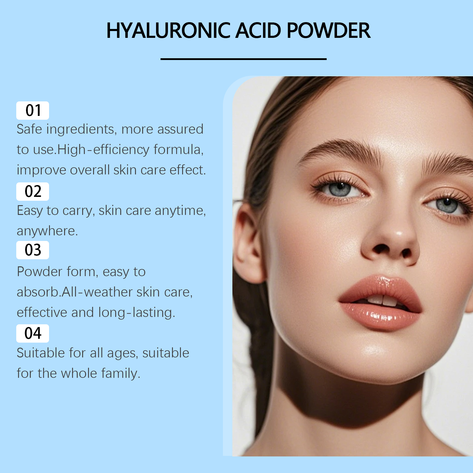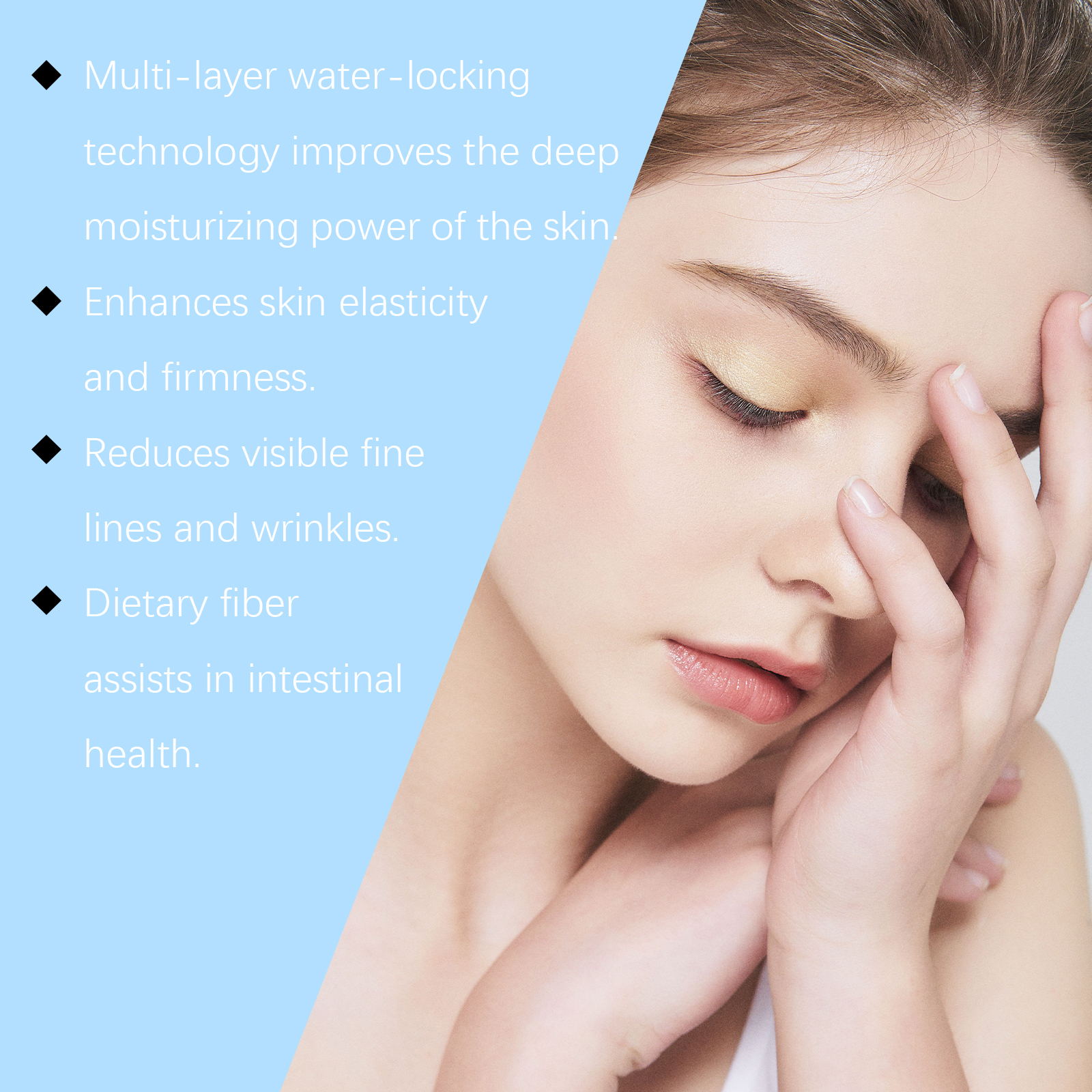 我们的透明质酸蛋白粉,由红豆粉、脱脂乳粉、红枣粉精心调配而成。专为内部使用提供营养,为外部使用修复皮肤设计。使用方法极为便捷:取适量本品,用温水调匀。搅拌直至完全溶解。每天喝一次,或者冷藏直到凝固,然后涂抹在皮肤上。并且可以选择植物原料来补充日常需求。