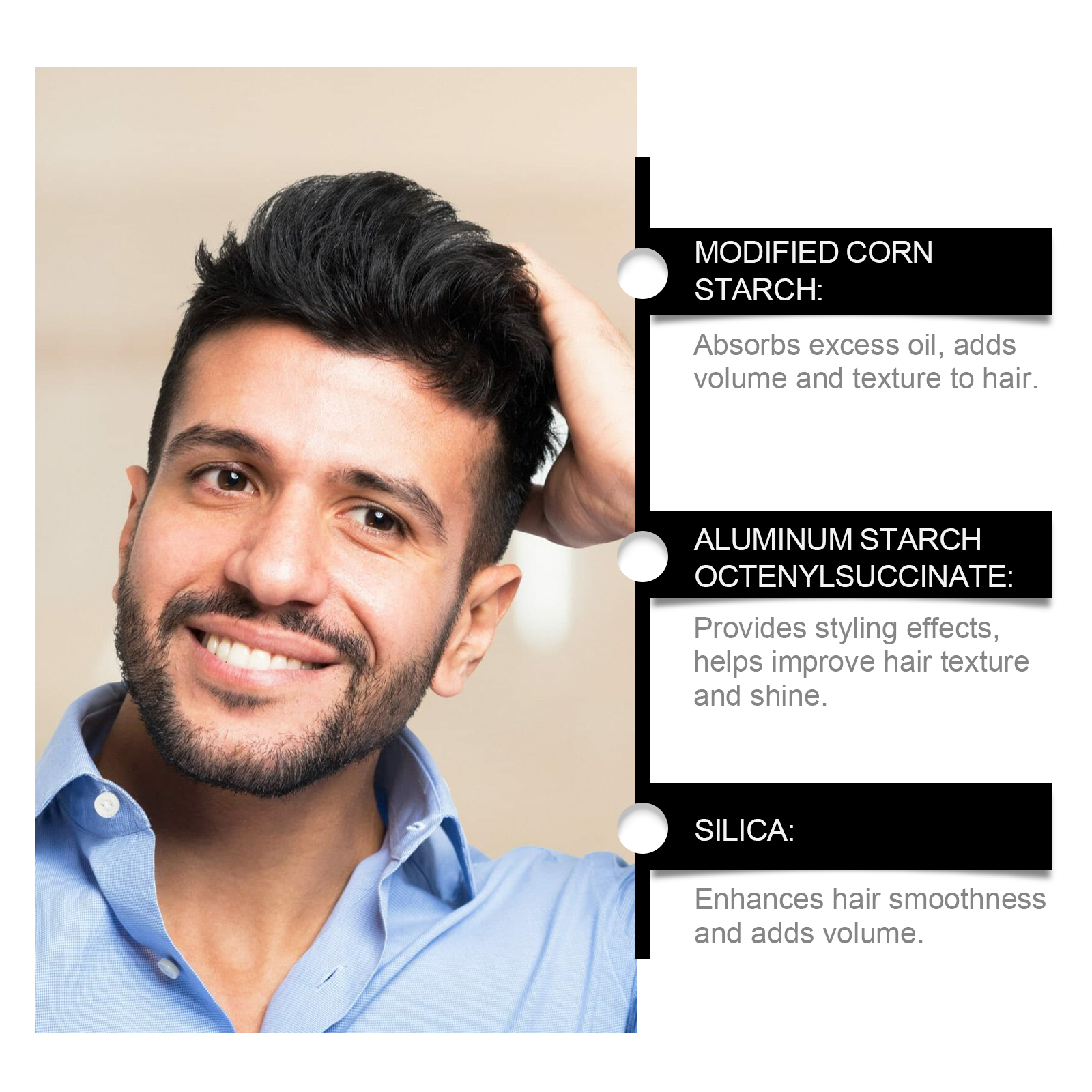 我们的男士造型丰盈粉,由改性玉米淀粉、淀粉辛烯基琥珀酸铝精心调配而成。专为打造蓬松发型,轻松应对细软发质设计。使用方法极为便捷:清洁并干燥你的头发。在头发上适量涂抹发型粉并均匀涂抹。并且可以修复头发,改善头发的弹性,使头发更强壮。