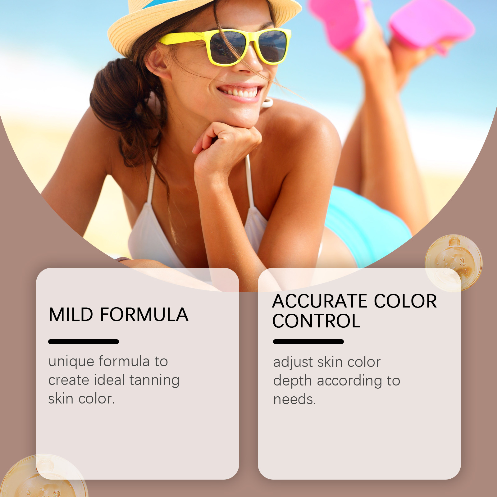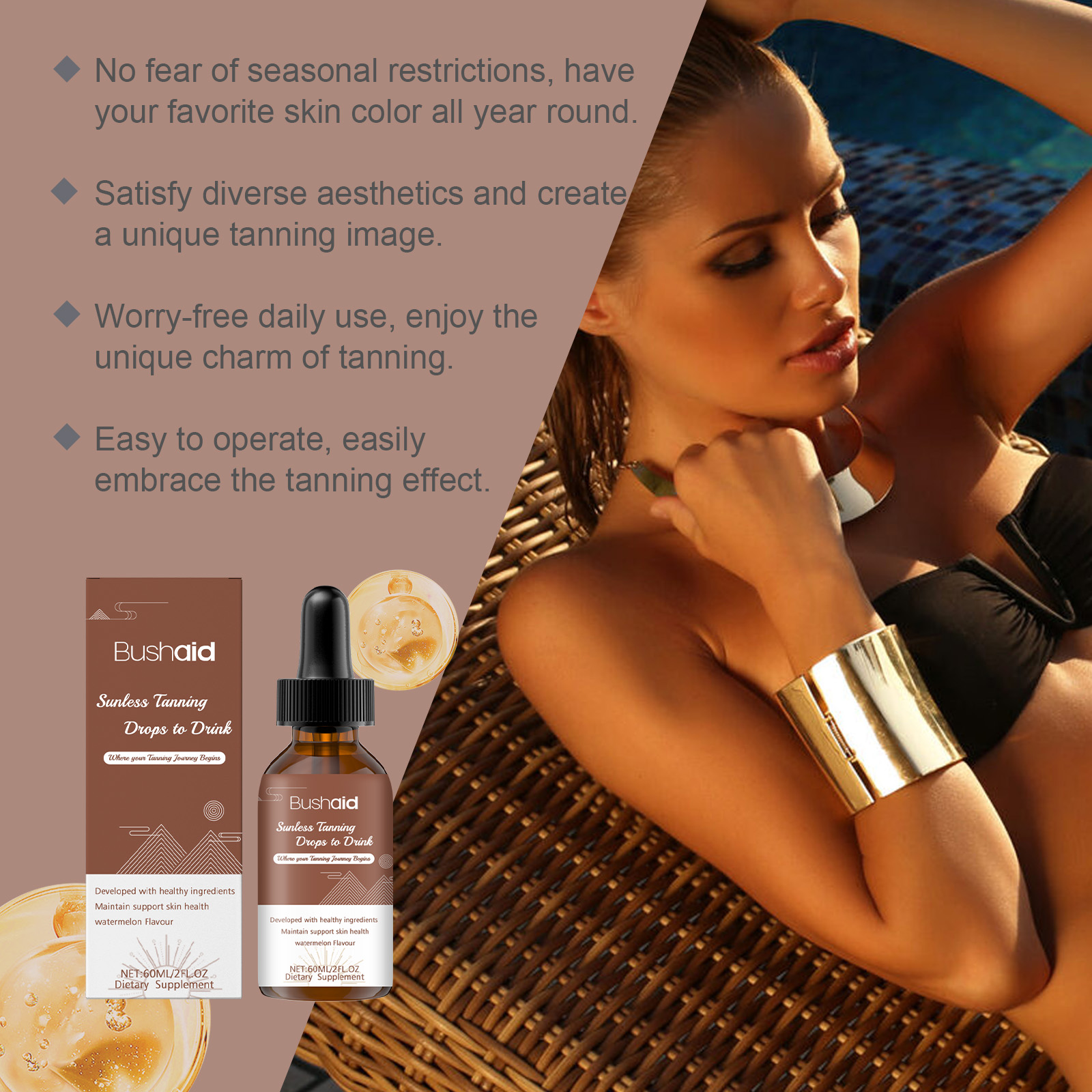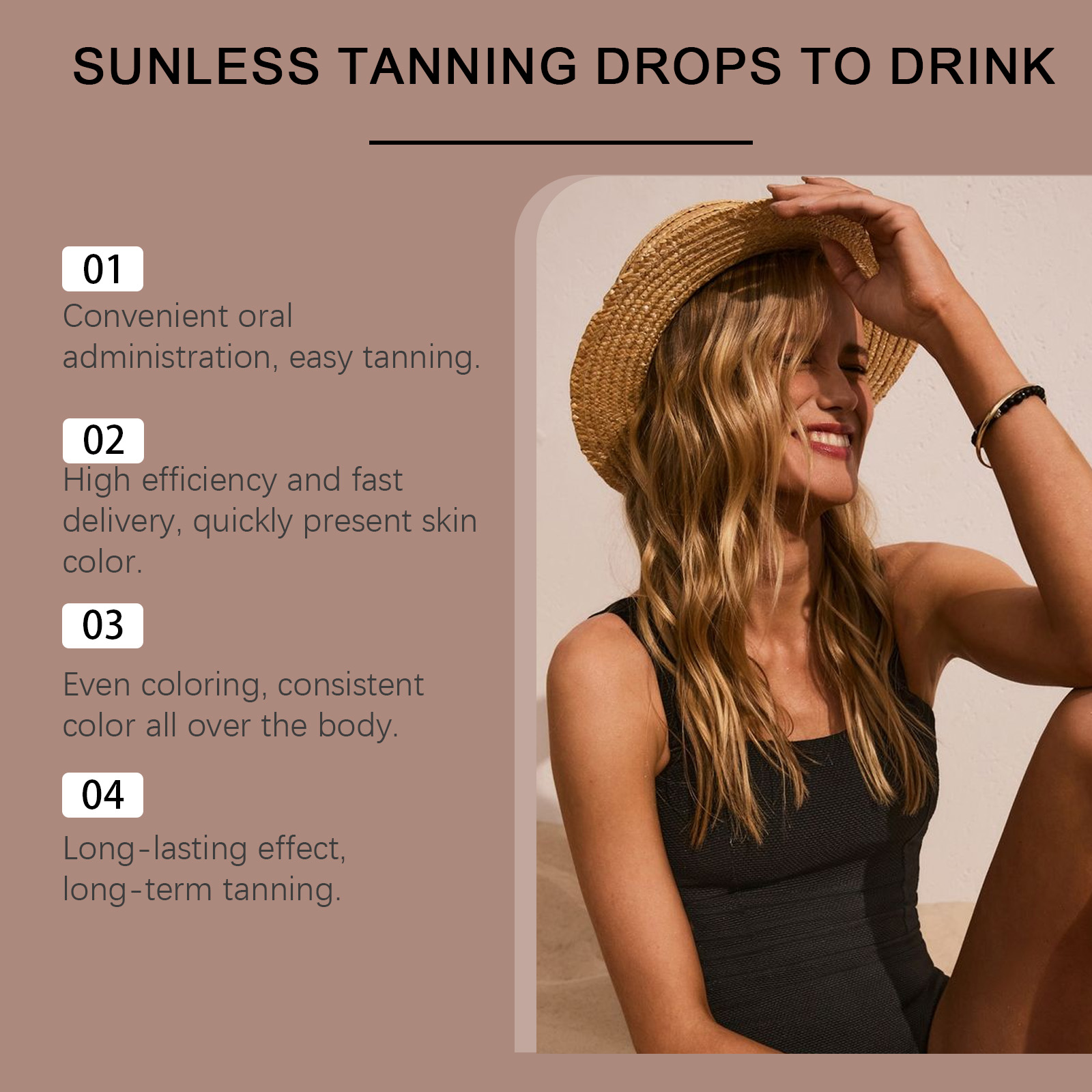 我们的自然美黑滴剂(入口),由中药提取物、葡萄糖酸内脂精心调配而成。专为创造理想的晒黑肤色设计。使用方法极为便捷:请在服用前摇匀,每次1-2滴,每天1-2次。并且可以根据需要调整肤色深度。