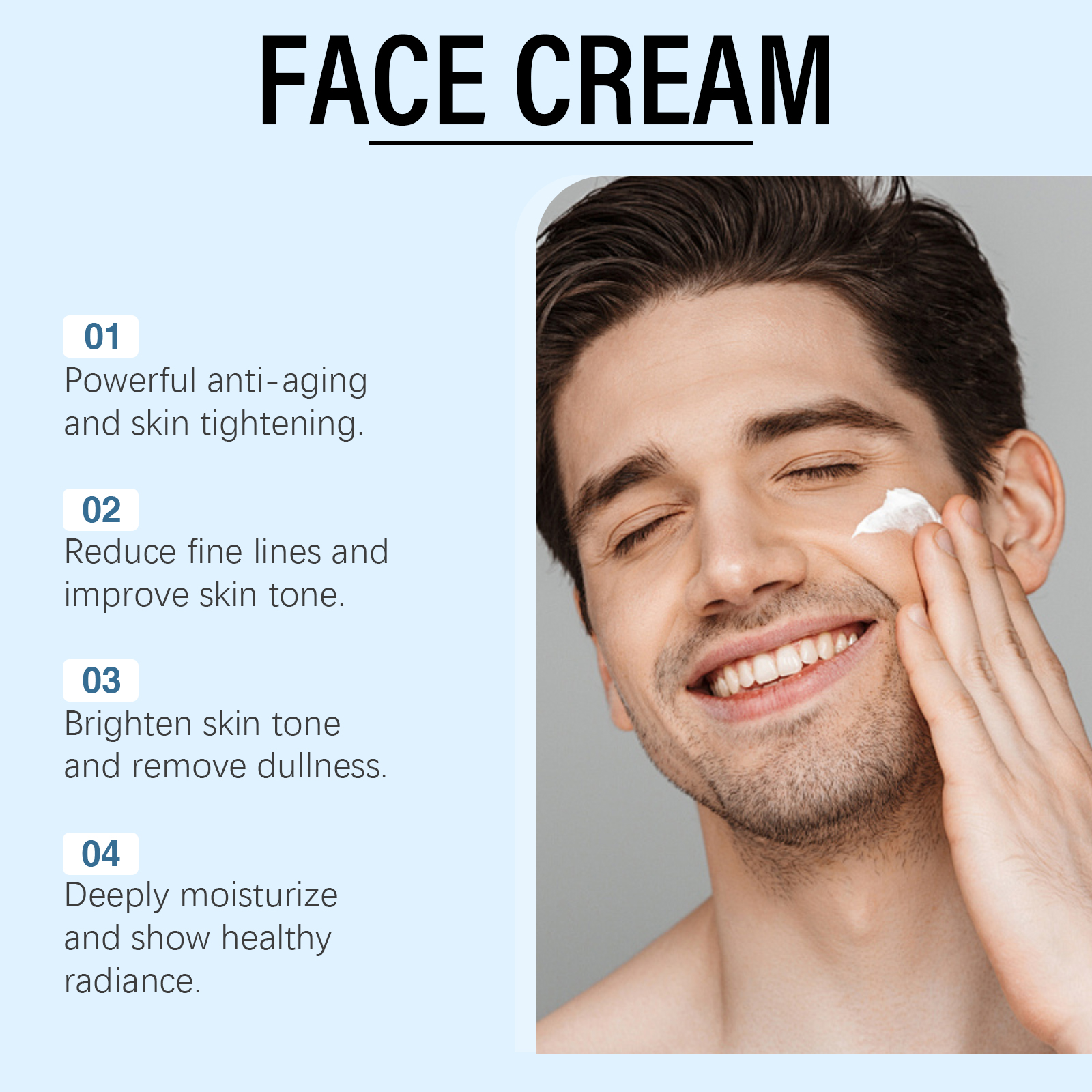 我们的男士保湿霜,由甘油、矿油、甘油硬脂酸酯精心调配而成。专为平滑细纹,使皮肤更紧致、更光滑设计。使用方法极为便捷:清洁你的脸并保持干燥。将适量本品均匀涂抹于面部。轻轻按摩直至吸收。并且可以适合日常使用,创造持久的保湿肌肤。改善不均匀的肤色,呈现更透明、明亮的肌肤。持久的保湿,保持肌肤柔嫩。使肌肤更光滑,焕发光彩,柔软而有光泽。使皮肤更紧致,提高弹性。