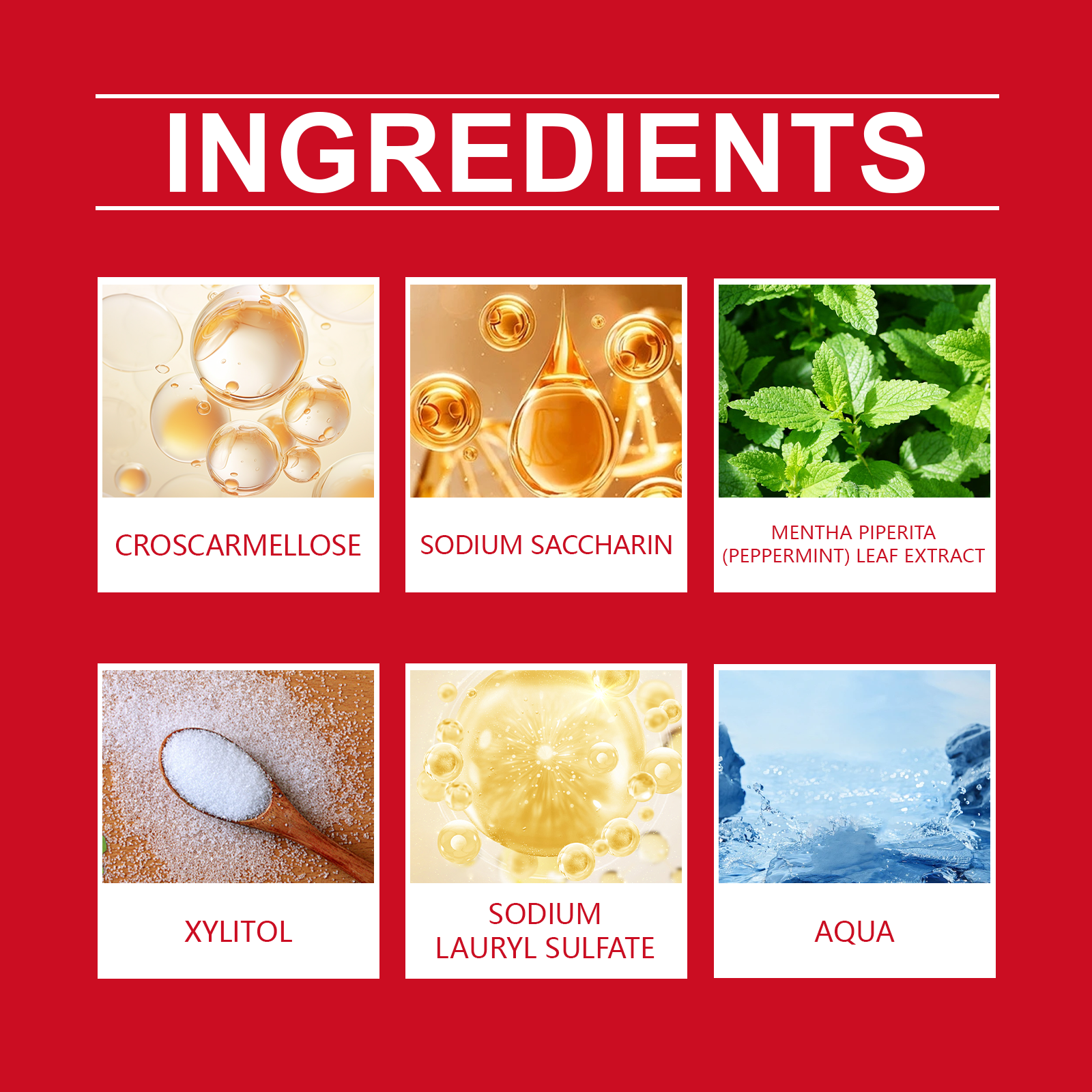 | 成分 | 糖精钠、木糖醇、辣薄荷叶提取物 |