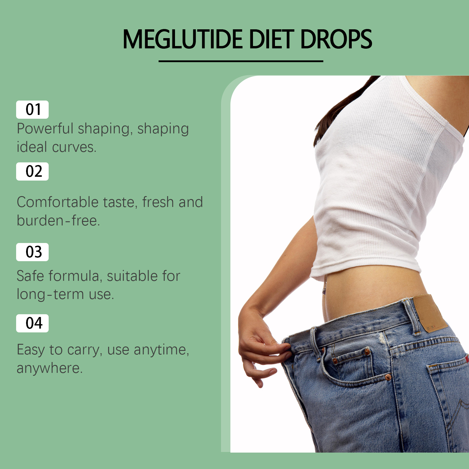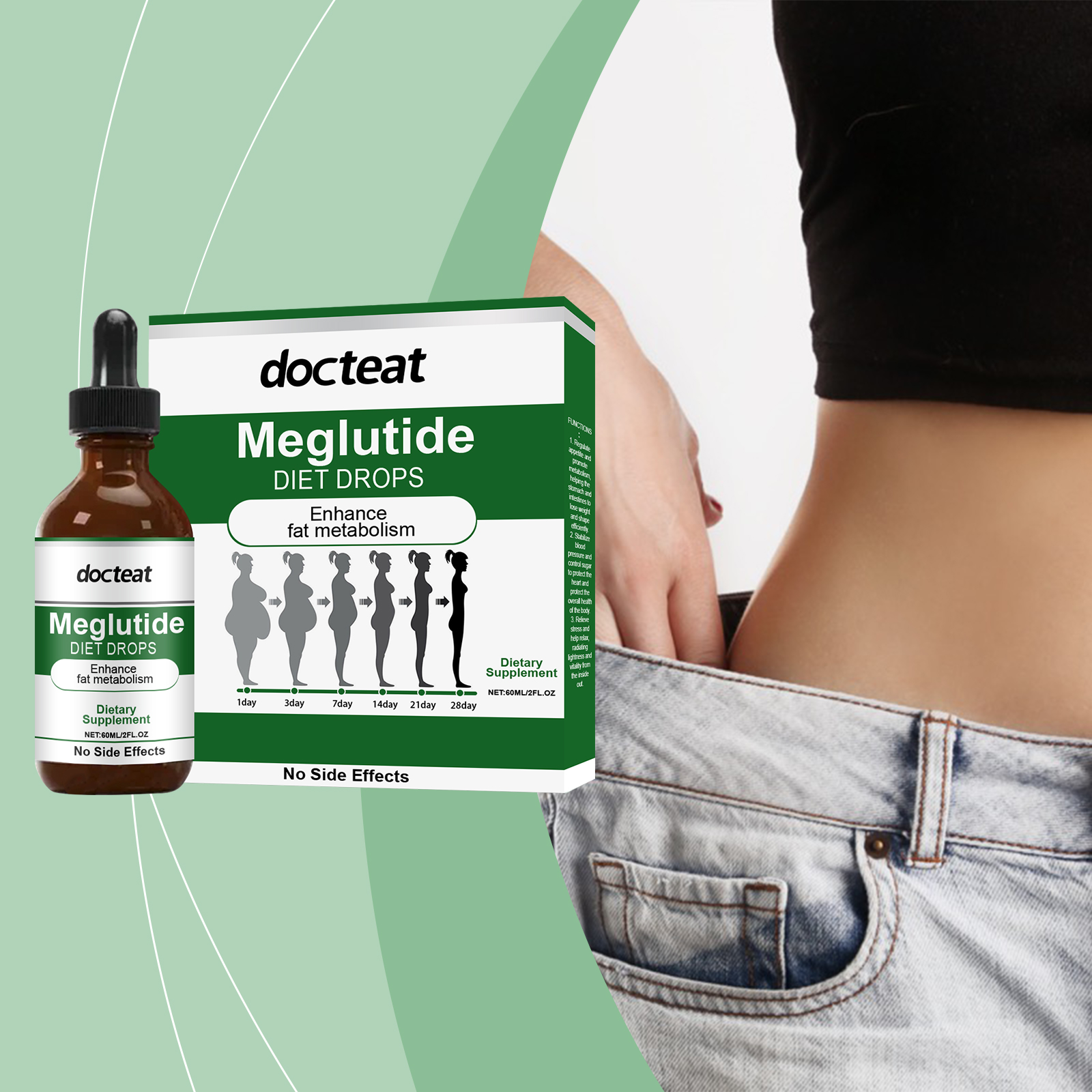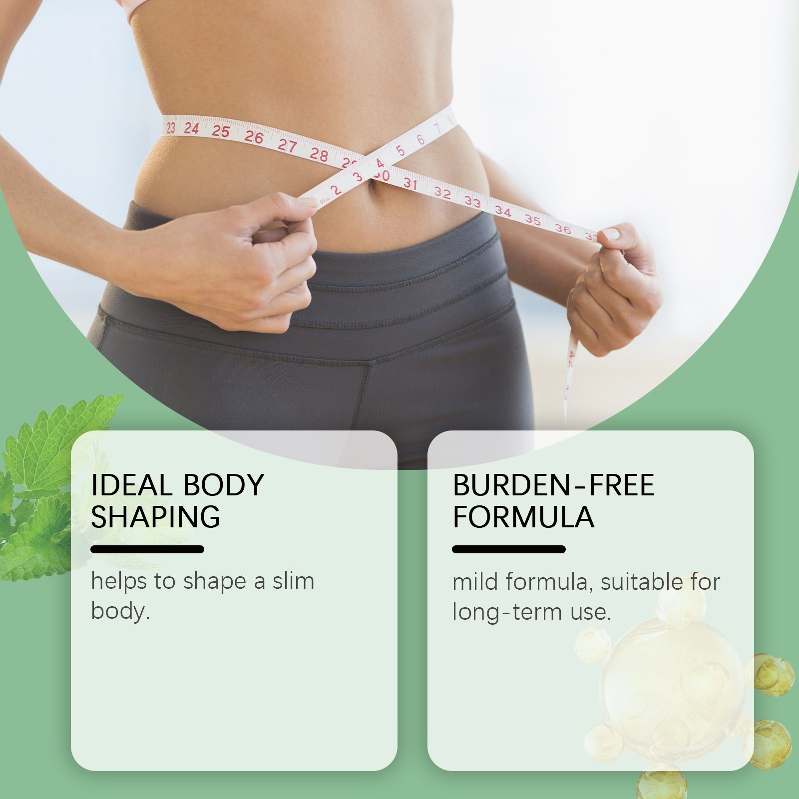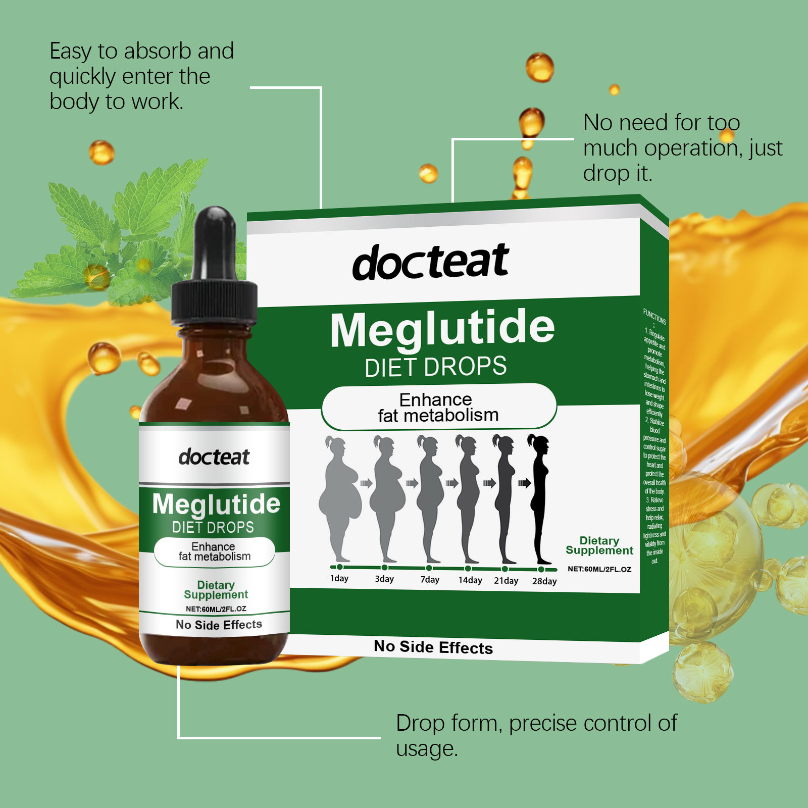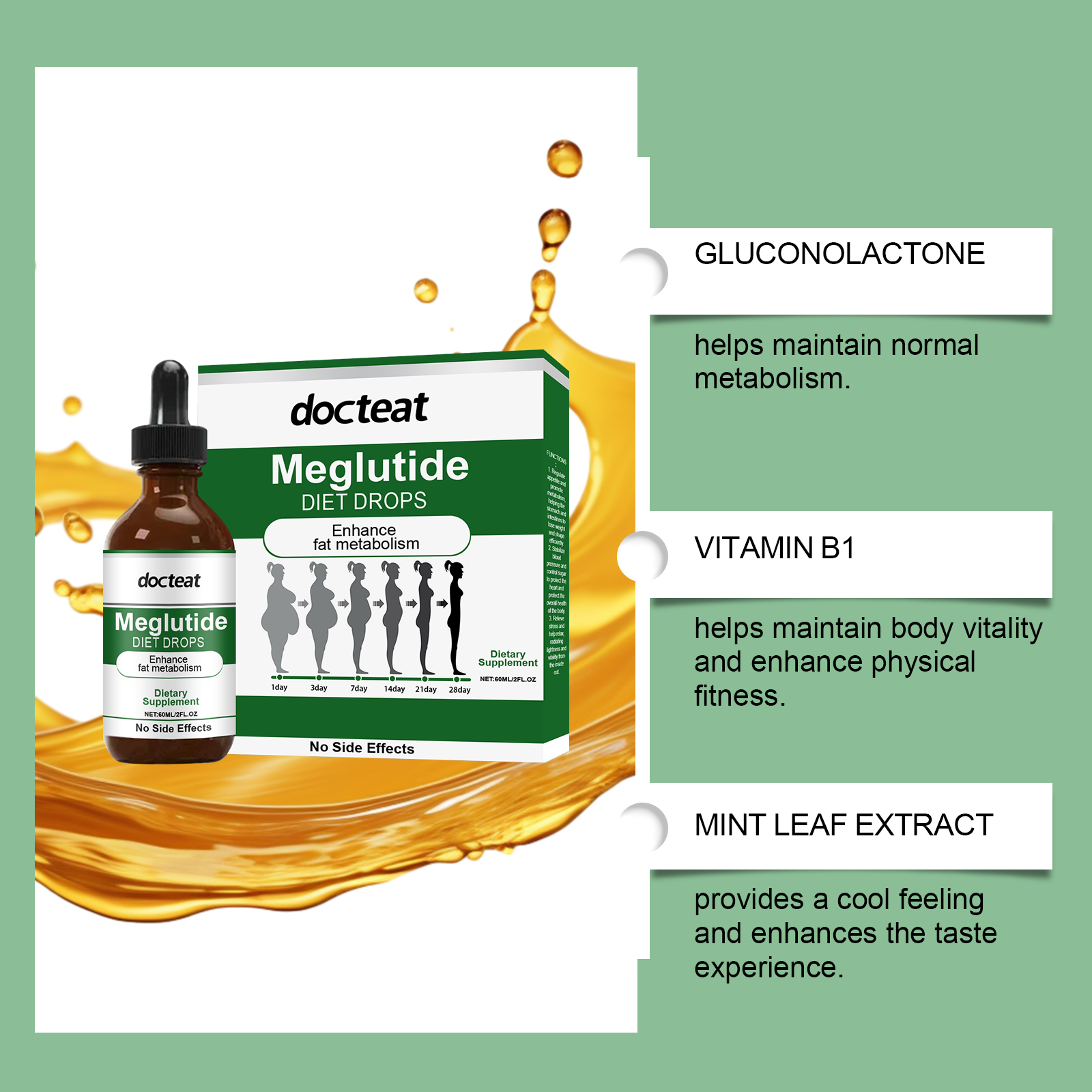 我们的身体护理滴剂,由中药提取物、葡萄糖酸内脂、维生素b1精心调配而成。专为有助于塑造苗条身材设计。使用方法极为便捷:请在服用前摇匀,每次1-2滴,每天1-2次。并且它具有温和的配方,适合长期使用。新鲜的味道,没有不适感。