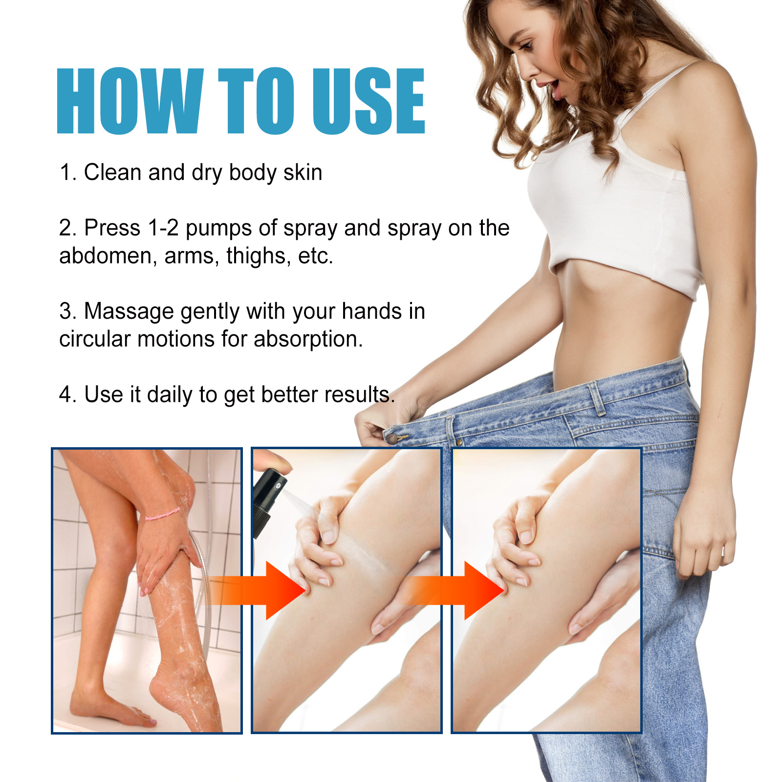 我们的塑身喷雾含有山楂提取物、母菊提取物、掌叶大黄提取物。它可以通过多种植物成分的组合,促进脂肪分解和卡路里燃烧,从而减轻体重,达到瘦身效果。它的使用方法很简单:清洁干燥的身体皮肤,按压1-2泵喷雾,喷在腹部、手臂、大腿等部位,.用手轻轻按摩做圆周运动以吸收。每天使用它可以获得更好的瘦身效果。