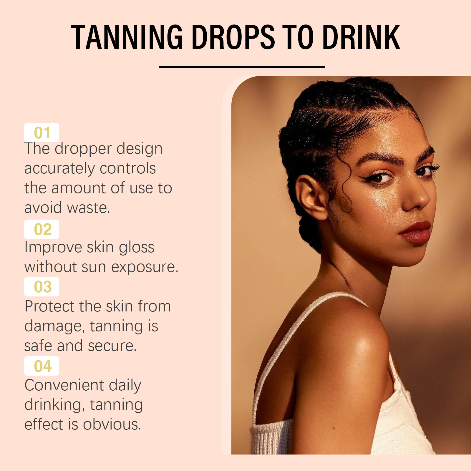 我们的免晒美黑滴剂(入口),由L-酪氨酸、番茄红素(来自番茄提取物)精心调配而成。专为轻松改善肤色不均设计。使用方法极为便捷:请在服用前摇匀,每次1-2滴,每天1-2次。并且支持皮肤的自然代谢周期。