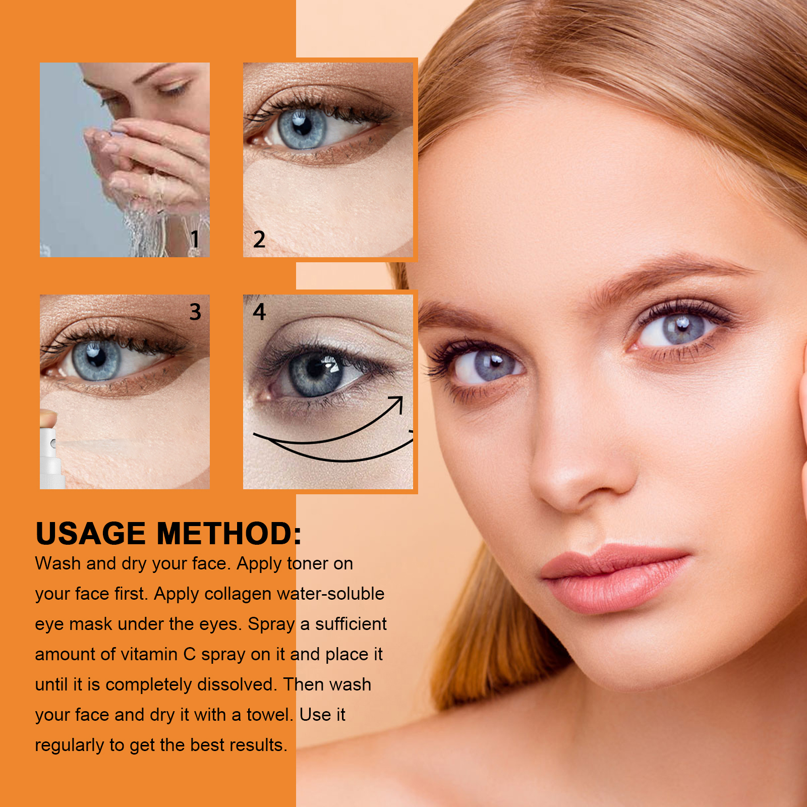 我们的胶原蛋白面膜和喷雾套装含有水、胶原蛋白、透明质酸。它可以帮助您去除痘痘,为皮肤补充水分,分解油污,去除黑头粉刺,从毛孔滋润肌肤,让您的皮肤变得更加细嫩又光滑。它的使用方法很简单:首先洗脸并擦干,之后在脸上涂上爽肤水。在眼下涂抹胶原蛋白水溶性眼膜。在其上喷足量的维生素C喷雾剂,放置至完全溶解。然后洗脸,用毛巾擦干即可。要经常使用,才能达到最佳效果。使用后可以有效淡化各种干纹和细纹,防止新皱纹的产生,帮助改善面部松弛和肿胀。