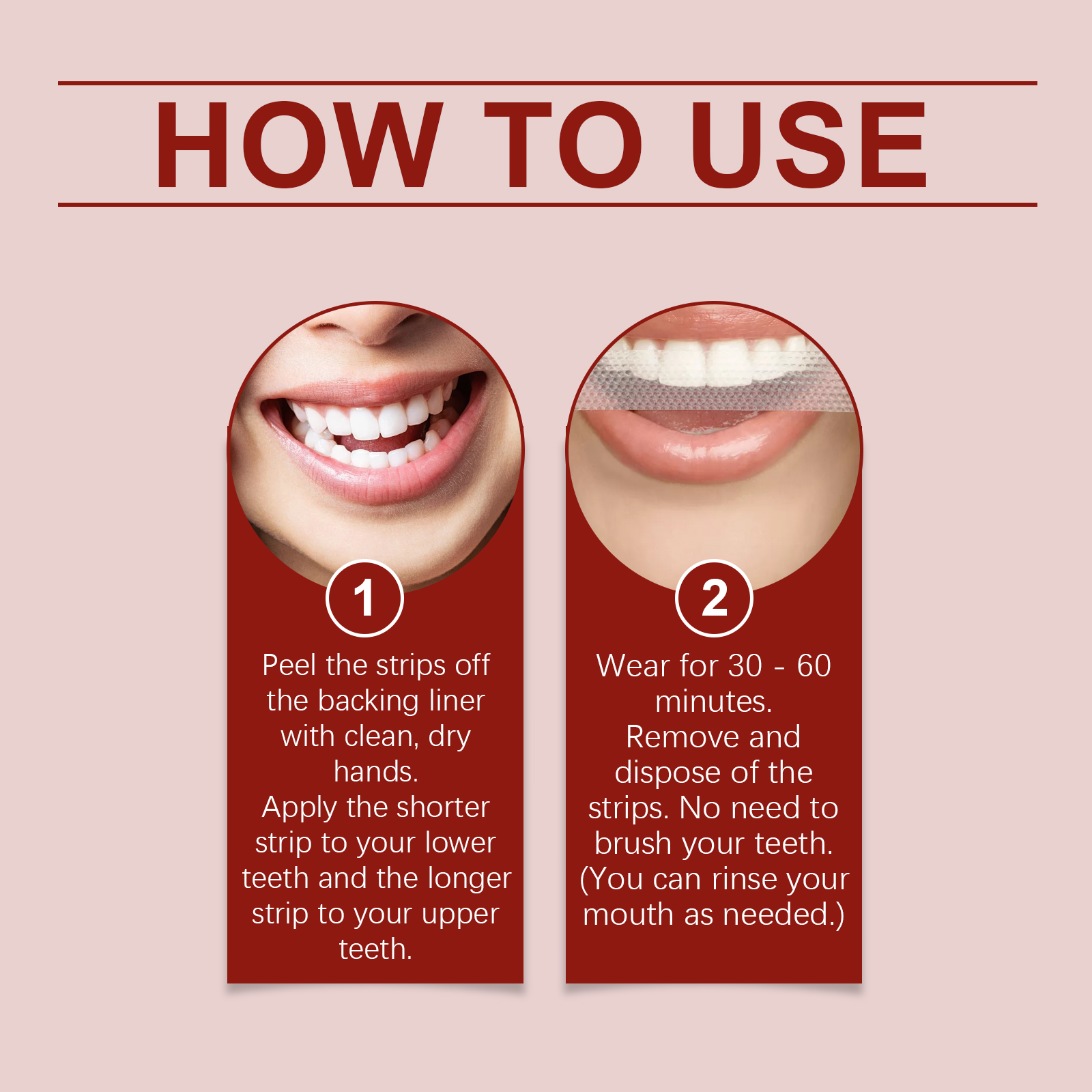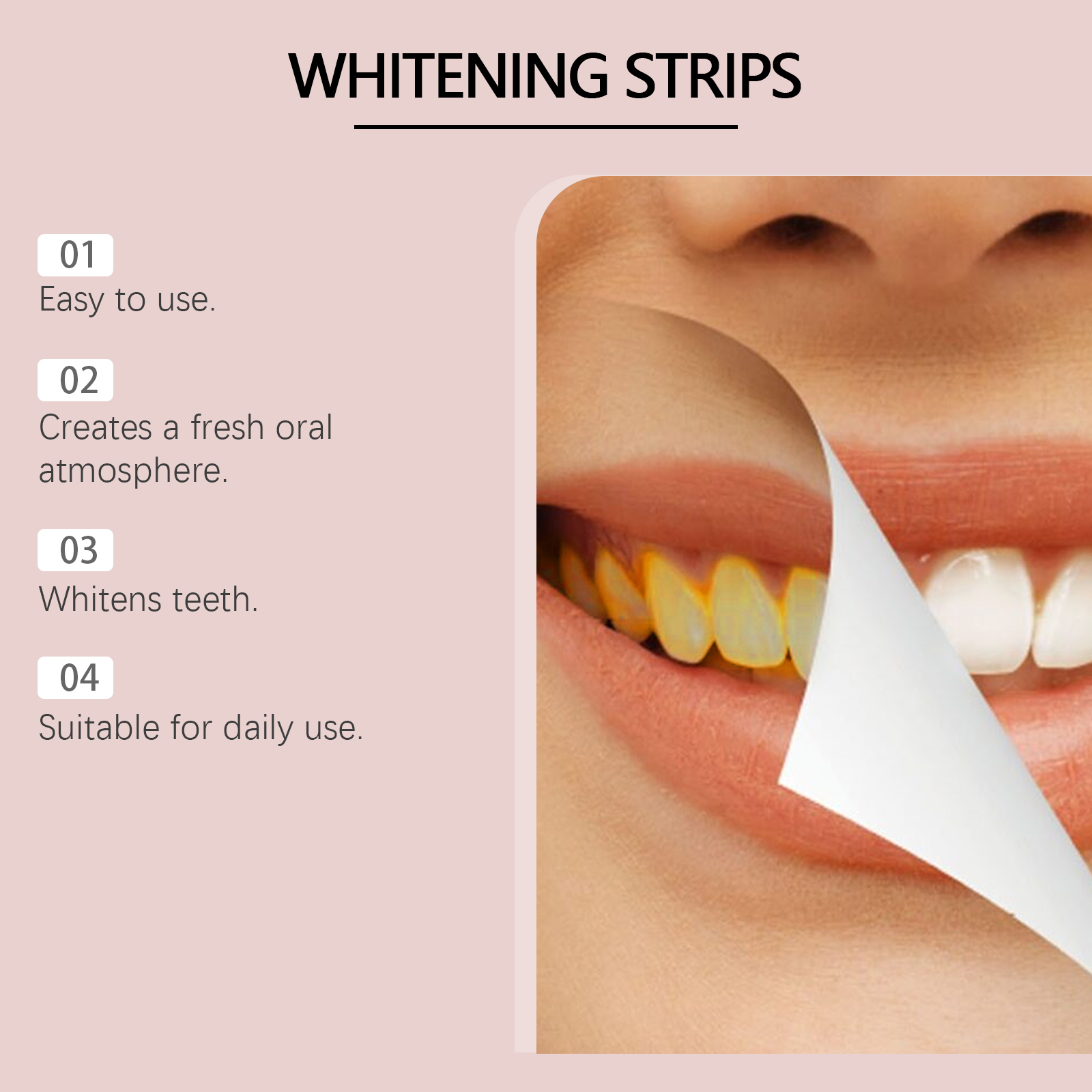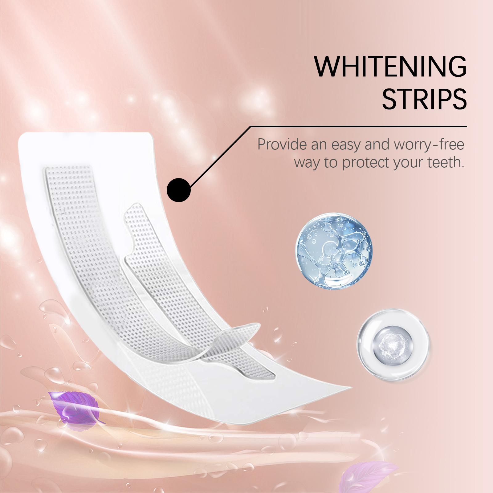 我们的牙齿清洁牙贴,由甘油、丙二醇、聚二甲基硅氧烷心调配而成。专为使牙齿看起来闪亮,减少牙齿污渍的可见度设计。使用方法极为便捷:用干净、干燥的手剥去衬背上的胶带。将较短的带子贴在下面牙齿上,将较长的带子贴在上面牙齿上。穿戴30-60分钟。取下并处理这些条带。不需要刷牙。(你可以按需漱口)。并且可以有助于保持健康的牙齿珐琅质。