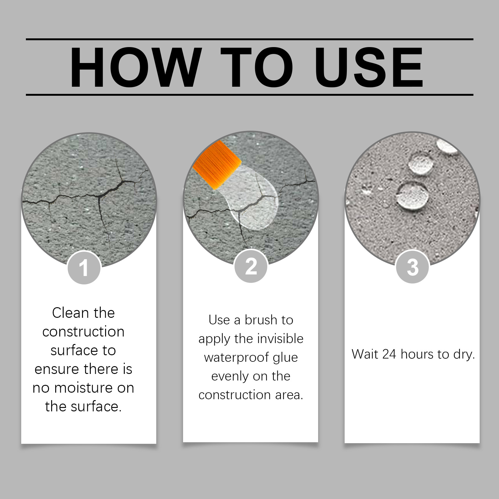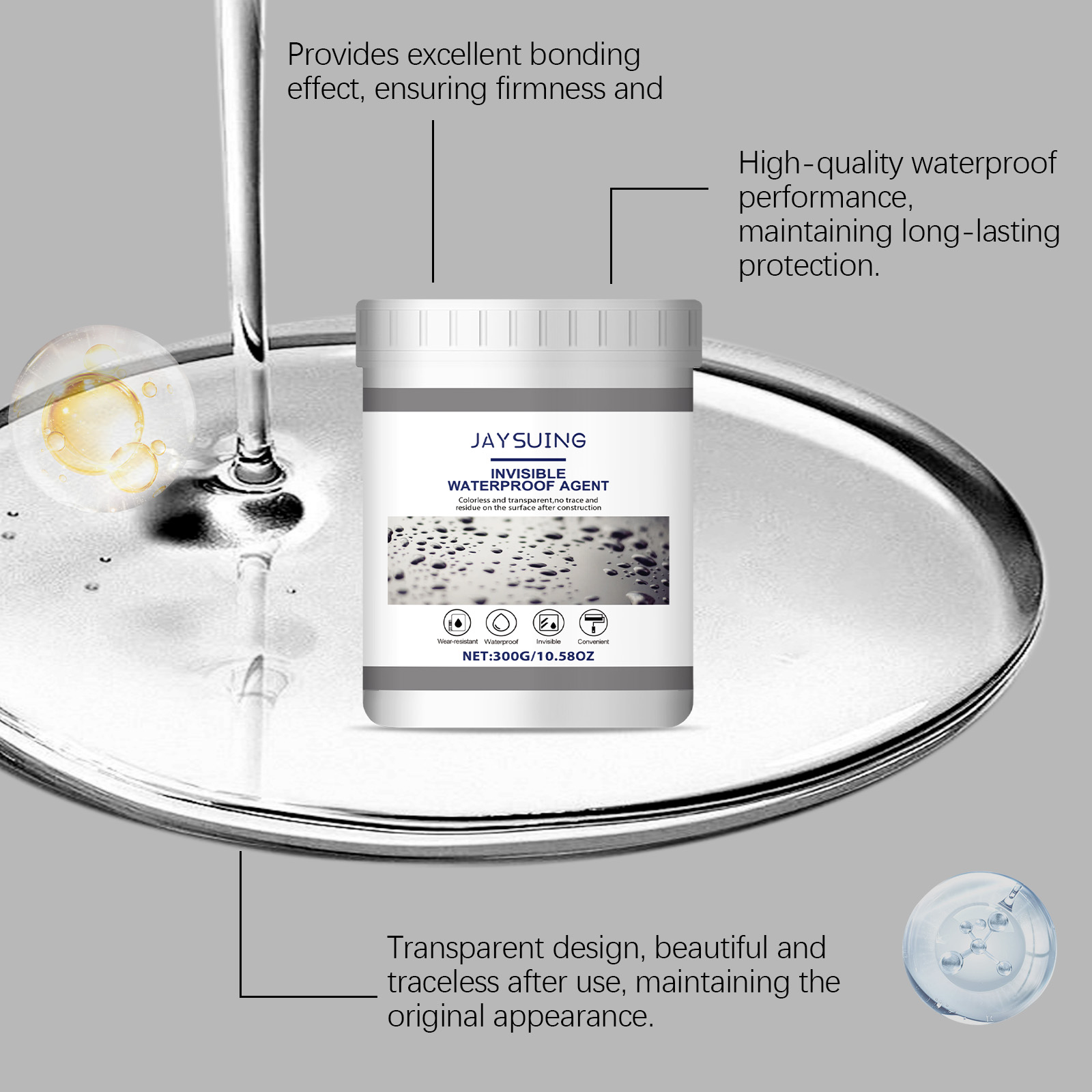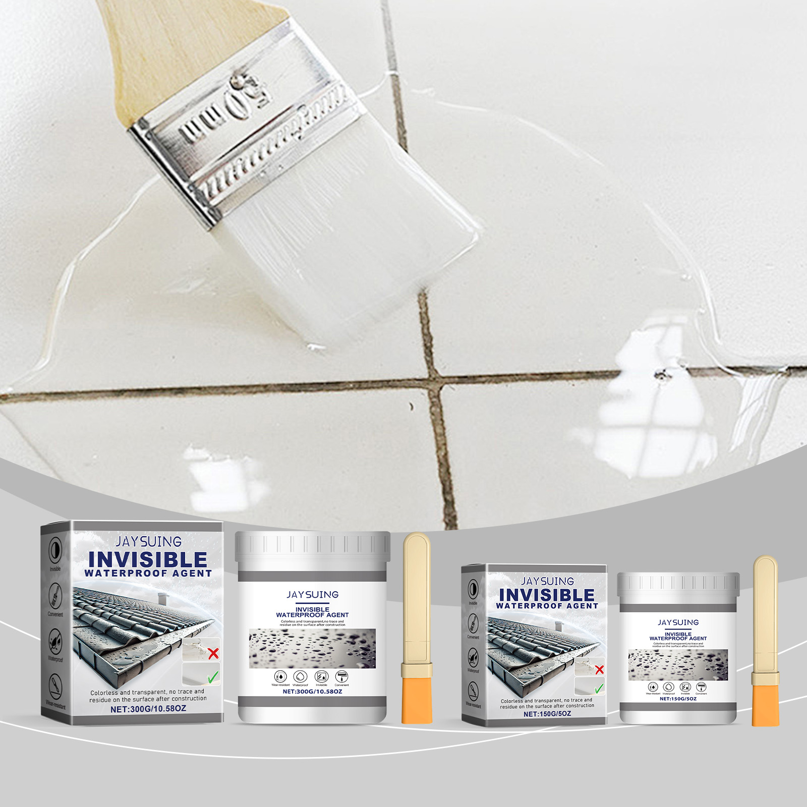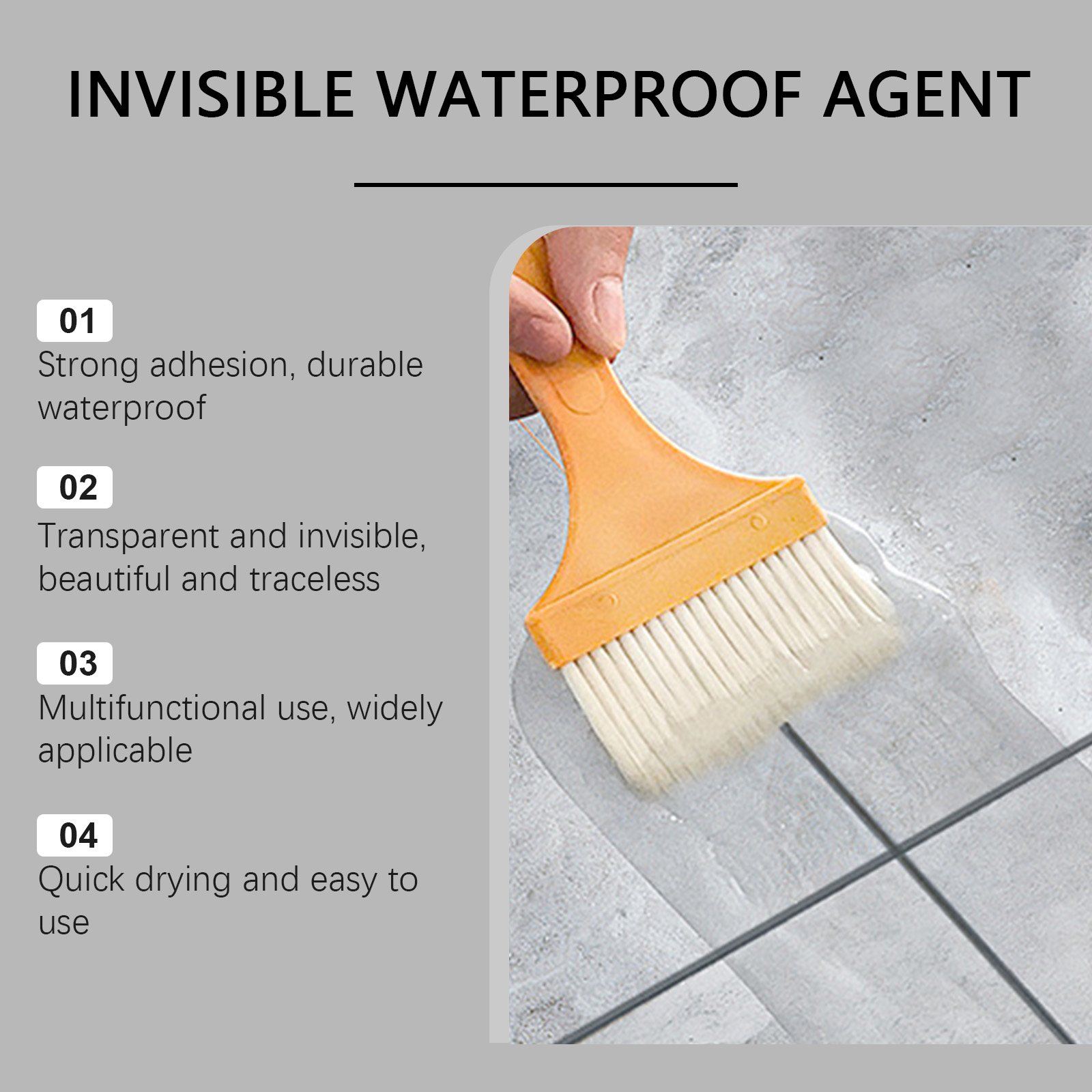 我们的透明防水胶含有消泡剂、聚氨酯树脂。它可以提供持久和持久的保护,防止水的破坏。它的使用方法很简单:清洁施工表面,确保表面无湿气,用刷子将隐形防水胶均匀地涂抹在施工区域上,等待24小时干燥。并且可以迅速形成致密的保护层,有效修复和封闭受损表面,防止水分渗透。