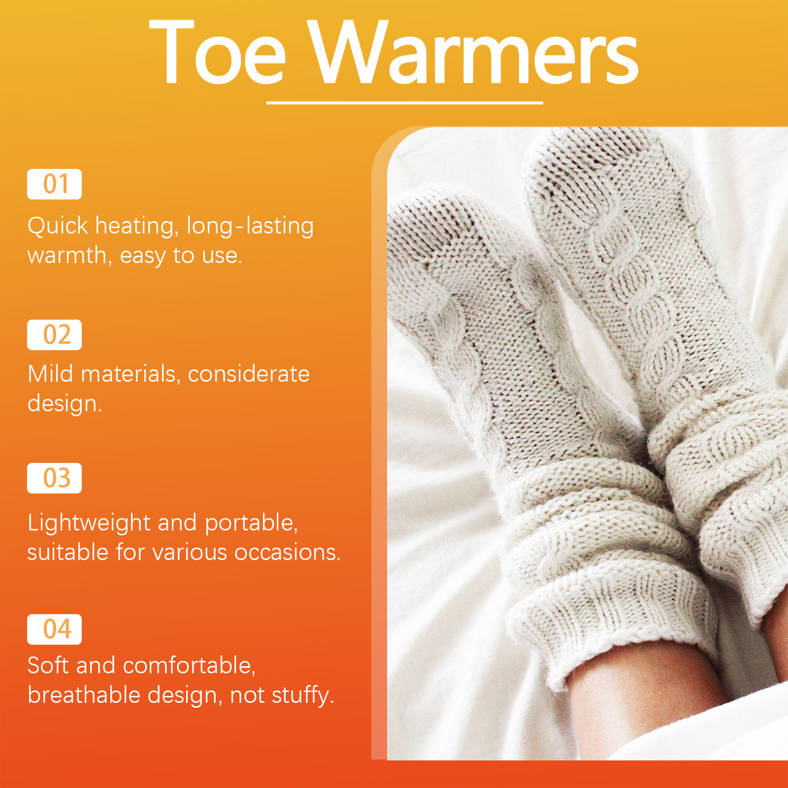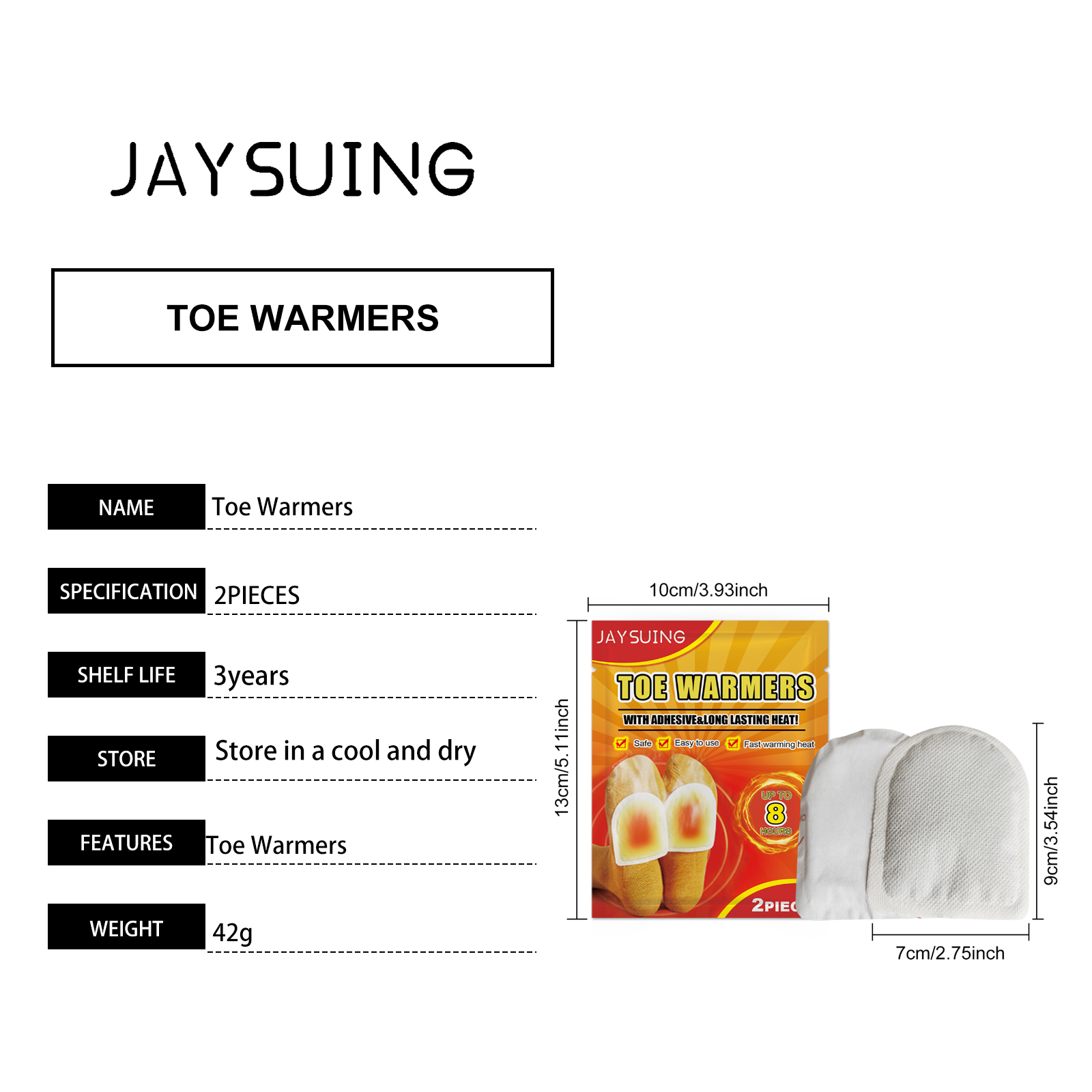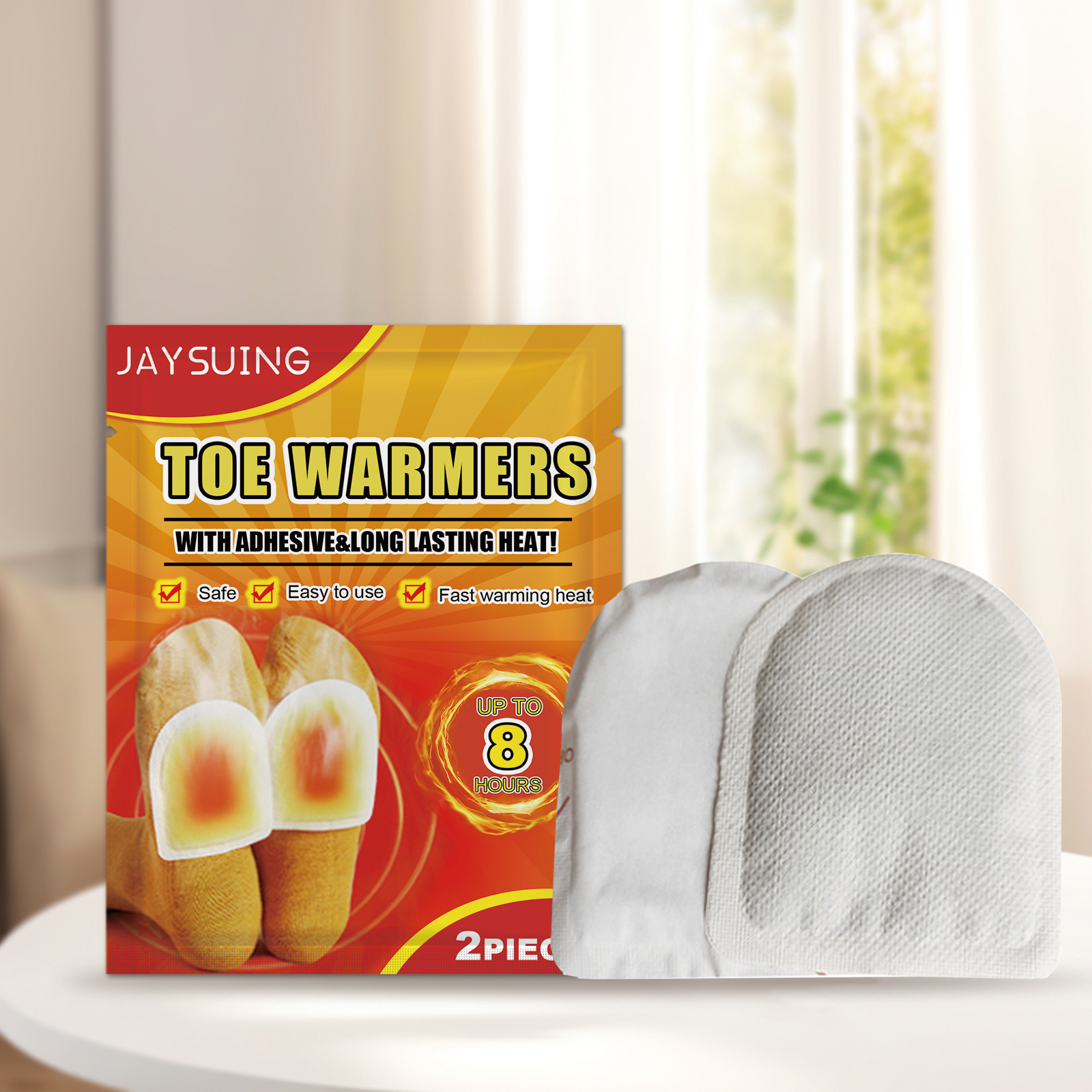我们的暖足贴含有活性炭、木粉、粘合剂。它可以快速启动,让你在寒冷的天气里保持舒适。它的使用方法很简单:打开包装后,取出贴片,贴在袜子的外面,贴片将在15-30分钟内开始加热,保温效果可持续6-8小时。并且可以连续加热长达8小时,全天候温馨护理,稳定可靠。