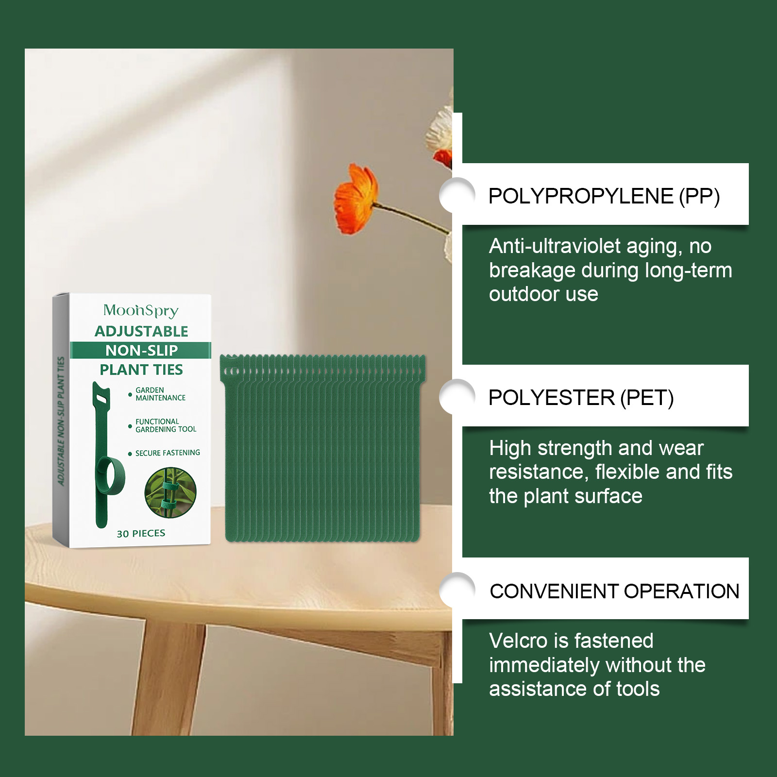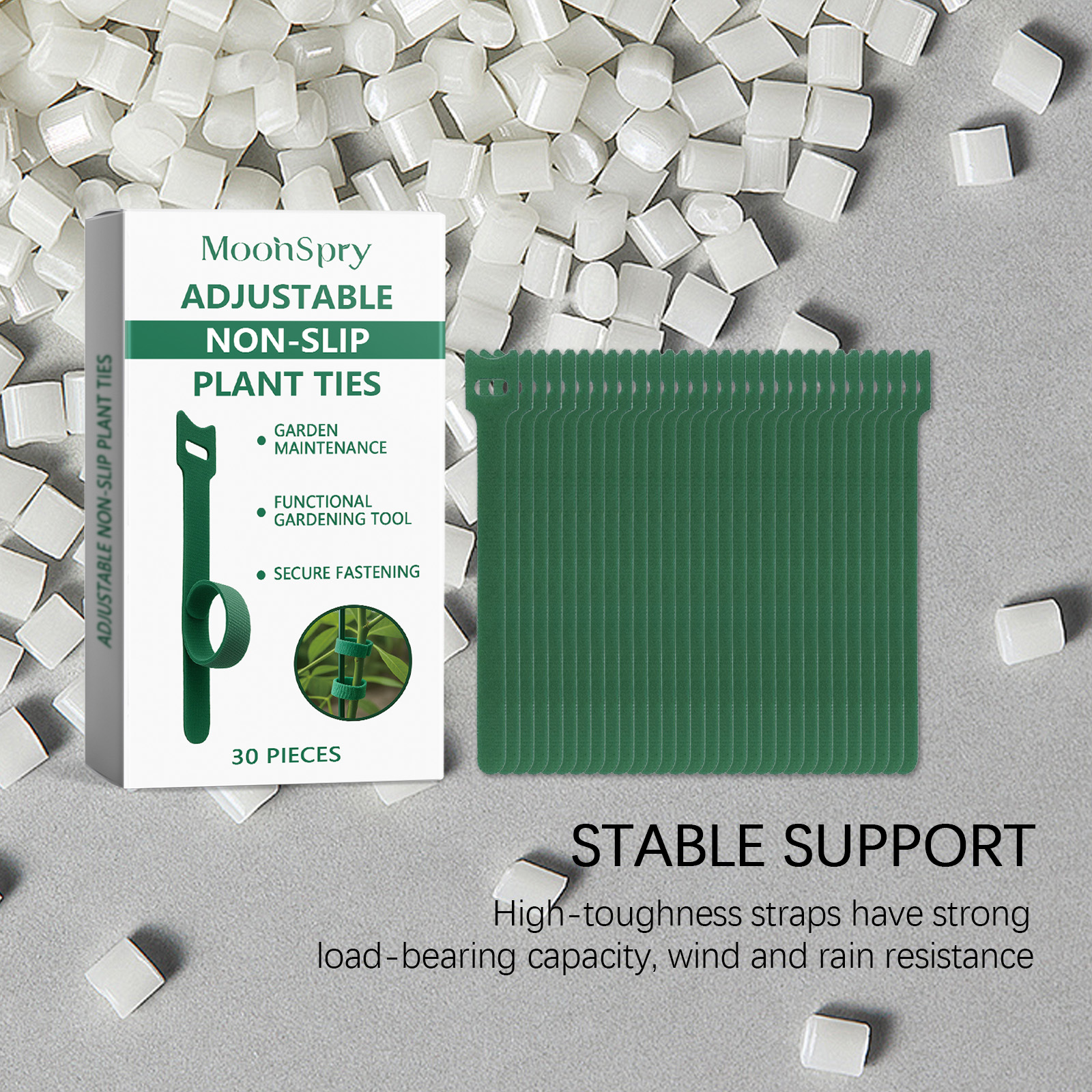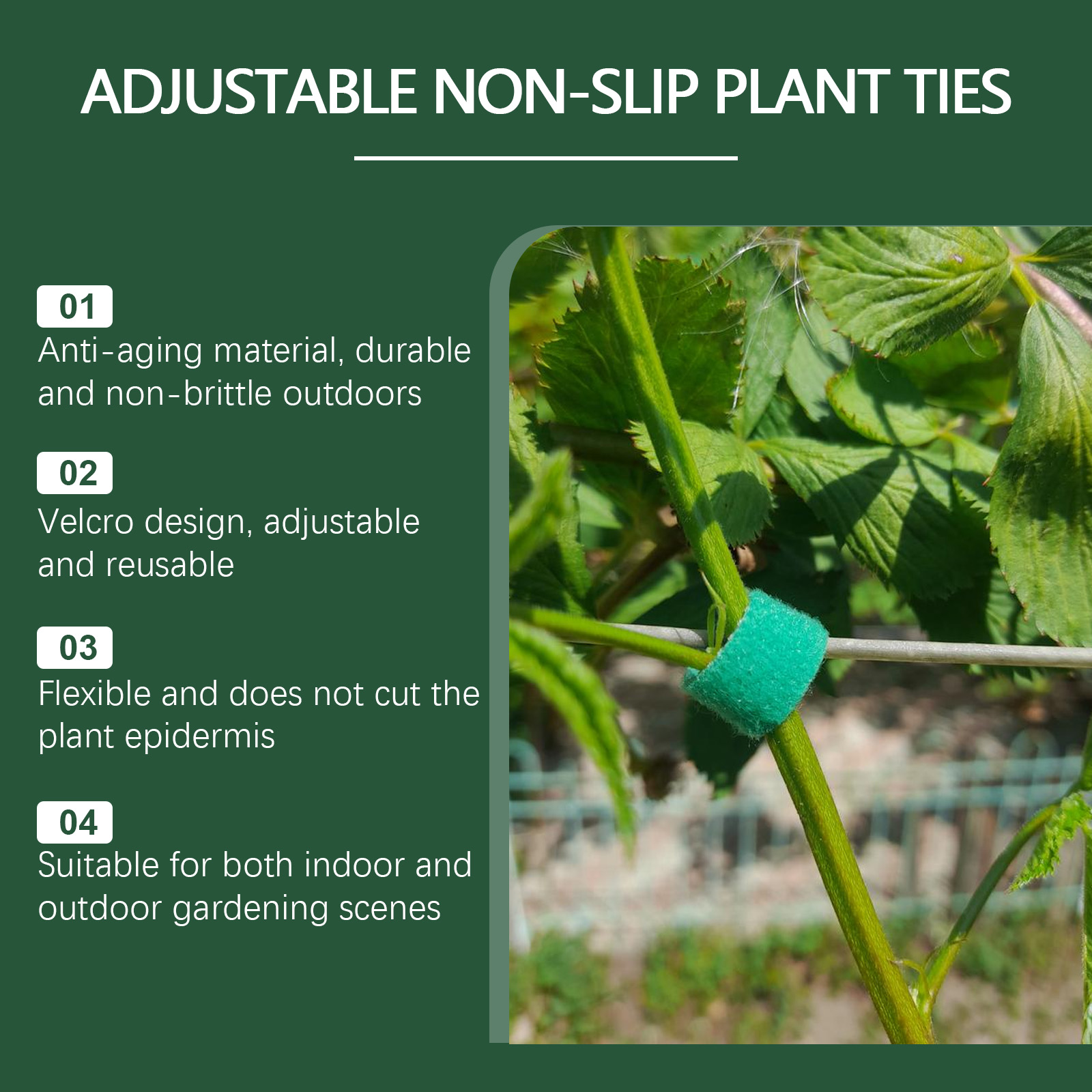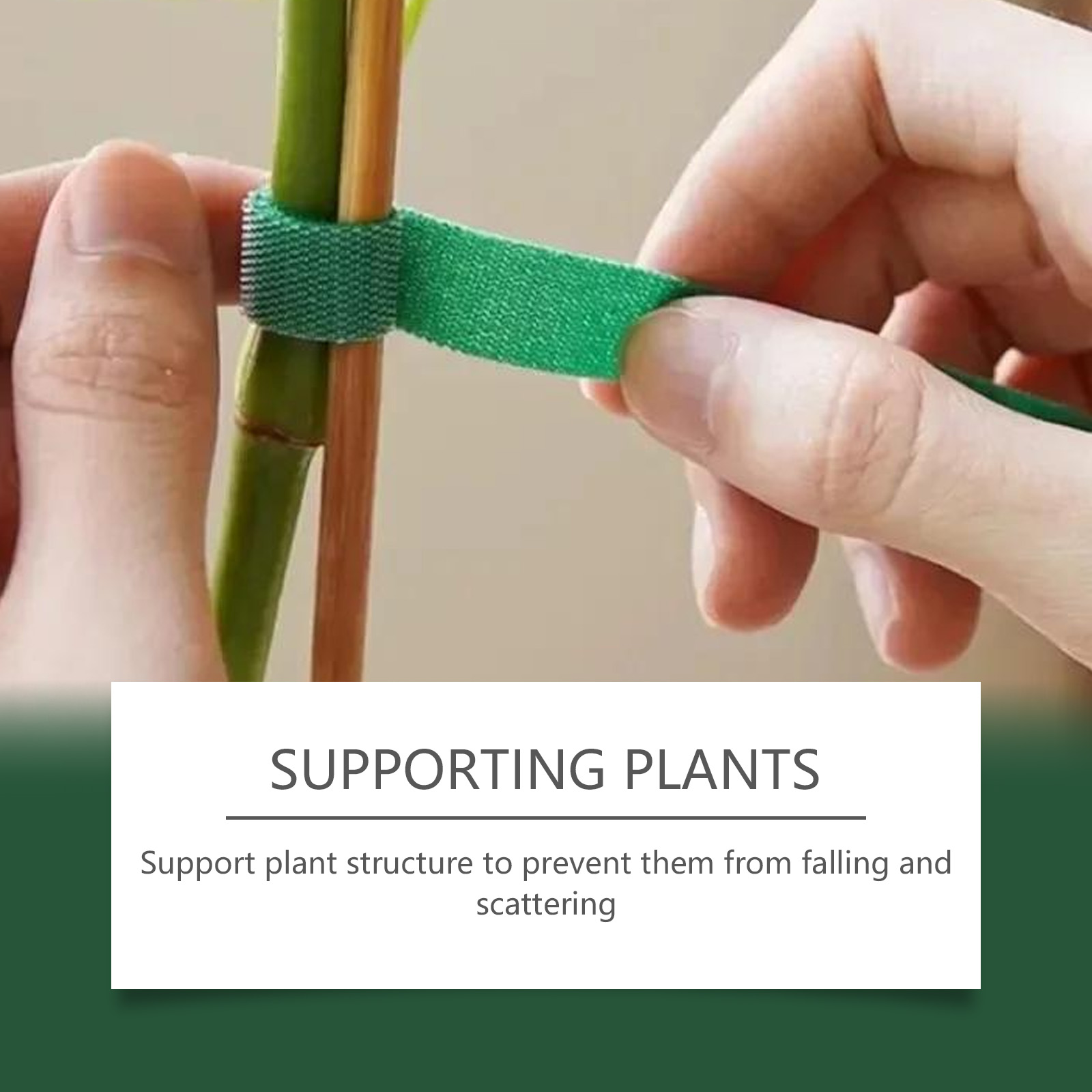 我们的植物绑带,由聚丙烯、涤纶精心调配而成。专为支撑植物结构,防止它们掉落和散落设计。使用方法极为便捷:将带子的顶部放在植物支撑点上,将底部条带插入顶部方形孔中以固定,使用魔术贴调整松紧度在带子完成后修剪多余的长度。并且可以帮助攀缘植物以定向方式生长并保持美观,加固脆弱的树枝,防止它们在风雨中折断。