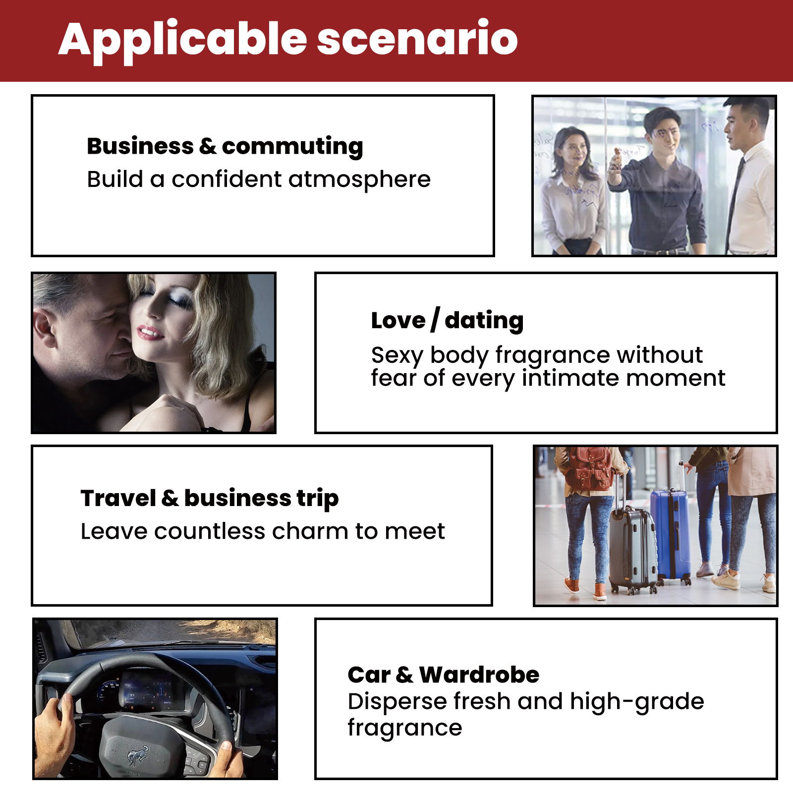 我们的浓缩香水油含有广藿香油、神香草提取物、薰衣草油。它可以拥有持久的香味,放松身心,展现艺术个性,满足各种需求,缩短彼此之间的距离。它的使用方法很简单:将本品直接涂抹在手腕、耳后、颈部等想留香的部位,自然就能散发出迷人的香味。并且可以持久留香。