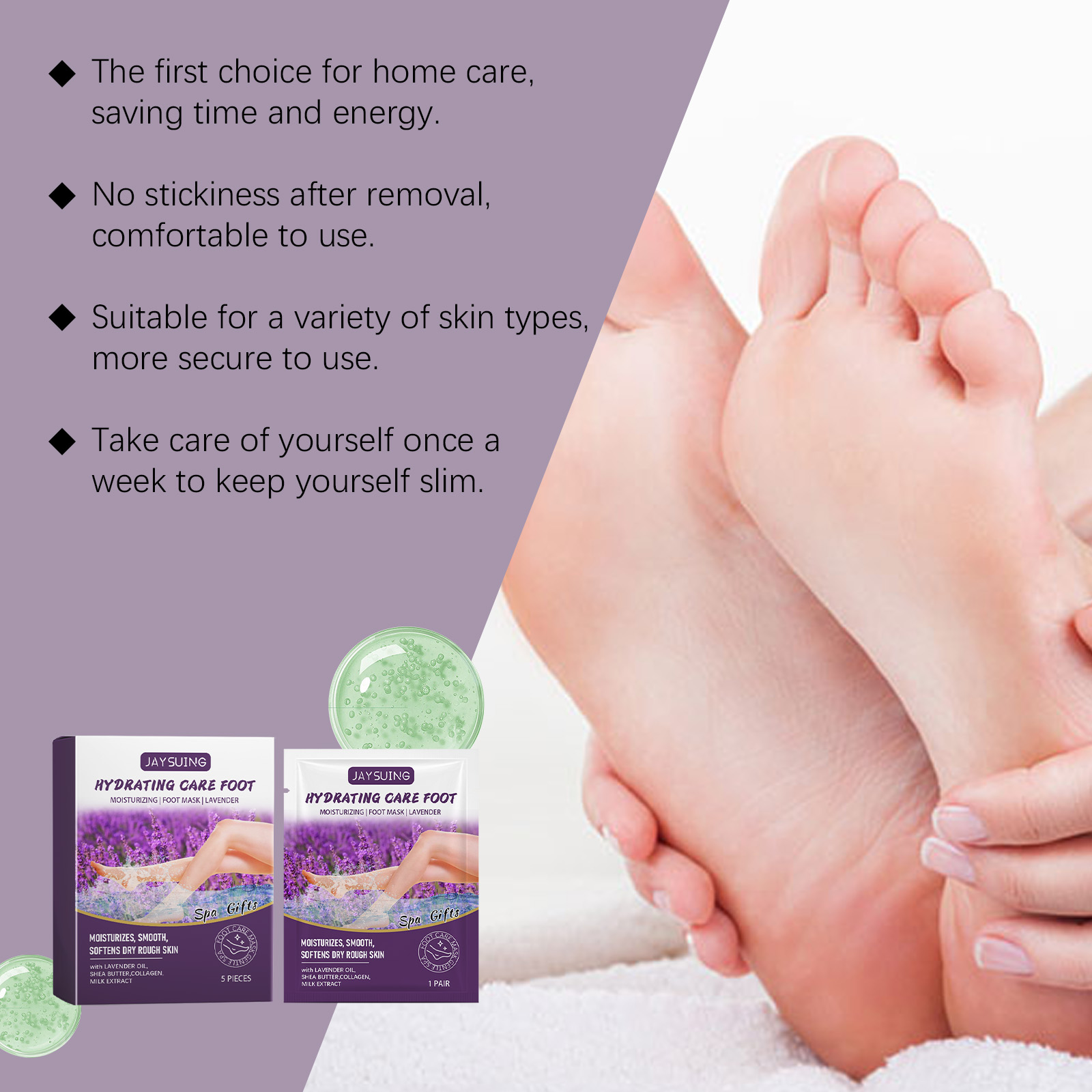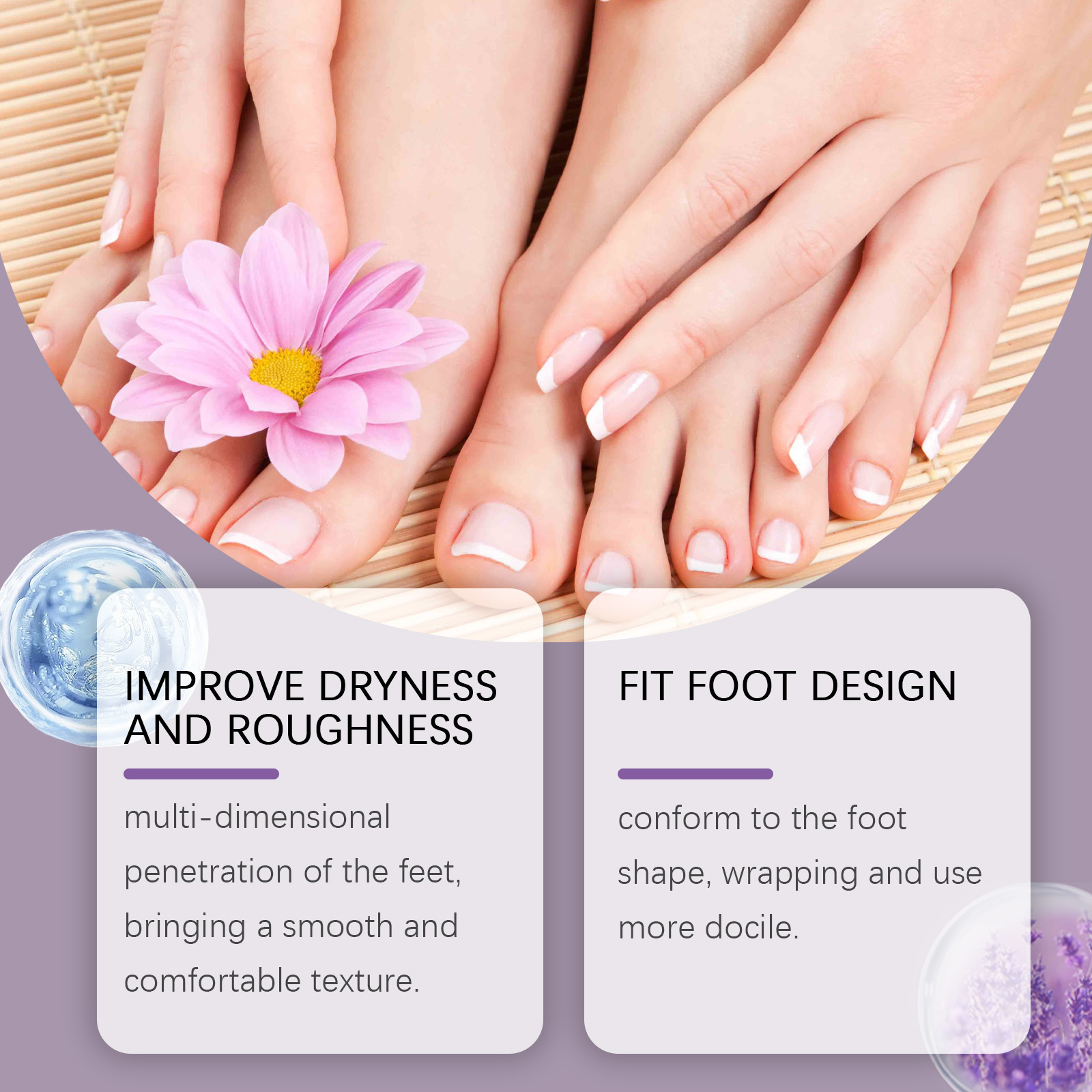 我们的薰衣草去角质足膜,由乳木果油、胶原蛋白、牛奶提取物精心调配而成。专为补充皮肤所需,增强脚部的弹性和触感设计。使用方法极为便捷:清洁你的脚并保持干燥。取出产品并将其放在脚上,保持15-20分钟。取下足膜并用清水洗净。并且可以形成保湿膜,改善干燥粗糙的皮肤。