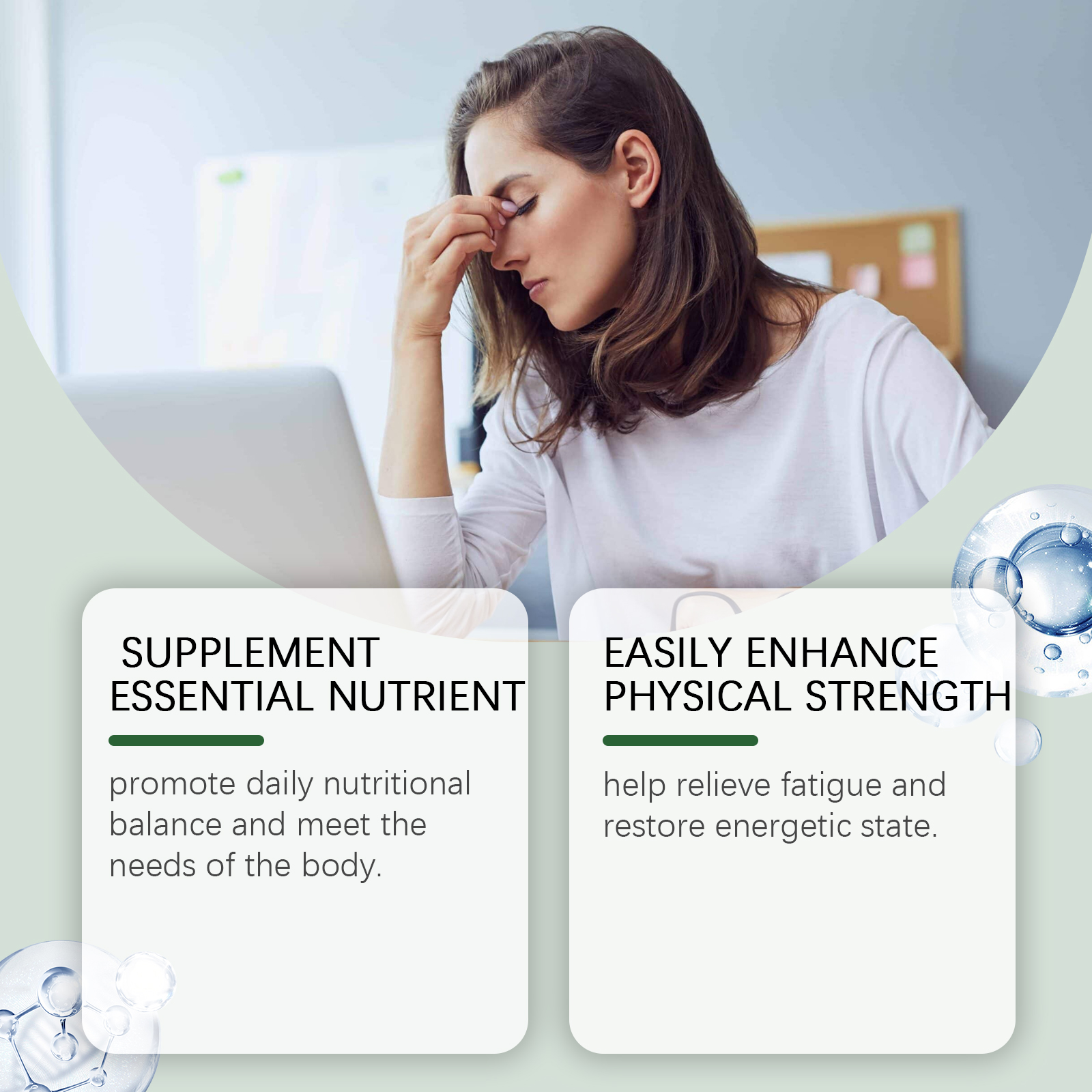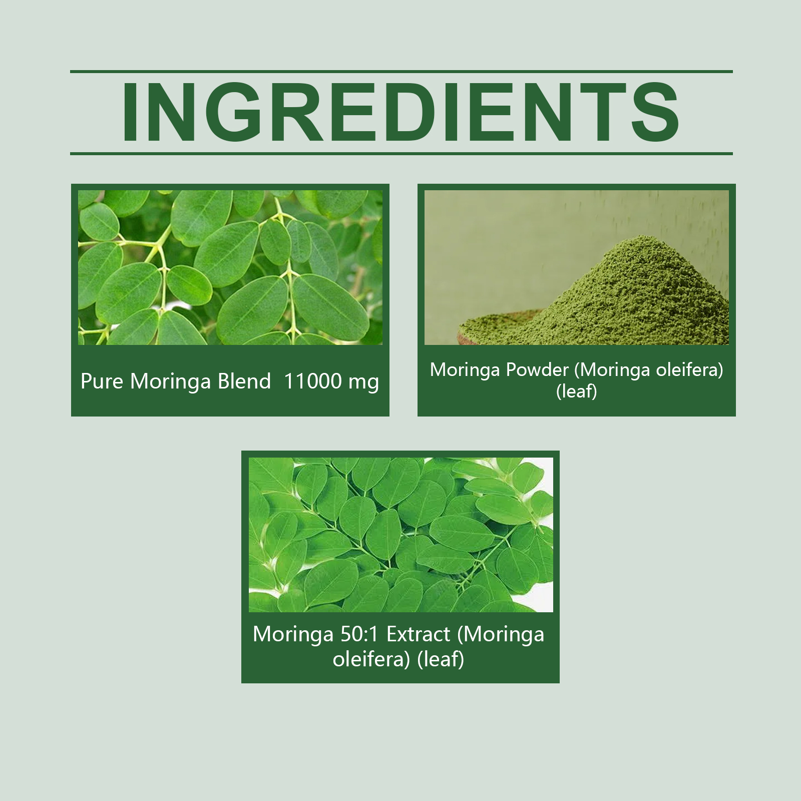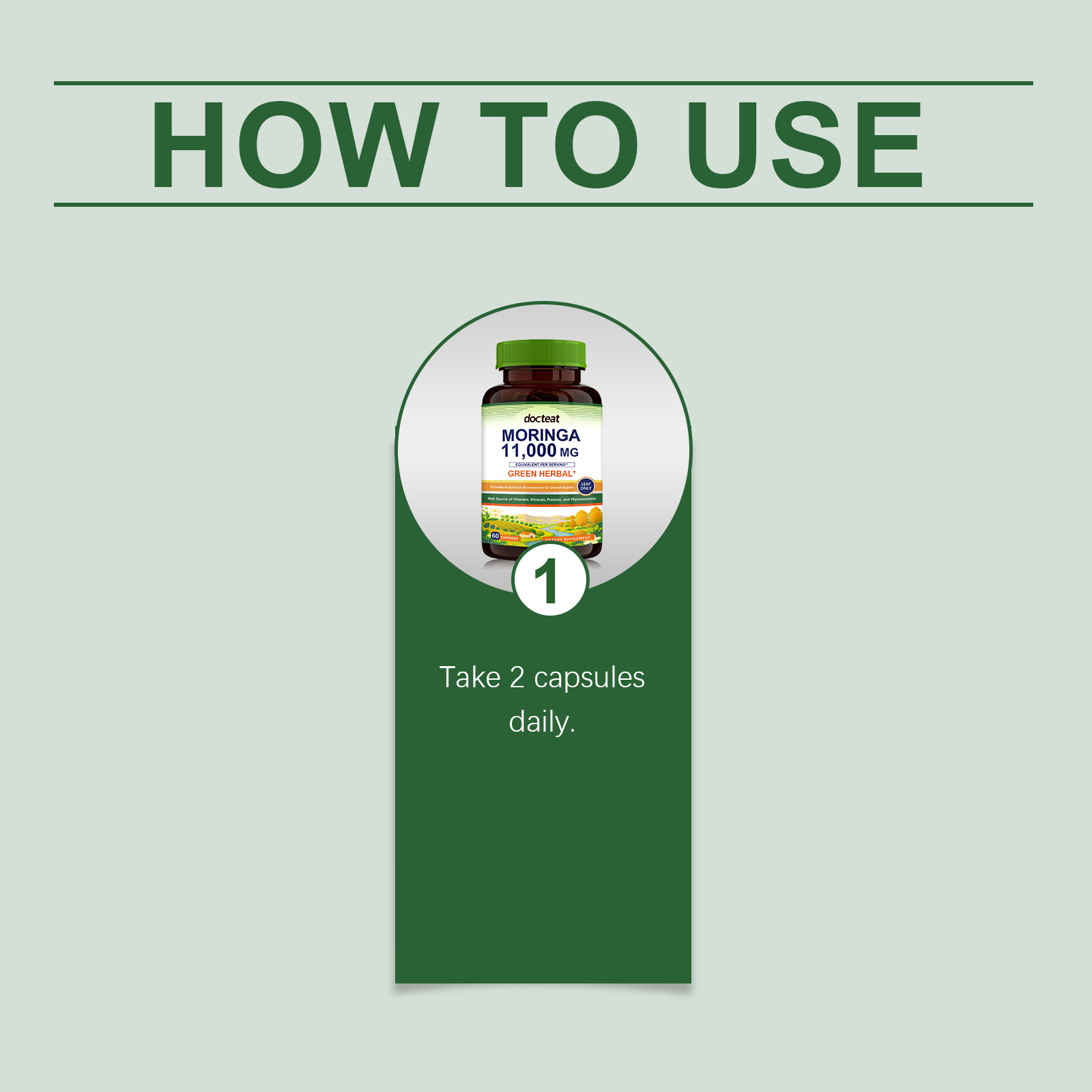 我们的辣木胶囊,由纯辣木混合物11000毫克、辣木粉(辣木叶)精心调配而成。专为方便快速,易于融入日常健康管理设计。使用方法极为便捷:每天服用2粒胶囊。并且可以促进日常营养平衡:满足身体需求,帮助缓解疲劳,恢复精力状态。