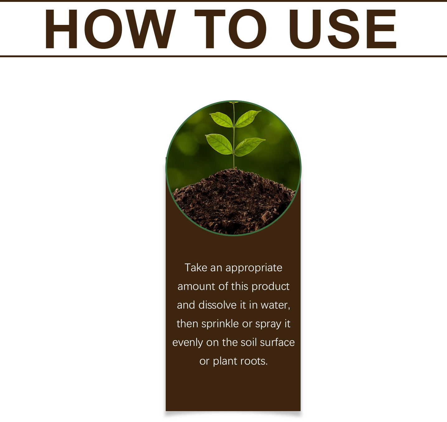 我们的土壤活化剂含有黄腐酸钾、微球接种剂。它可以生根促长,调酸抑碱,调色增甜,抗逆保水,改土固碳,提质增产。它的使用方法很简单:用勺子取一勺营养粉,溶解在水中或撒在植物土壤上即可。调节ph值,降低盐浓度,保水保肥。
