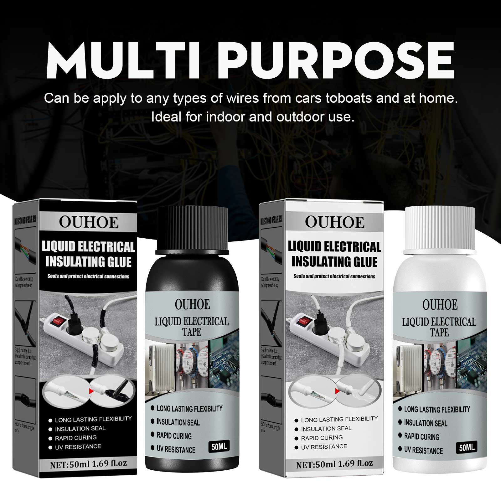 我们的液体电气绝缘胶(白色30ml)含有树脂、填料、固化剂。它可以持久柔韧,绝缘密封,快速固化,耐紫外线。它的使用方法很简单:切断电源,保持表面干燥。涂上胶水(可以用小刷子涂)。涂抹后等待风干。专业的处理你的破碎,劈裂和断裂的电线。