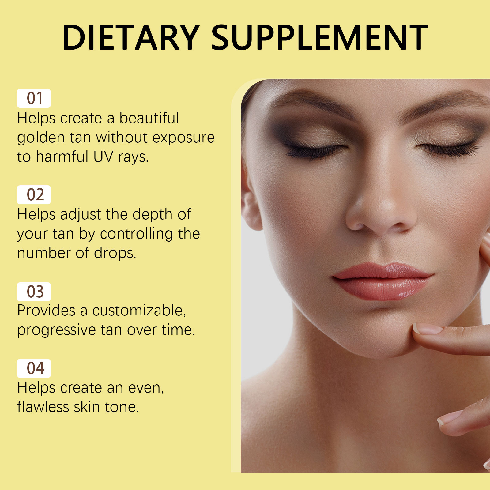 我们的美黑免晒滴剂(入口),由维生素A(如B-胡萝卜素)、L-酪氨酸精心调配而成。专为远离紫外线伤害,自定义你喜欢的肤色设计。使用方法极为便捷:请在服用前摇匀,每次1-2滴,每天1-2次。并且可以逐渐呈现理想的颜色。