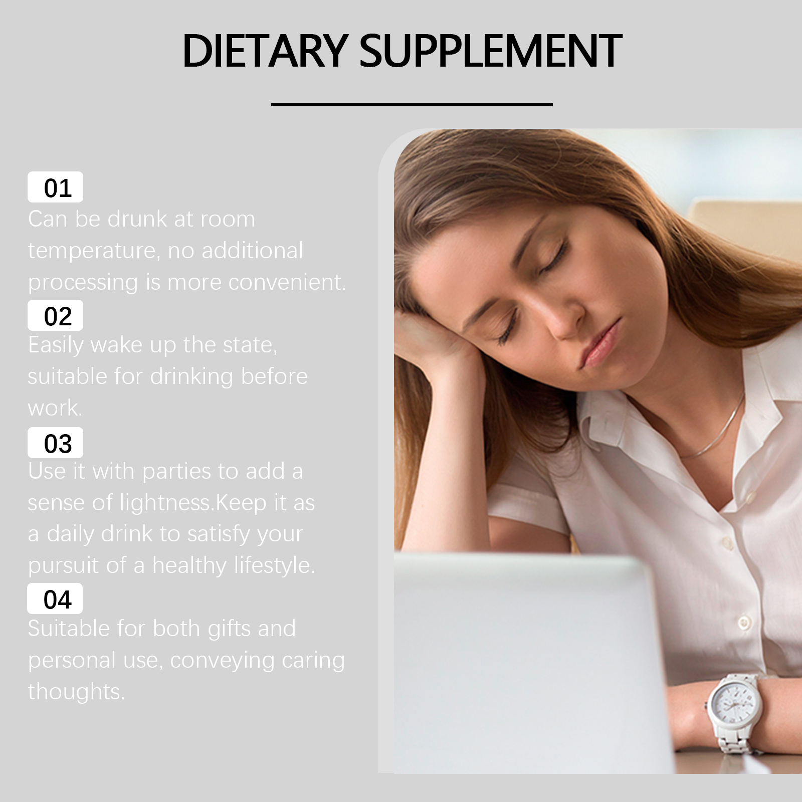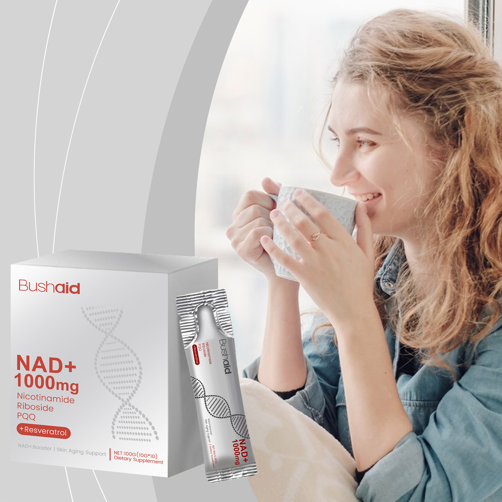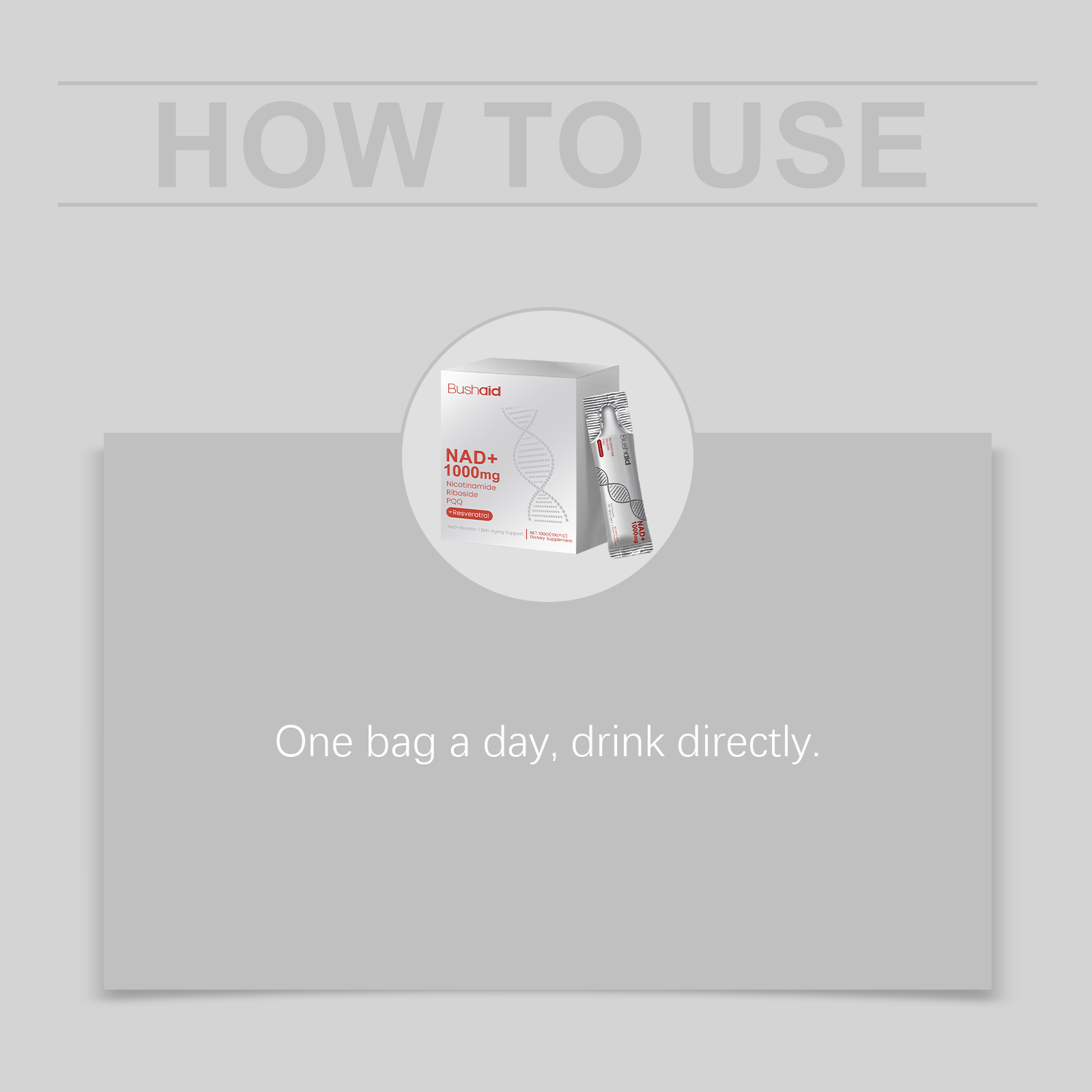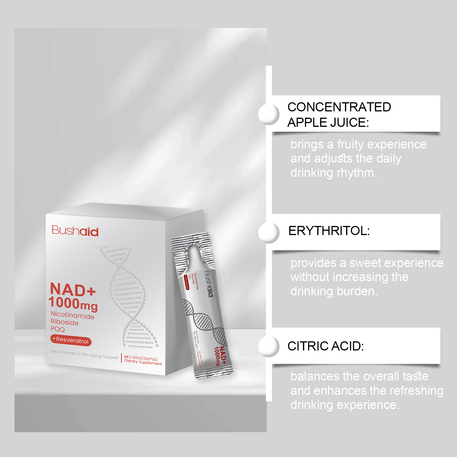 我们的抗衰饮(入口),由烟酰胺核苷、苹果酸氢盐经常调配而成。专为平衡日常节奏,激发轻盈和活力的感觉设计。使用方法极为便捷:每天一包,直接饮用。并且可以平衡整体口感,提升清爽的饮用体验。