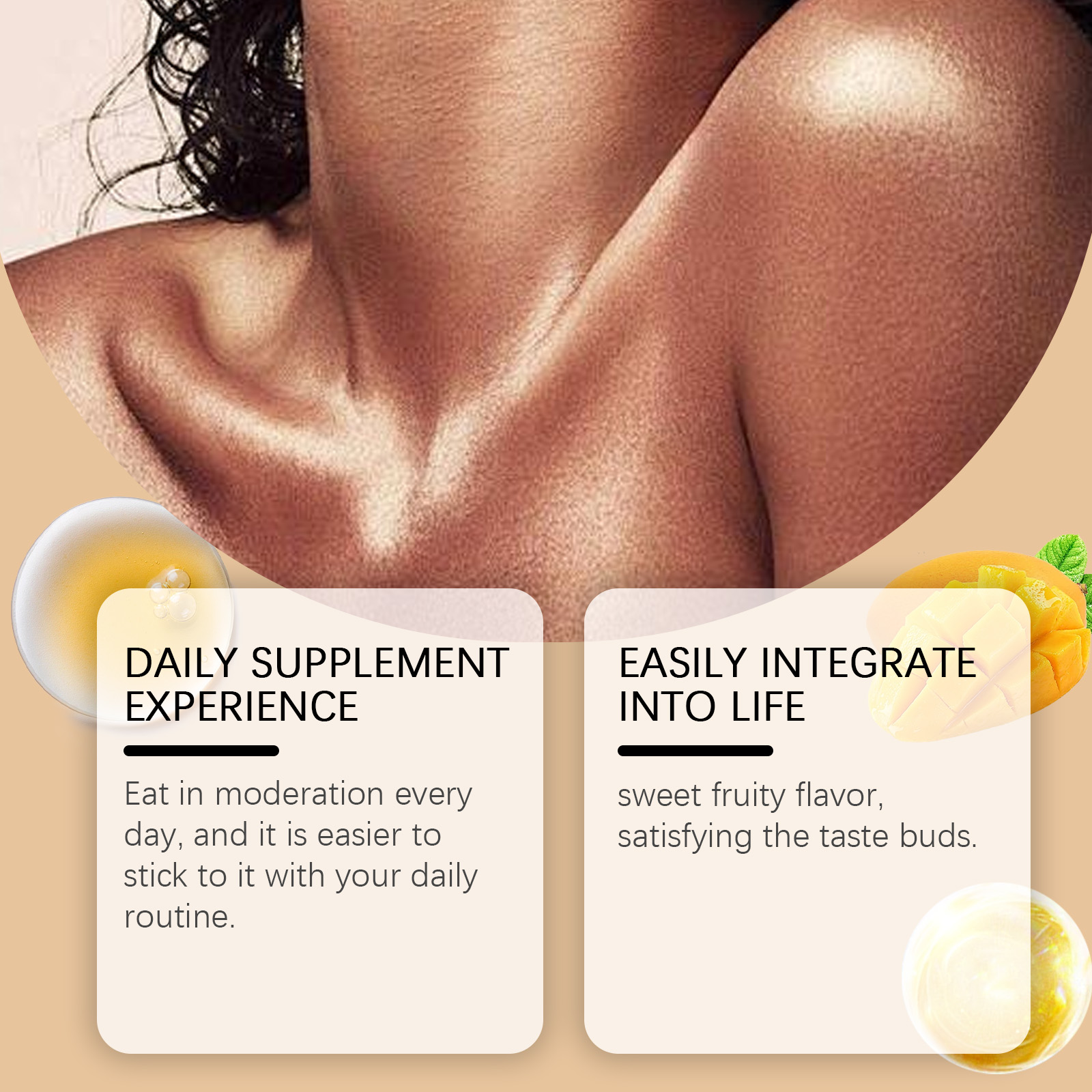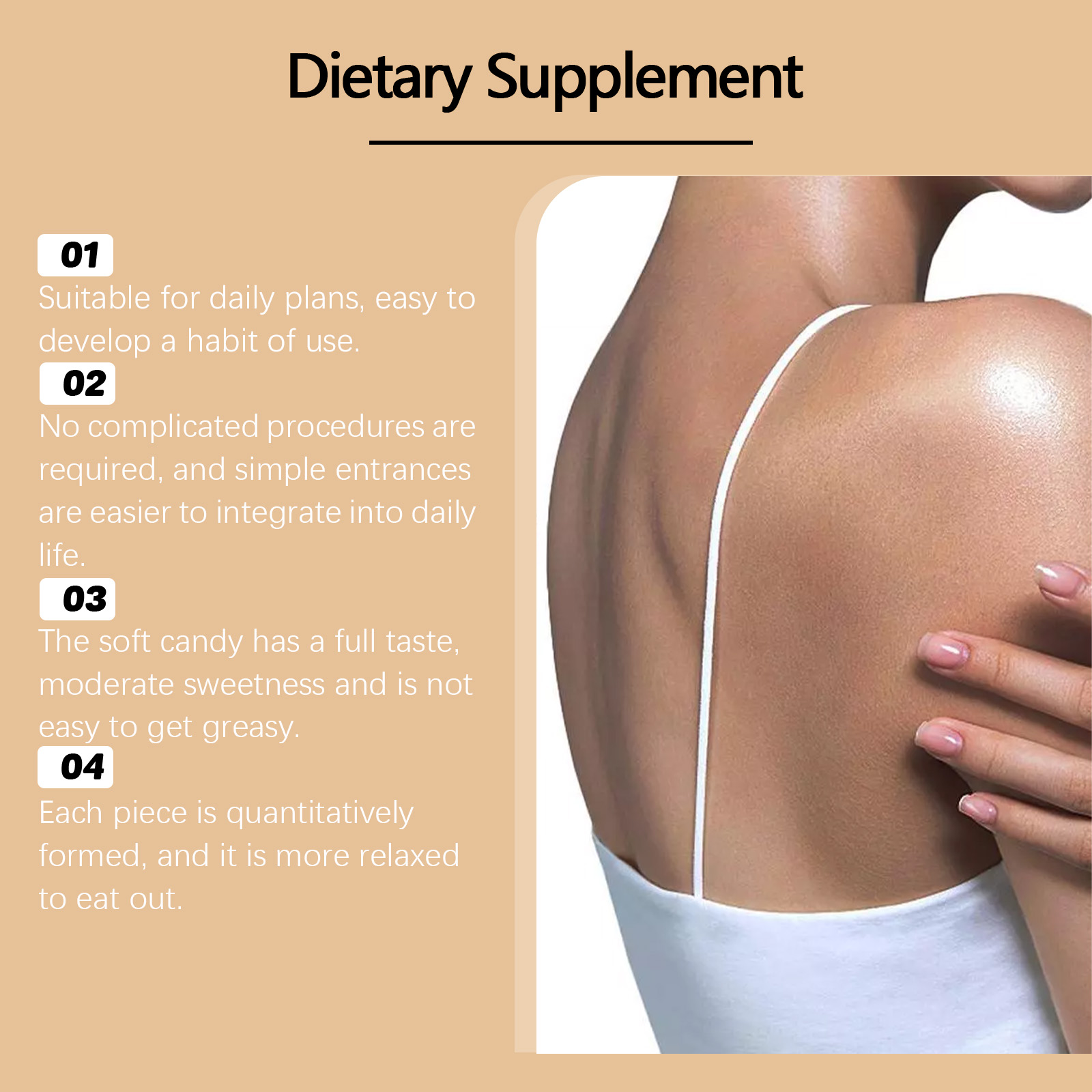 我们的美黑软糖-乳白盖,由卡路里 15、总碳水化合物精心调配而成。专为增加纹理的柔软度,改善整体咀嚼体验设计。使用方法极为便捷:每天服用2粒软糖。并且可以协调柔和色彩,适合拍照和分享。