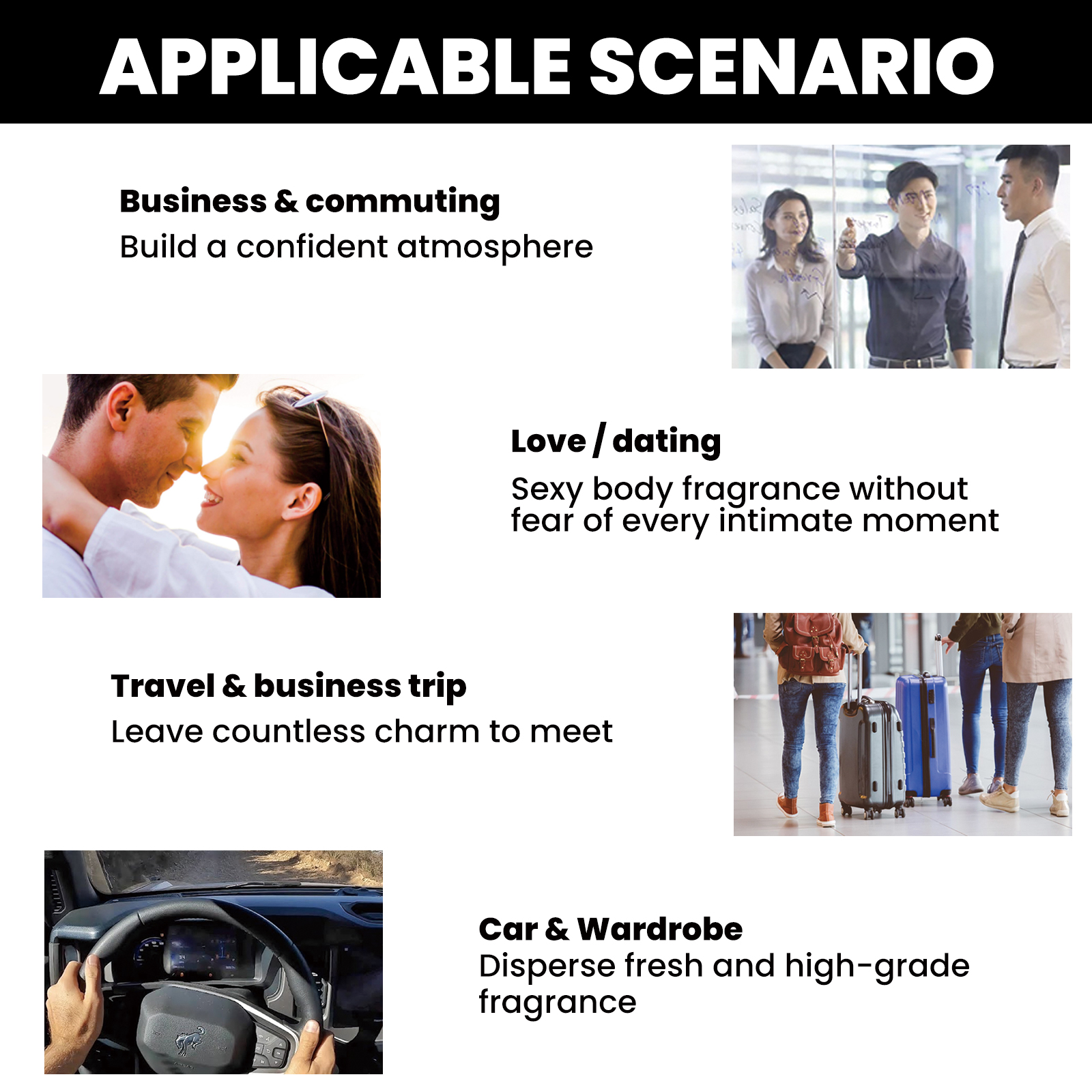 我们的固体香膏含有广霍香、茉莉花、白麝香。它可以增强自然信息素分泌,提升个人品味,赋予更多魅力,并帮助增强您的自信和魅力。它的使用方法很简单:首先在洁肤后,将除臭剂涂抹在腋下、胸部、耳后、脖子、手腕等部位。香味可以持续5到8个小时。使用后可以拥有持久的效果和香味,散发出属于你自己的独特香味,有效去除异味和汗味,清爽不油腻,不伤皮肤。