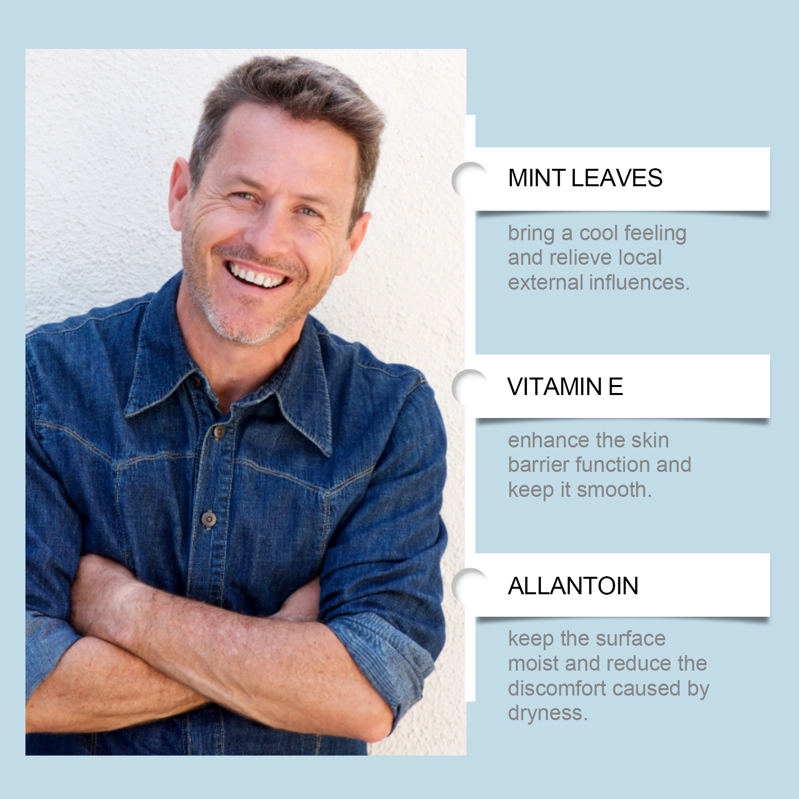 我们的男士护理霜,由甘油、矿油、甘油硬脂酸酯精心调配而成。专为缓解瘙痒、异味和不适;恢复皮肤屏障,镇静发炎的皮肤,缓解私密部位的不适症状,防止私密部位干燥和反复刺激设计。使用方法极为便捷:清洁私处并保持干燥。将适量本品均匀涂抹于私处。轻轻按摩直至吸收。并且它质地轻盈柔滑,使用过程中温和不刺激,简单实用的包装,随时随地都能轻松使用。