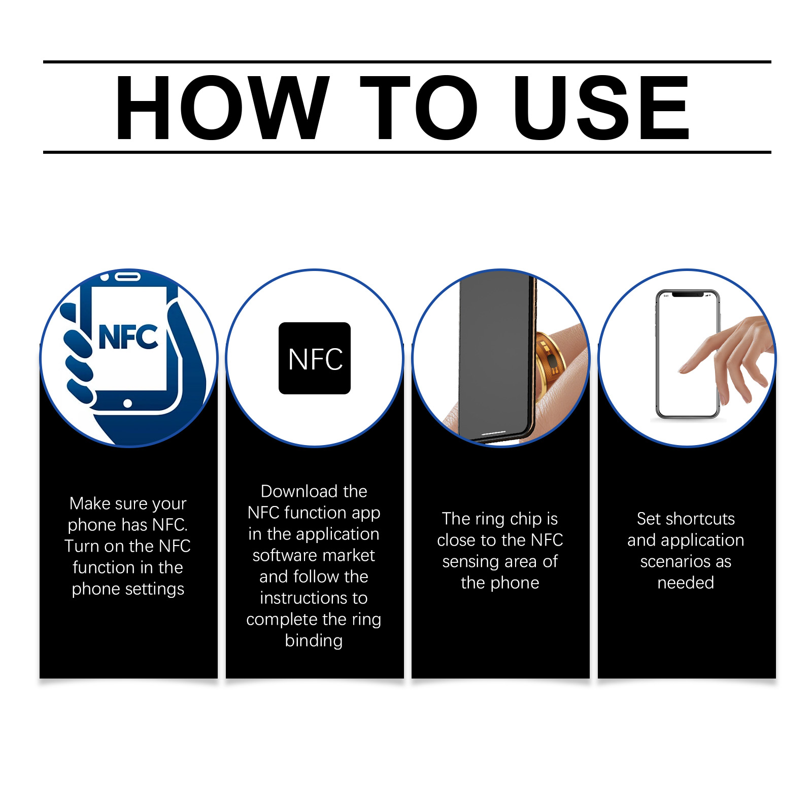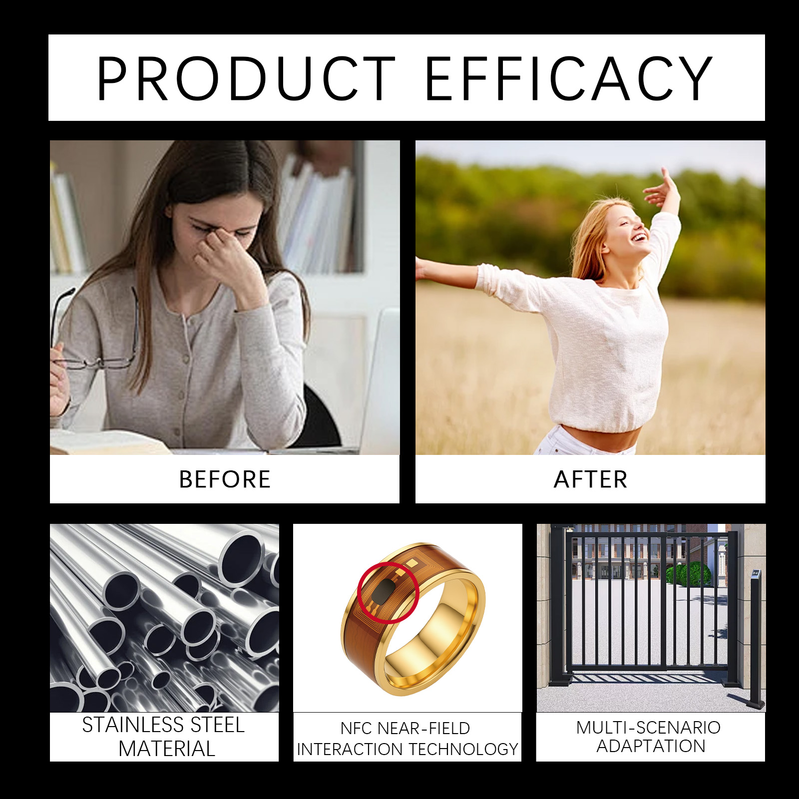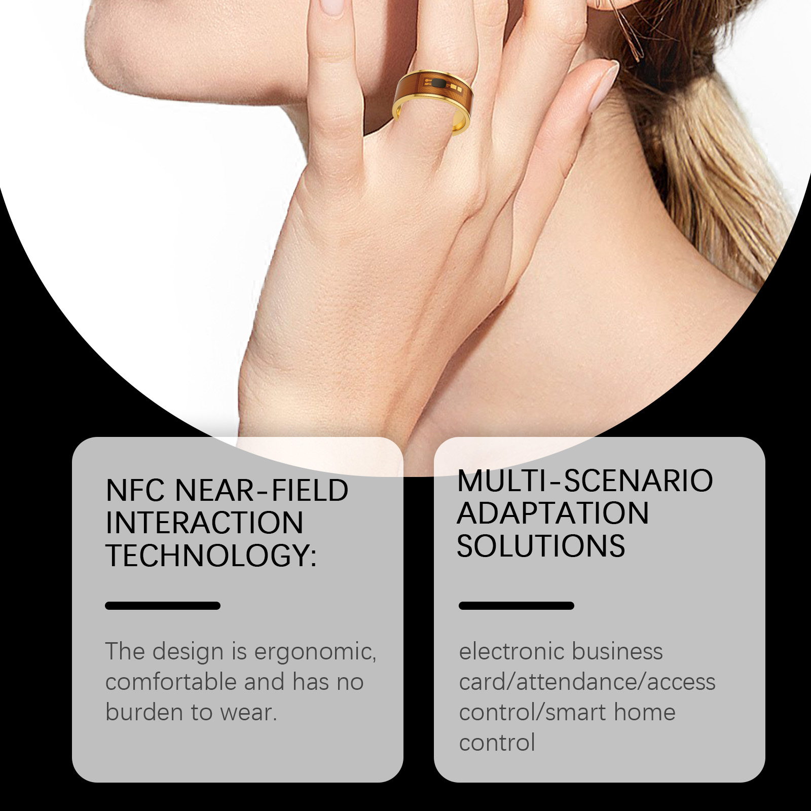 我们的戒指,由不锈钢精心调配而成。专为适应智能门禁/考勤系统互连设计。使用方法极为便捷:确保您的手机有NFC功能。在手机设置中打开NFC功能。在应用软件市场下载NFC功能app,按照说明完成戒指绑定,戒指芯片靠近手机的NFC感应区。并且可以根据需要设置快捷方式和应用程序场景。设计符合人体工程学,舒适,佩戴无负担。电子名片/考勤/门禁/智能家居控制。