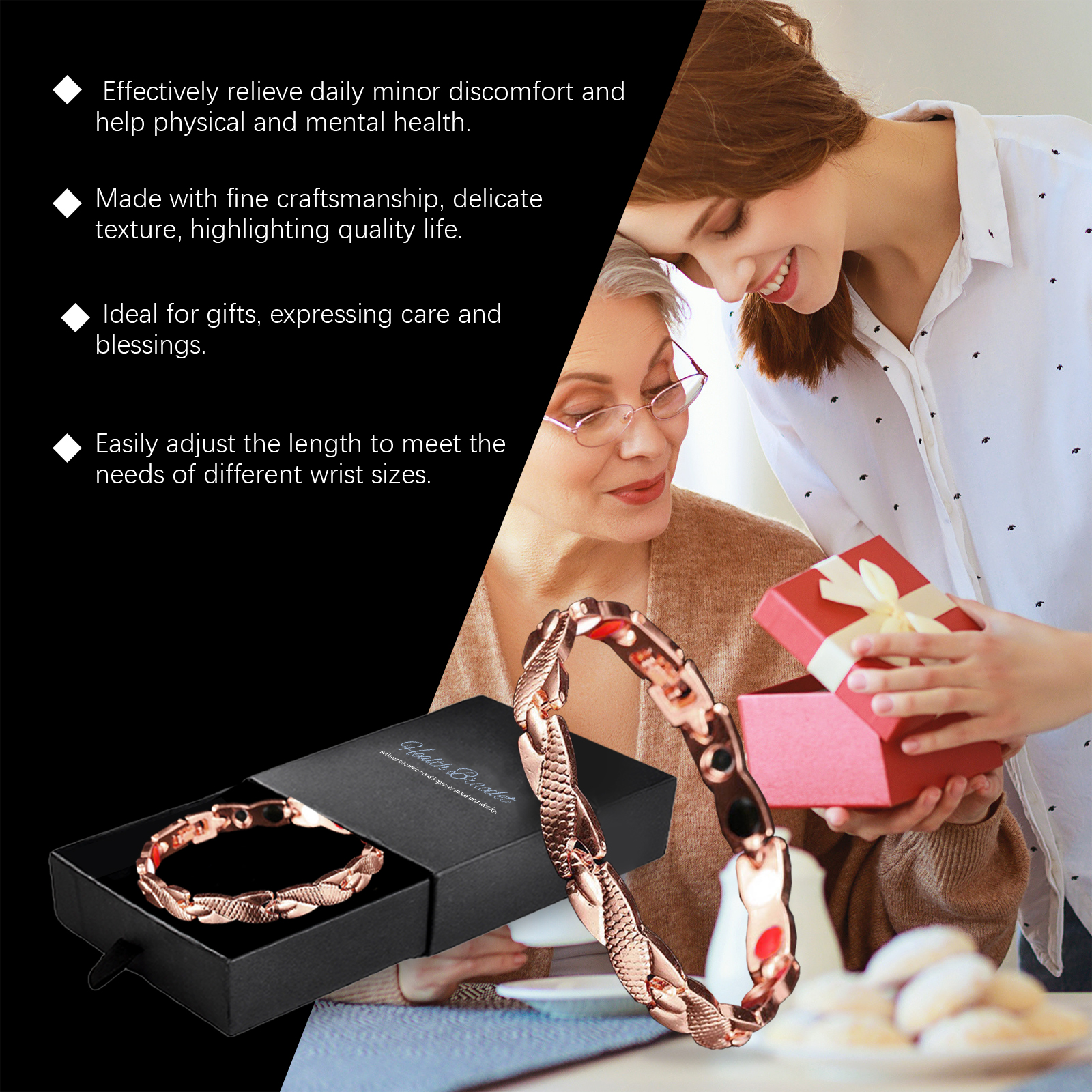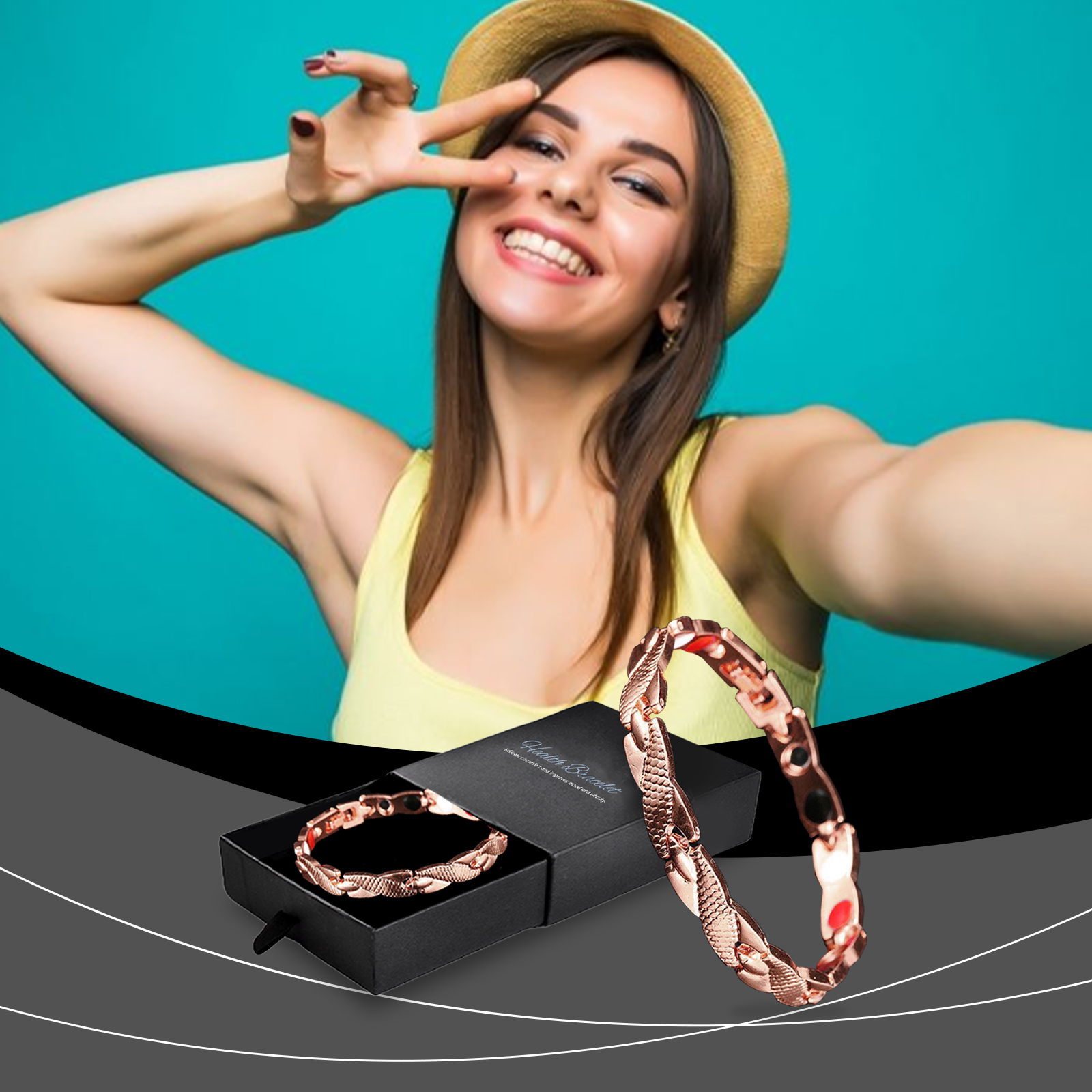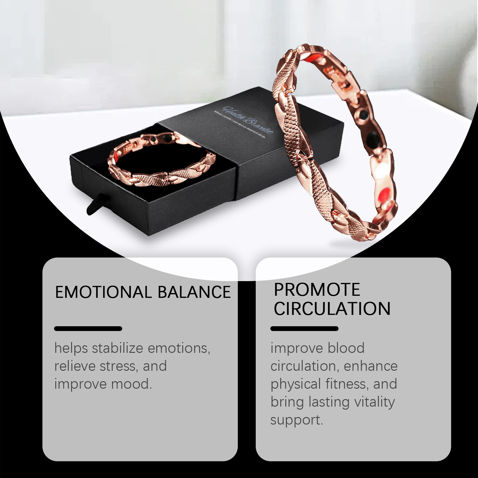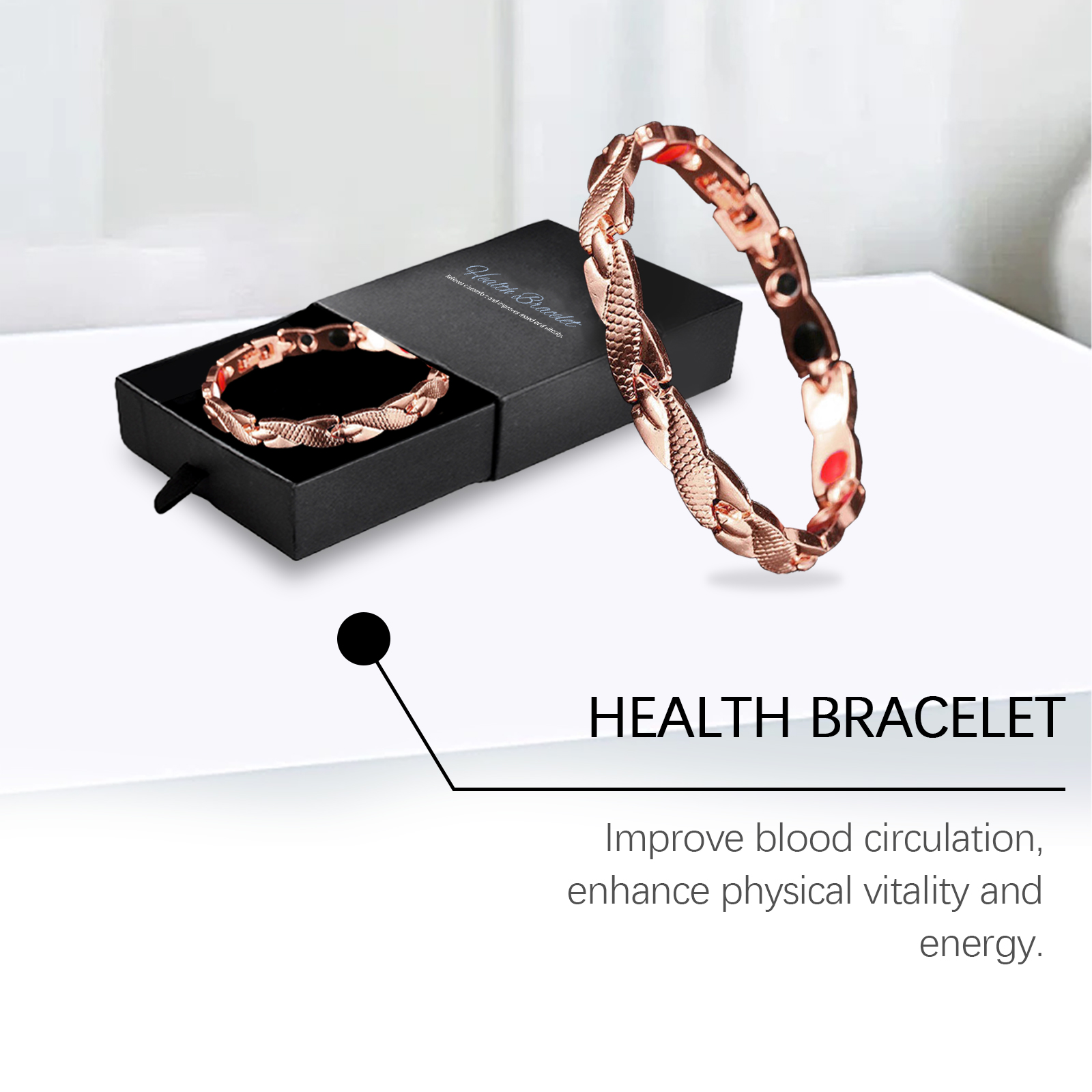 我们的健康表扣式手链,由锌合金精心调配而成。专为帮助稳定情绪,缓解压力,改善心情设计。使用方法极为便捷:只需将手链戴在手腕上。并且可以改善血液循环,增强身体素质,并带来持久的活力支持。