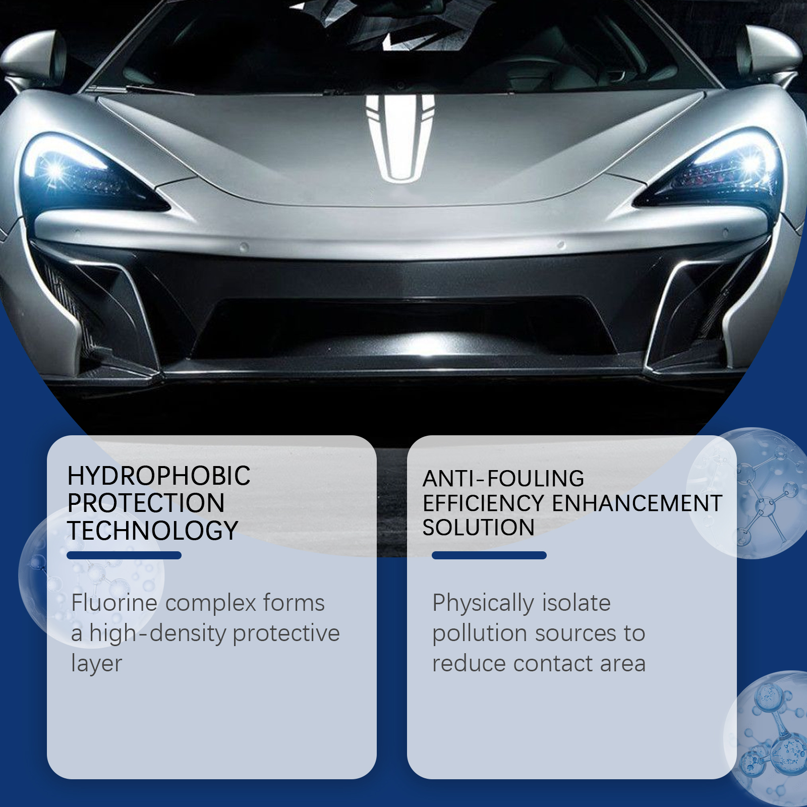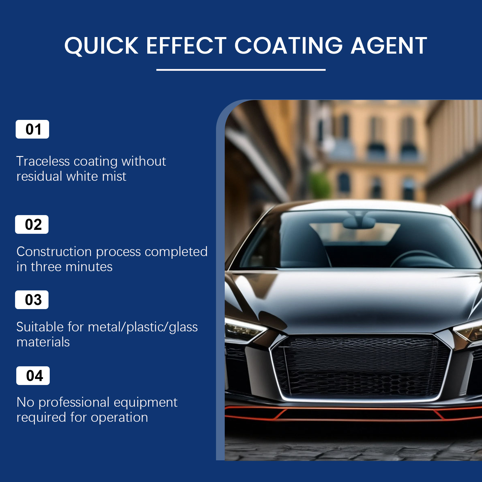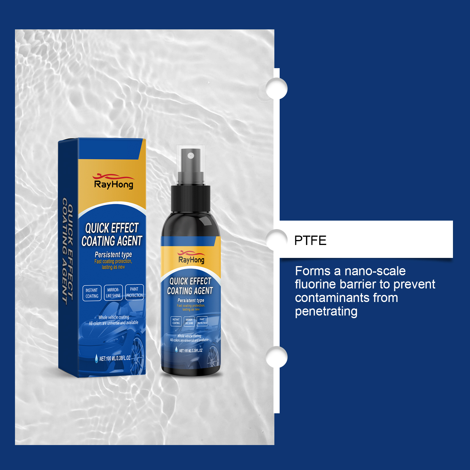 我们的汽车镀膜喷雾,由去离子水、聚四氟乙烯精心调配而成。专为协助减少油漆氧化、侵蚀等问题设计。使用方法极为便捷:清洁车身后彻底擦干,距离表面20厘米均匀喷洒,用软布快速擦拭,并以圆圈方式抛光,静置30分钟,使其完全形成薄膜。并且可以形成纳米级氟化物屏障,防止污染物渗透。