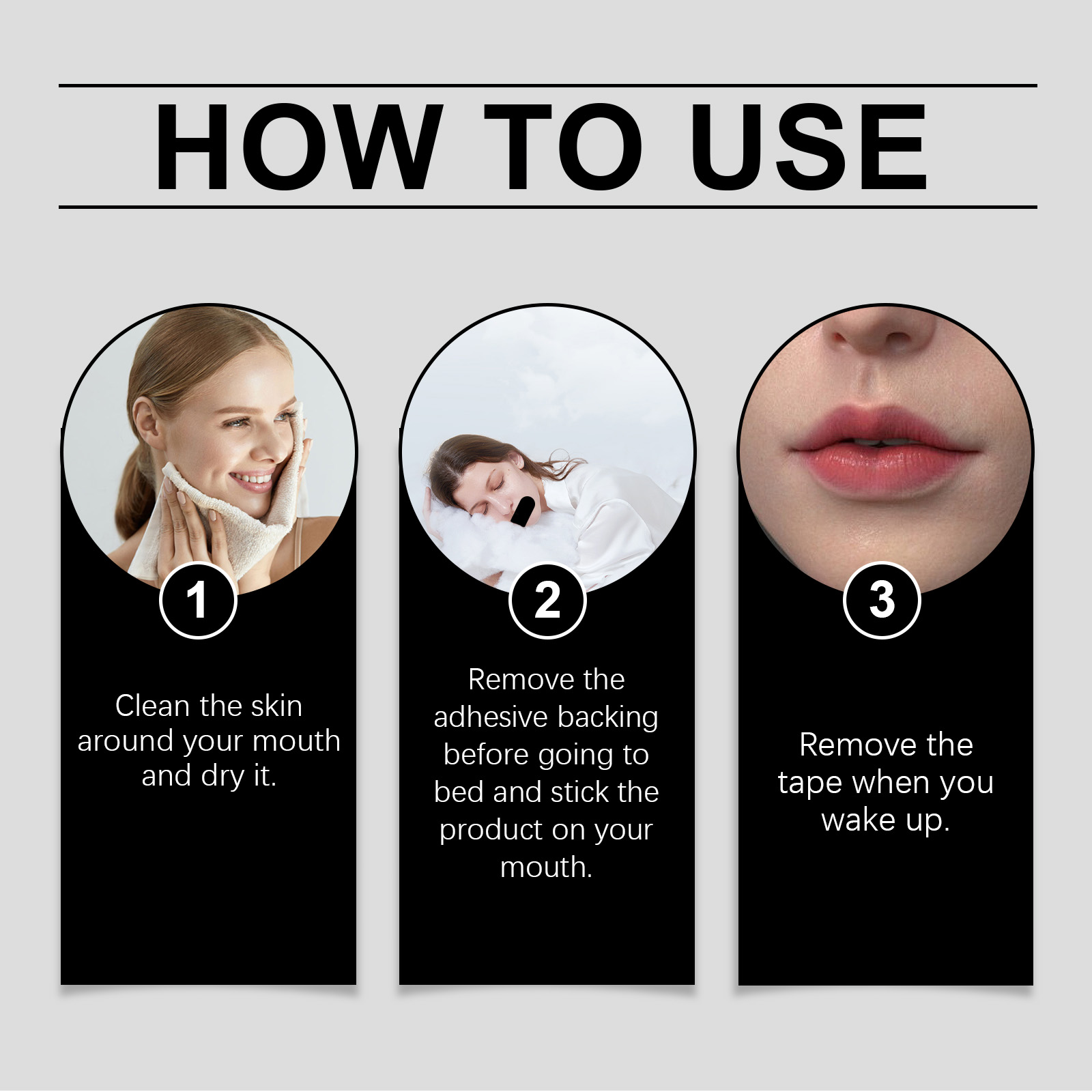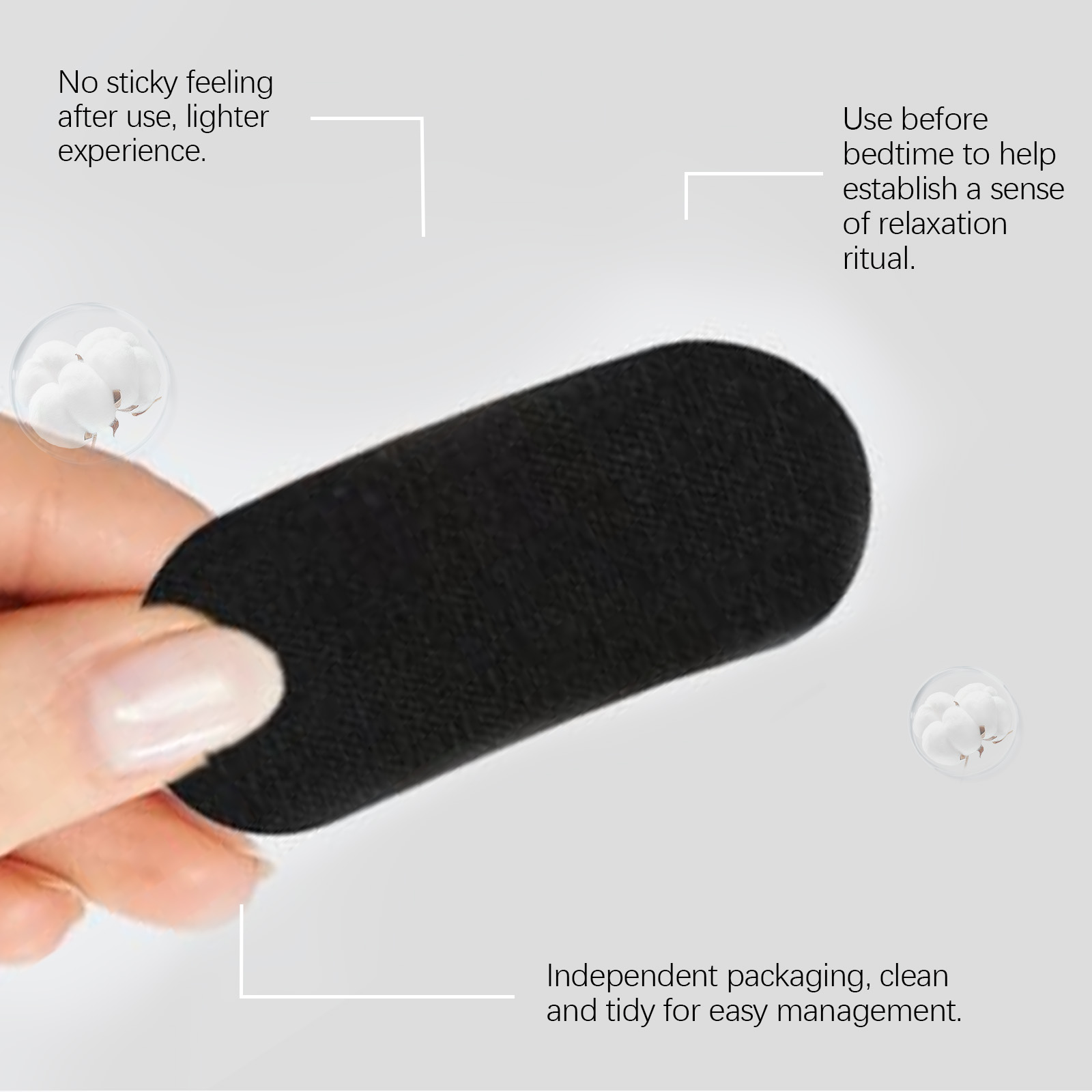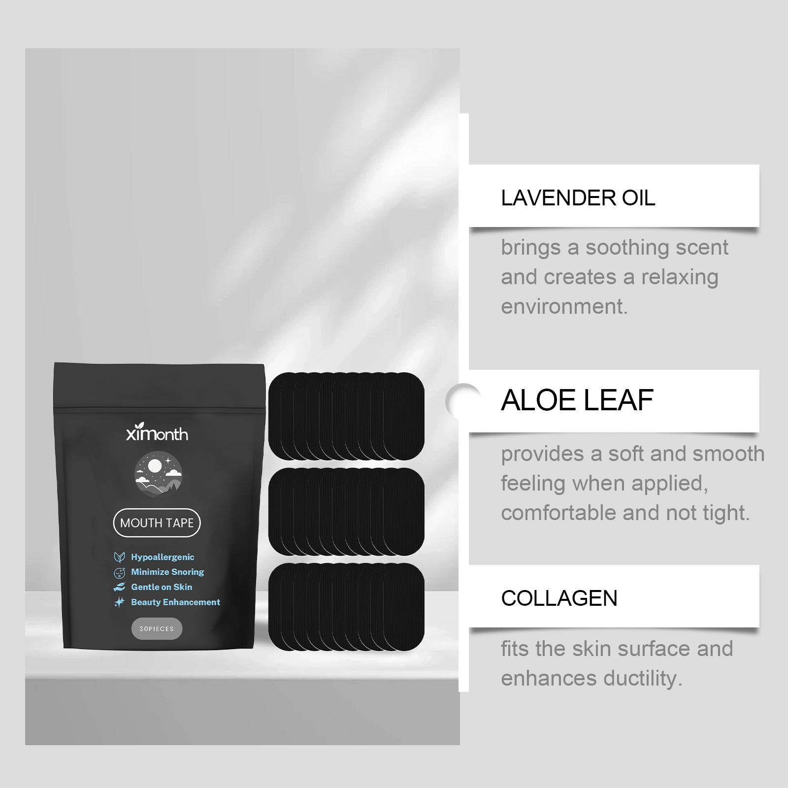 我们的止鼾睡眠贴,由维生素E、薰衣草油精心调配而成。专为有效减少打鼾,改善睡眠质量,能促进鼻腔呼吸,减少口腔有害物质的滋生;附着力强,保证睡眠安稳设计。使用方法极为便捷:清洁口腔周围的皮肤并擦干。睡前取下粘性背衬,然后将产品贴在嘴巴,醒来后取下胶带即可。并且可以帮助营造轻松的睡眠氛围,易于使用且贴合稳定。