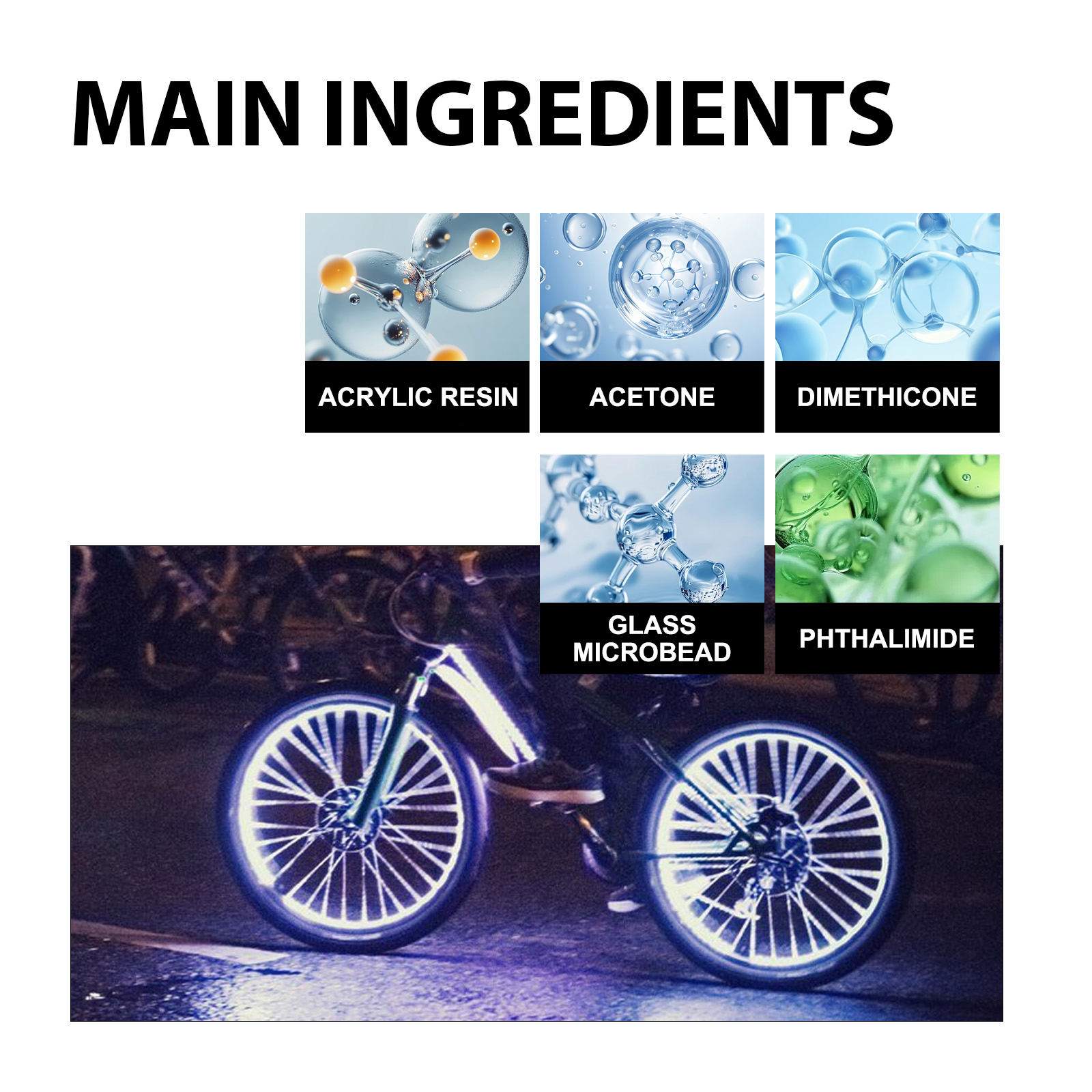 我们的夜间反光喷雾含有邻苯二甲酰亚胺、聚二甲基硅氧烷。它可以通过夜间反光,防止夜间出行危险,不会损坏基材,并确保物品的外观和颜色不会改变。它的使用方法很简单:清洗待喷物品表面的油污、灰尘和水,摇匀喷雾,在距物体表面20-30厘米处均匀喷洒即可,可以夜光警示,防止夜间出行危险。