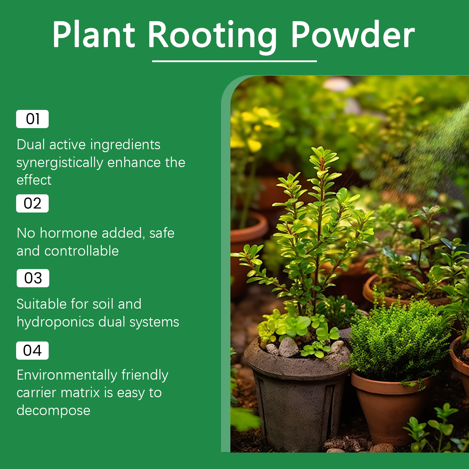 我们的生根粉,由滑石粉、吲哚丁酸精心调配而成。专为促进植物毛细根的分化和生长设计。使用方法极为便捷:使用随附的铲子将生根粉与水混合,然后将溶液倒入植物根部周围的土壤中。并且它含有吲哚丁酸和萘乙酸,可以协同促进主根发育,增强植物对干旱、洪水和温度差异的适应性。
