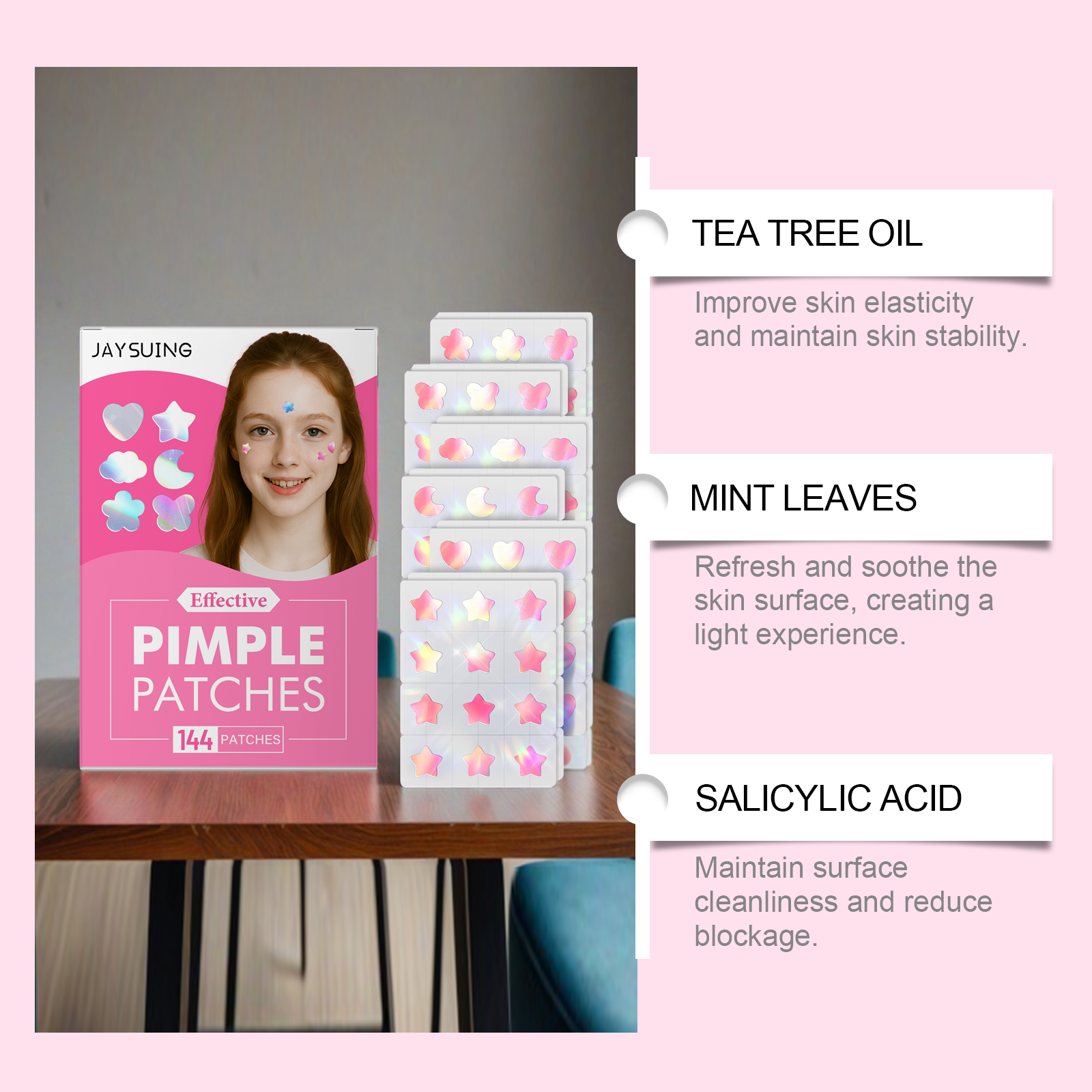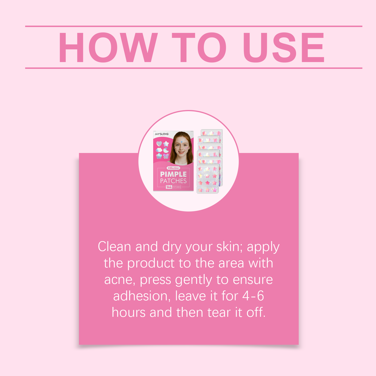 我们的粉色青春痘痘贴,由尿囊素、水杨酸、乙二胺四乙酸二钠精心调配而成。专为刷新并舒缓肌肤表面创造轻盈体验设计。使用方法极为便捷:清洁并干燥皮肤,将产品贴在痘痘区域,轻轻按压以确保粘附,放置4-6小时然后撕下。并且可以改善皮肤弹性和保持皮肤稳定性。