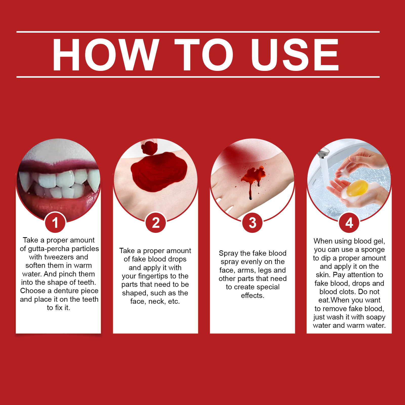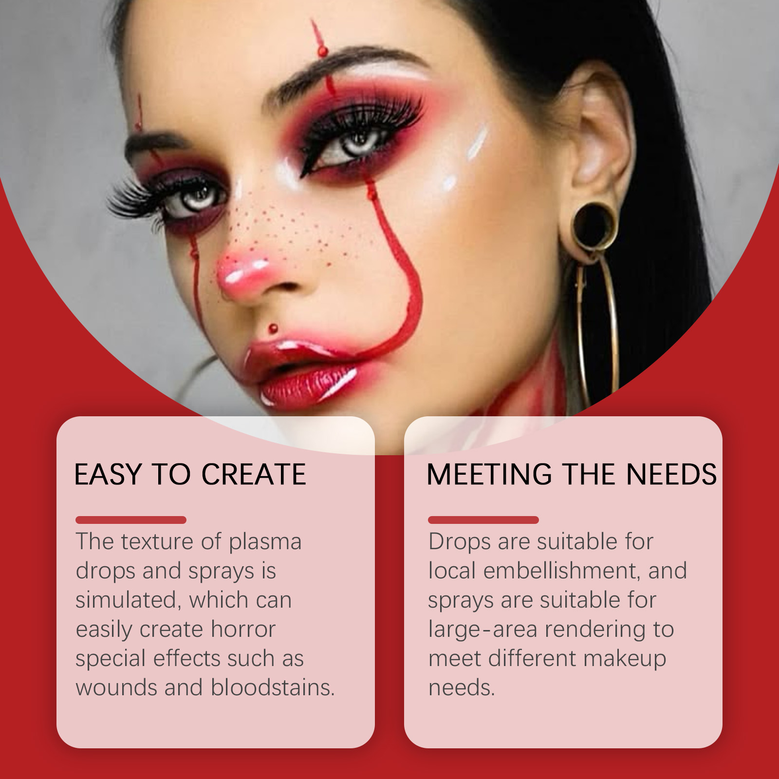 我们的万圣节假血套装,由血浆滴剂:羟乙基纤维素、1,2-己二醇,血浆喷雾:焦糖色、1,2-己二醇,血块:焦糖色、羟乙基纤维素精心调配而成。专为万圣节、角色扮演、舞台表演和其他场合,以创造令人惊叹的视觉效果设计。使用方法极为便捷:用镊子取适量的牙胶颗粒,在温水中软化。然后捏成牙齿的形状。选择一副假牙片,并将其放在牙齿上固定。取适量的血浆滴剂,用指尖将其涂抹在需要塑形的部位,如面部、颈部等。将血浆喷雾均匀喷在需要创造特殊效果的面部、手臂、腿部和其他部位。在使用假血块时,可以用海绵蘸取适量涂抹在皮肤上。注意假血、滴血和血块不能入口。当你想要去除假血时,只需用肥皂水和温水清洗即可。并且它模拟了等离子体滴和喷雾的纹理,可以轻松创建伤口和血迹等恐怖特效。滴剂适用于局部修饰,而喷雾剂适用于大面积渲染,以满足不同的化妆需求。